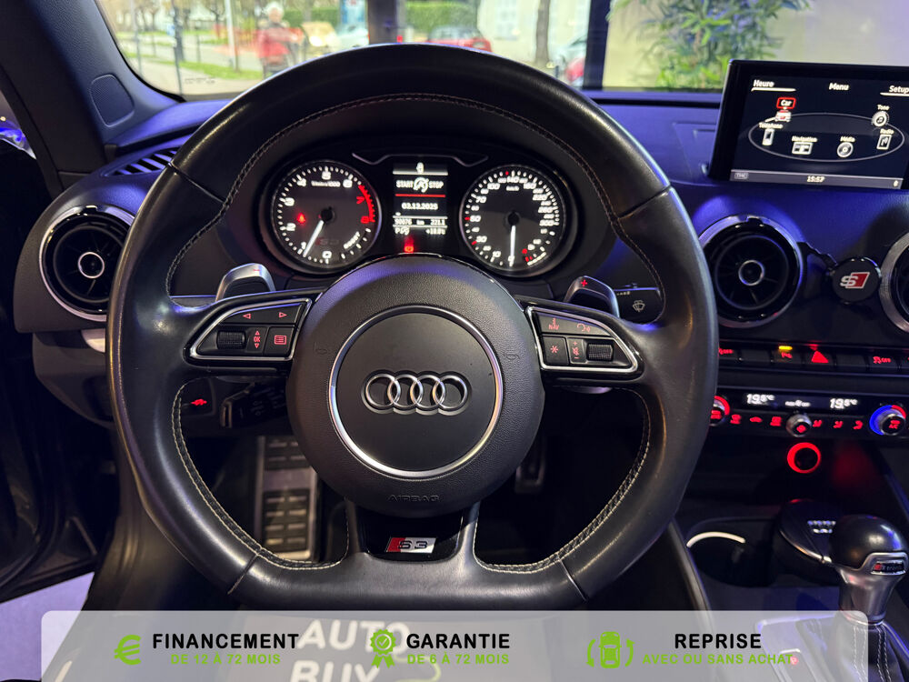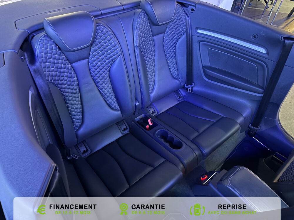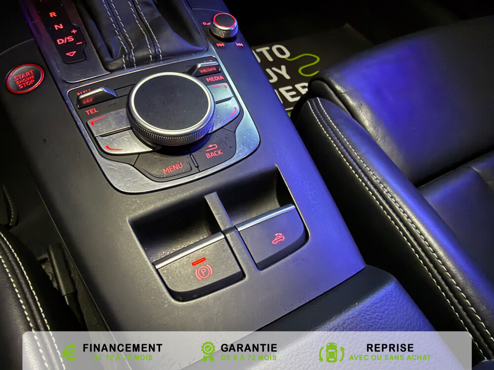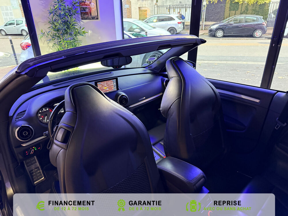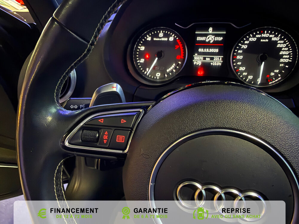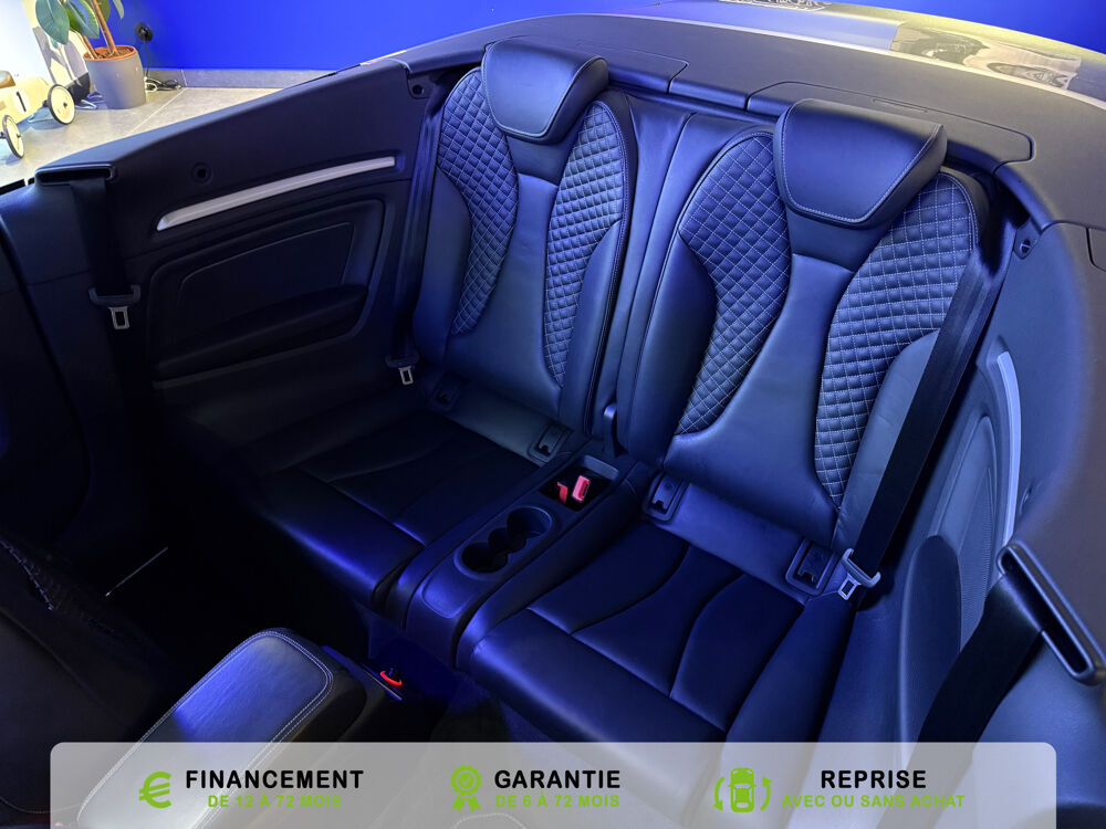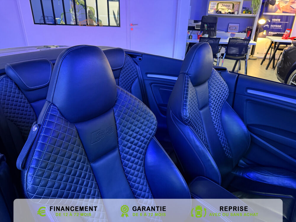 Equipements supplémentaires : Acces confort : fonction etendue de basculement des sieges AV permettant un acces facile aux, Accoudoir central AV avec vide-poches relevable et inclinaison reglable et coulissant en longueur, Airbag de genoux cote conducteur, Airbags grand volume conducteur et passager AV, Airbags lateraux AV integres aux dossiers des sieges, Alarme antivol avec protection antiremorquage par capteur dangle dinclinaison (desactivable),, Allume-cigare et cendrier amovible, couvercle chrome avec anneaux Audi,, Antipatinage electronique ASR, Applications decoratives sur les contre-portes et tableau de bord Aluminium brosse mat, Audi Drive Select (Permet le reglage du mode de conduite), Audi Parking System : facilite le stationnement a l'aide d'un signal sonore indiquant la distance AR, Audi Premium Tracking System, Audi Sound System avec 9HP dont un central dans le tableau de bord et subwoofer dans le logement de, Becquet AR S3 laque dans la couleur de la carrosserie, Blocage electronique de differentiel EDS, Boite a gants grand volume cote passager AV eclairee, Calandre Audi Singleframe gris platine avec entretoises horizontales et anneaux Audi chromees, Capote entierement automatique en noir en tissu isolant 3 couches. La capote souvre et se ferme par, Carrosserie entierement galvanisee contre la corrosion, Ceintures de securite 3 points automatiques pour toutes les places, pretensionneurs pyrotechniques,, Chassis Sport S surbaisse de 25 mm, avec suspensions et amortisseurs plus fermes, Ciel de pavillon en tissu noir, Climatisation automatique Confort avec reglage asservi a la position du soleil, regulation, Controle de ceinture attache pour toutes les places, un signal acoustique et visuel a l'AV previent, Controle de pression des pneumatiques, Controle electronique de stabilisation (ESC) desactivable, avec amplificateur hydraulique de, Detecteur de pluie et de luminosite avec bande grise sur la partie superieure du pare-brise,, Direction progressive contribuant a une augmentation de la dynamique de conduite, Dossier banquette AR rabattables en deux parties 50/50, Ecrous de roues antivol (ne s'enlevent qu'avec l'adaptateur fourni), Feux AR avec feux de recul blancs et feux AR de brouillard incluant 3eme feu stop sureleve et, Feux de freinage adaptatifs, les feux de detresse clignotent en cas de freinage d'urgence afin de, Feux de route assistes: gestion automatique du passage de feux de croisement a feux de route, Filet anti-remous, Fixation pour sieges enfants ISOFIX et Top Tether pour les places exterieures AR, Fixations pour sieges enfants norme ISOFIX aux places exterieures AR, Identification du modele /technologie sur le capot de coffre, sur demande sans indentification du, Inscription S3 sur la calandre, le capot de coffre, les baguettes des seuils de portes, les etriers, Lave-essuie-glace 2 vitesses, 4 intervalles de balayage reglables, commande de balayage coup par, Leve-vitres electriques AV et AR avec protection anti-pincement et fonction Confort, Logement de capote a configuration variable, avec caisson de capote abaissable automatiquement, Lunette AR degivrante avec minuterie, Miroir de courtoisie cote conducteur et passager AV, MMI GPS Plus avec donnees de navigation sur carte SD, Oeilletons de fixation, 4 dans le coffre, pour maintenir les bagages et objets, points de fixation, Outillage de bord dans le coffre incluant un cric, Pack Aluminium Exterieur, Pack Aluminium Exterieur: Encadrement des vitres laterales et baguettes sur les appuis de vitres en, Pack Aluminium Interieur, Pack Aluminium Interieur: sur les diffuseurs d'air, la boite a gants, le bouton de reglage des, Pack Eclairage, Pack Eclairage : eclairage anti-eblouissant de linterieur du vehicule incluant, Pack Eclairage Interieur, Pack Rangement et coffre, Pare-brise acoustique ameliore l'isolation phonique du pare brise et reduit les bruits exterieurs, Pare-chocs couleur carrosserie, Pare-chocs laques dans la couleur de carrosserie avec prises d'air laterales accentuees, extension, Pedalier en acier inoxydable brosse, Poignees de maintien avec mecanisme amortisseur, 4 poignees rabattables encastrees dans le ciel de p, Preparation pour telephone portable (Bluetooth) commande sur volant multifonction mains libres et, Prise 12 V supplementaire incluant allume-cigare et cendrier sous la console centrale, Protection antidemarrage electronique, integree a la gestion du moteur, activation automatique par, Protection laterale anticollision avec barres extremement rigides dans les portieres et une, Quattro: