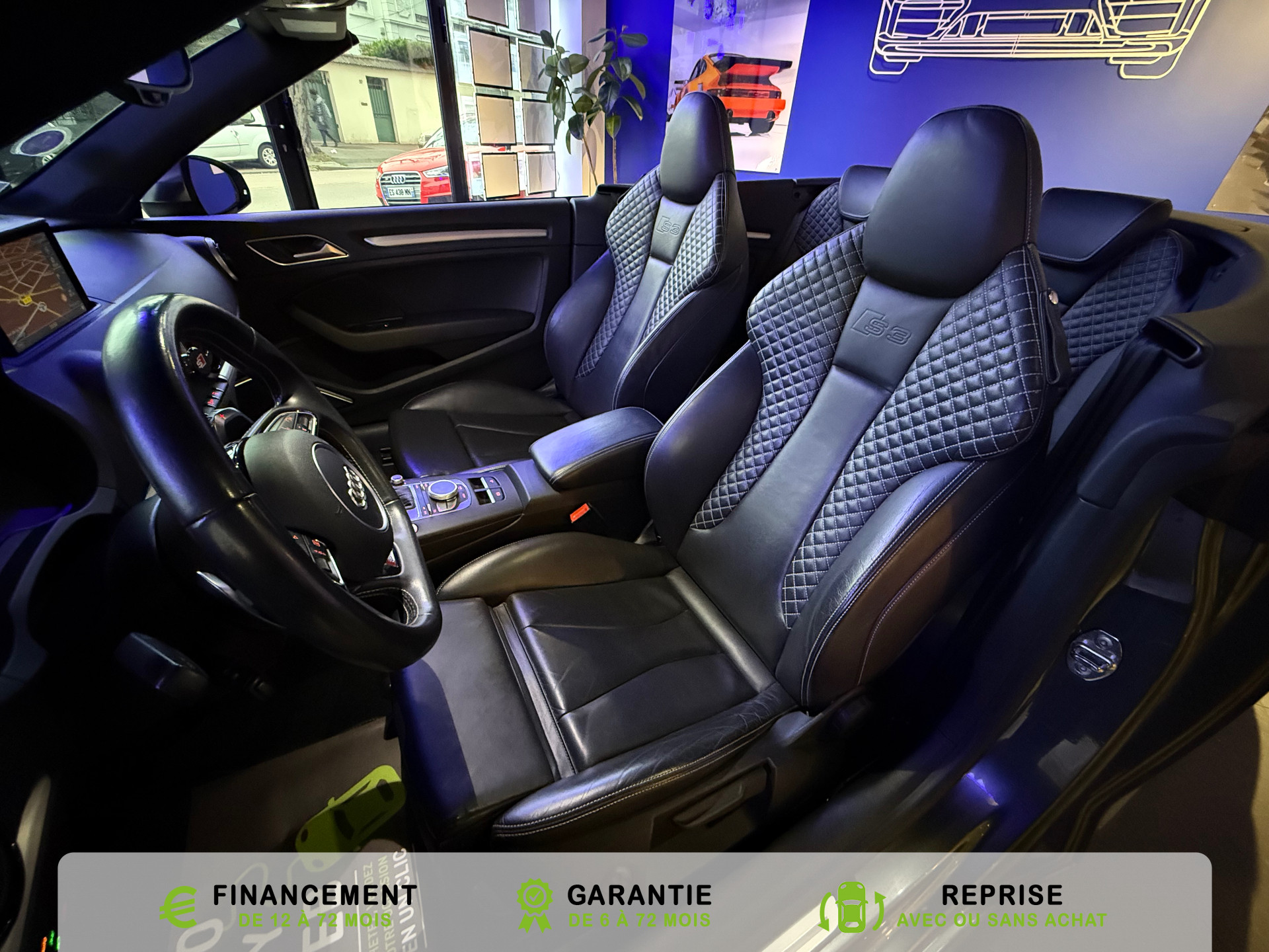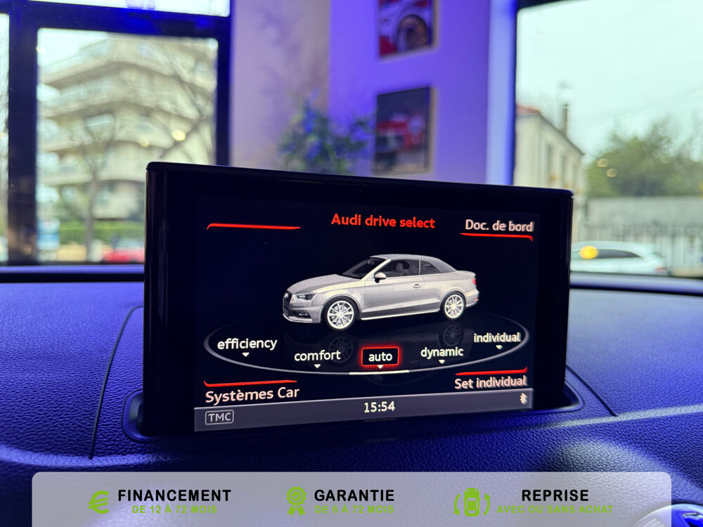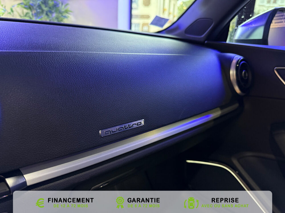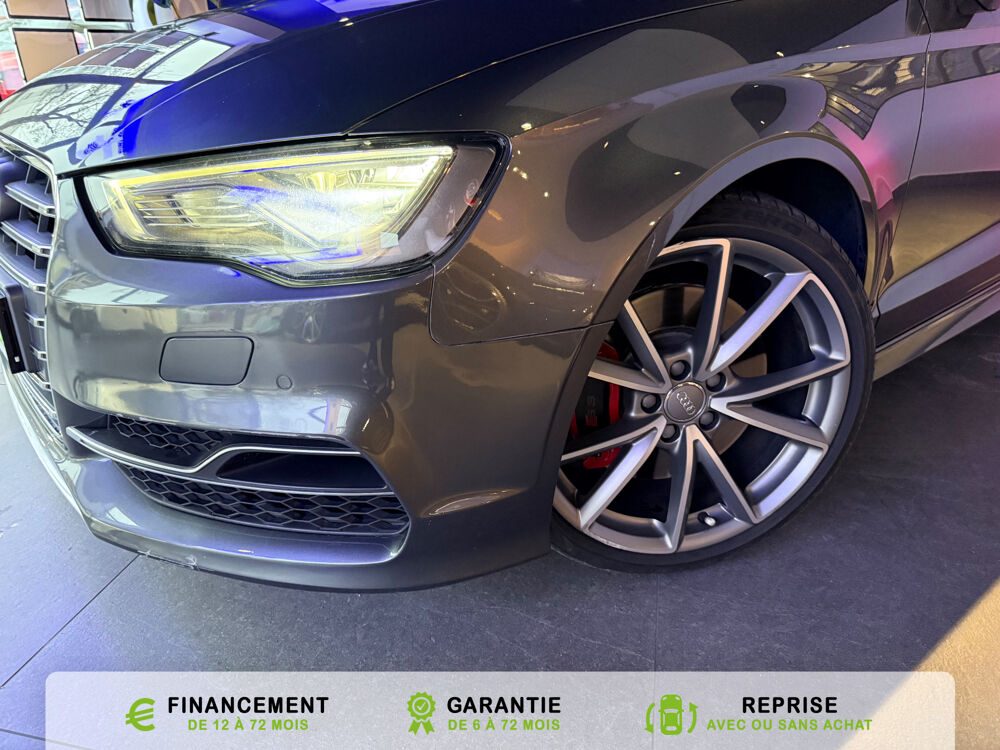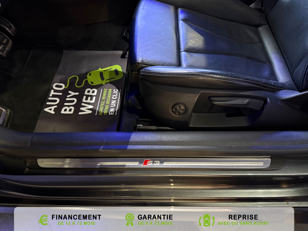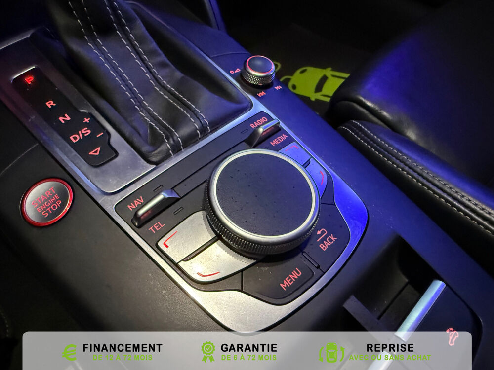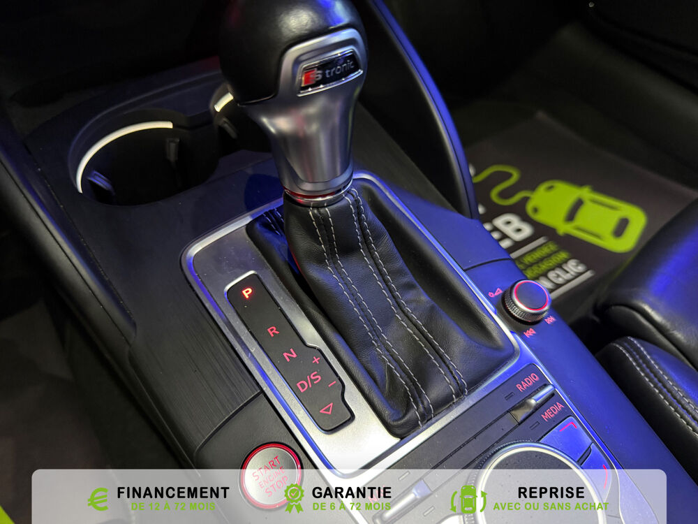 Equipements supplémentaires : Acces confort : fonction etendue de basculement des sieges AV permettant un acces facile aux, Accoudoir central AV avec vide-poches relevable et inclinaison reglable et coulissant en longueur, Airbag de genoux cote conducteur, Airbags grand volume conducteur et passager AV, Airbags lateraux AV integres aux dossiers des sieges, Alarme antivol avec protection antiremorquage par capteur dangle dinclinaison (desactivable),, Allume-cigare et cendrier amovible, couvercle chrome avec anneaux Audi,, Antipatinage electronique ASR, Applications decoratives sur les contre-portes et tableau de bord Aluminium brosse mat, Audi Drive Select (Permet le reglage du mode de conduite), Audi Parking System : facilite le stationnement a l'aide d'un signal sonore indiquant la distance AR, Audi Premium Tracking System, Audi Sound System avec 9HP dont un central dans le tableau de bord et subwoofer dans le logement de, Becquet AR S3 laque dans la couleur de la carrosserie, Blocage electronique de differentiel EDS, Boite a gants grand volume cote passager AV eclairee, Calandre Audi Singleframe gris platine avec entretoises horizontales et anneaux Audi chromees, Capote entierement automatique en noir en tissu isolant 3 couches. La capote souvre et se ferme par, Carrosserie entierement galvanisee contre la corrosion, Ceintures de securite 3 points automatiques pour toutes les places, pretensionneurs pyrotechniques,, Chassis Sport S surbaisse de 25 mm, avec suspensions et amortisseurs plus fermes, Ciel de pavillon en tissu noir, Climatisation automatique Confort avec reglage asservi a la position du soleil, regulation, Controle de ceinture attache pour toutes les places, un signal acoustique et visuel a l'AV previent, Controle de pression des pneumatiques, Controle electronique de stabilisation (ESC) desactivable, avec amplificateur hydraulique de, Detecteur de pluie et de luminosite avec bande grise sur la partie superieure du pare-brise,, Direction progressive contribuant a une augmentation de la dynamique de conduite, Dossier banquette AR rabattables en deux parties 50/50, Ecrous de roues antivol (ne s'enlevent qu'avec l'adaptateur fourni), Feux AR avec feux de recul blancs et feux AR de brouillard incluant 3eme feu stop sureleve et, Feux de freinage adaptatifs, les feux de detresse clignotent en cas de freinage d'urgence afin de, Feux de route assistes: gestion automatique du passage de feux de croisement a feux de route, Filet anti-remous, Fixation pour sieges enfants ISOFIX et Top Tether pour les places exterieures AR, Fixations pour sieges enfants norme ISOFIX aux places exterieures AR, Identification du modele /technologie sur le capot de coffre, sur demande sans indentification du, Inscription S3 sur la calandre, le capot de coffre, les baguettes des seuils de portes, les etriers, Lave-essuie-glace 2 vitesses, 4 intervalles de balayage reglables, commande de balayage coup par, Leve-vitres electriques AV et AR avec protection anti-pincement et fonction Confort, Logement de capote a configuration variable, avec caisson de capote abaissable automatiquement, Lunette AR degivrante avec minuterie, Miroir de courtoisie cote conducteur et passager AV, MMI GPS Plus avec donnees de navigation sur carte SD, Oeilletons de fixation, 4 dans le coffre, pour maintenir les bagages et objets, points de fixation, Outillage de bord dans le coffre incluant un cric, Pack Aluminium Exterieur, Pack Aluminium Exterieur: Encadrement des vitres laterales et baguettes sur les appuis de vitres en, Pack Aluminium Interieur, Pack Aluminium Interieur: sur les diffuseurs d'air, la boite a gants, le bouton de reglage des, Pack Eclairage, Pack Eclairage : eclairage anti-eblouissant de linterieur du vehicule incluant, Pack Eclairage Interieur, Pack Rangement et coffre, Pare-brise acoustique ameliore l'isolation phonique du pare brise et reduit les bruits exterieurs, Pare-chocs couleur carrosserie, Pare-chocs laques dans la couleur de carrosserie avec prises d'air laterales accentuees, extension, Pedalier en acier inoxydable brosse, Poignees de maintien avec mecanisme amortisseur, 4 poignees rabattables encastrees dans le ciel de p, Preparation pour telephone portable (Bluetooth) commande sur volant multifonction mains libres et, Prise 12 V supplementaire incluant allume-cigare et cendrier sous la console centrale, Protection antidemarrage electronique, integree a la gestion du moteur, activation automatique par, Protection laterale anticollision avec barres extremement rigides dans les portieres et une, Quattro: