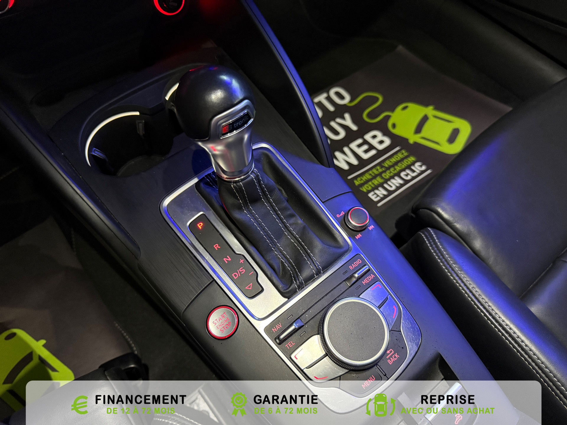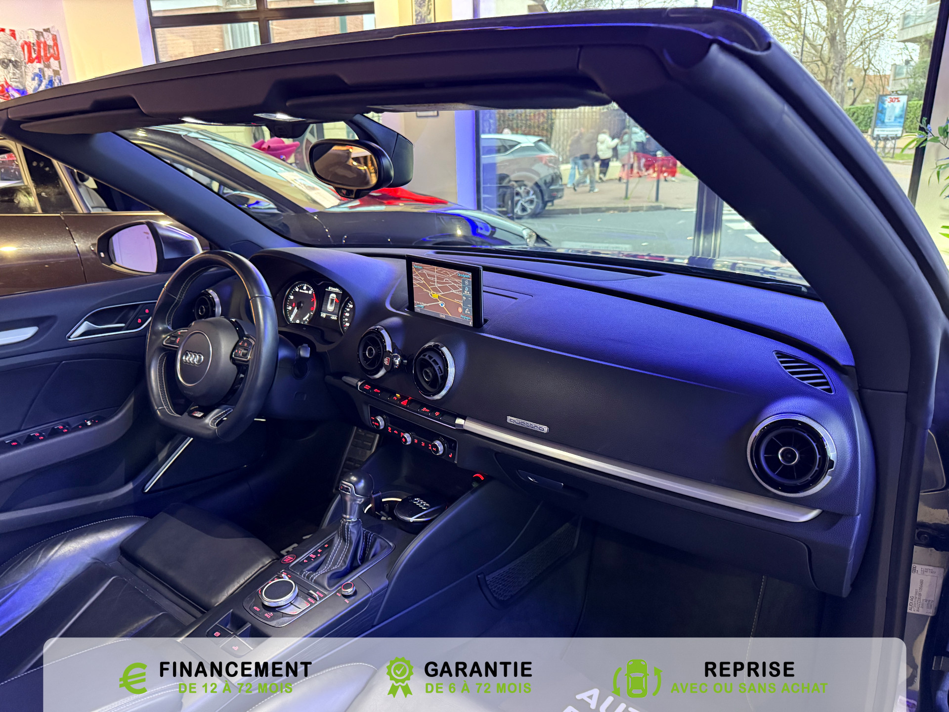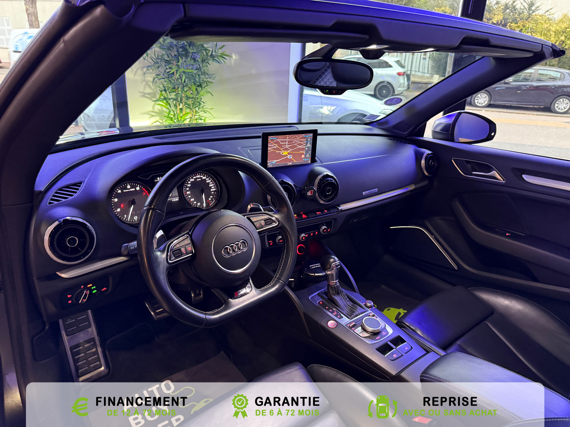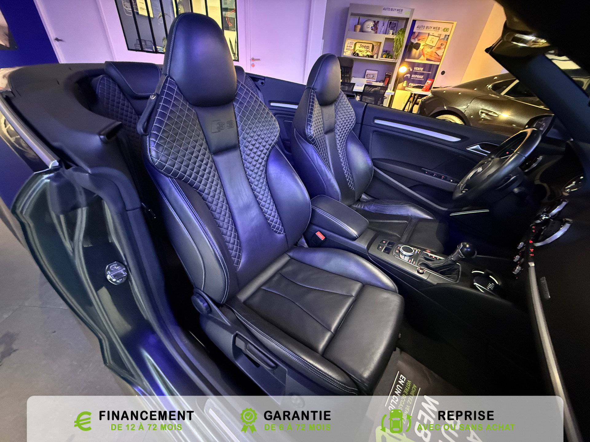 Equipements supplémentaires : Acces confort : fonction etendue de basculement des sieges AV permettant un acces facile aux, Accoudoir central AV avec vide-poches relevable et inclinaison reglable et coulissant en longueur, Airbag de genoux cote conducteur, Airbags grand volume conducteur et passager AV, Airbags lateraux AV integres aux dossiers des sieges, Alarme antivol avec protection antiremorquage par capteur dangle dinclinaison (desactivable),, Allume-cigare et cendrier amovible, couvercle chrome avec anneaux Audi,, Antipatinage electronique ASR, Applications decoratives sur les contre-portes et tableau de bord Aluminium brosse mat, Audi Drive Select (Permet le reglage du mode de conduite), Audi Parking System : facilite le stationnement a l'aide d'un signal sonore indiquant la distance AR, Audi Premium Tracking System, Audi Sound System avec 9HP dont un central dans le tableau de bord et subwoofer dans le logement de, Becquet AR S3 laque dans la couleur de la carrosserie, Blocage electronique de differentiel EDS, Boite a gants grand volume cote passager AV eclairee, Calandre Audi Singleframe gris platine avec entretoises horizontales et anneaux Audi chromees, Capote entierement automatique en noir en tissu isolant 3 couches. La capote souvre et se ferme par, Carrosserie entierement galvanisee contre la corrosion, Ceintures de securite 3 points automatiques pour toutes les places, pretensionneurs pyrotechniques,, Chassis Sport S surbaisse de 25 mm, avec suspensions et amortisseurs plus fermes, Ciel de pavillon en tissu noir, Climatisation automatique Confort avec reglage asservi a la position du soleil, regulation, Controle de ceinture attache pour toutes les places, un signal acoustique et visuel a l'AV previent, Controle de pression des pneumatiques, Controle electronique de stabilisation (ESC) desactivable, avec amplificateur hydraulique de, Detecteur de pluie et de luminosite avec bande grise sur la partie superieure du pare-brise,, Direction progressive contribuant a une augmentation de la dynamique de conduite, Dossier banquette AR rabattables en deux parties 50/50, Ecrous de roues antivol (ne s'enlevent qu'avec l'adaptateur fourni), Feux AR avec feux de recul blancs et feux AR de brouillard incluant 3eme feu stop sureleve et, Feux de freinage adaptatifs, les feux de detresse clignotent en cas de freinage d'urgence afin de, Feux de route assistes: gestion automatique du passage de feux de croisement a feux de route, Filet anti-remous, Fixation pour sieges enfants ISOFIX et Top Tether pour les places exterieures AR, Fixations pour sieges enfants norme ISOFIX aux places exterieures AR, Identification du modele /technologie sur le capot de coffre, sur demande sans indentification du, Inscription S3 sur la calandre, le capot de coffre, les baguettes des seuils de portes, les etriers, Lave-essuie-glace 2 vitesses, 4 intervalles de balayage reglables, commande de balayage coup par, Leve-vitres electriques AV et AR avec protection anti-pincement et fonction Confort, Logement de capote a configuration variable, avec caisson de capote abaissable automatiquement, Lunette AR degivrante avec minuterie, Miroir de courtoisie cote conducteur et passager AV, MMI GPS Plus avec donnees de navigation sur carte SD, Oeilletons de fixation, 4 dans le coffre, pour maintenir les bagages et objets, points de fixation, Outillage de bord dans le coffre incluant un cric, Pack Aluminium Exterieur, Pack Aluminium Exterieur: Encadrement des vitres laterales et baguettes sur les appuis de vitres en, Pack Aluminium Interieur, Pack Aluminium Interieur: sur les diffuseurs d'air, la boite a gants, le bouton de reglage des, Pack Eclairage, Pack Eclairage : eclairage anti-eblouissant de linterieur du vehicule incluant, Pack Eclairage Interieur, Pack Rangement et coffre, Pare-brise acoustique ameliore l'isolation phonique du pare brise et reduit les bruits exterieurs, Pare-chocs couleur carrosserie, Pare-chocs laques dans la couleur de carrosserie avec prises d'air laterales accentuees, extension, Pedalier en acier inoxydable brosse, Poignees de maintien avec mecanisme amortisseur, 4 poignees rabattables encastrees dans le ciel de p, Preparation pour telephone portable (Bluetooth) commande sur volant multifonction mains libres et, Prise 12 V supplementaire incluant allume-cigare et cendrier sous la console centrale, Protection antidemarrage electronique, integree a la gestion du moteur, activation automatique par, Protection laterale anticollision avec barres extremement rigides dans les portieres et une, Quattro: