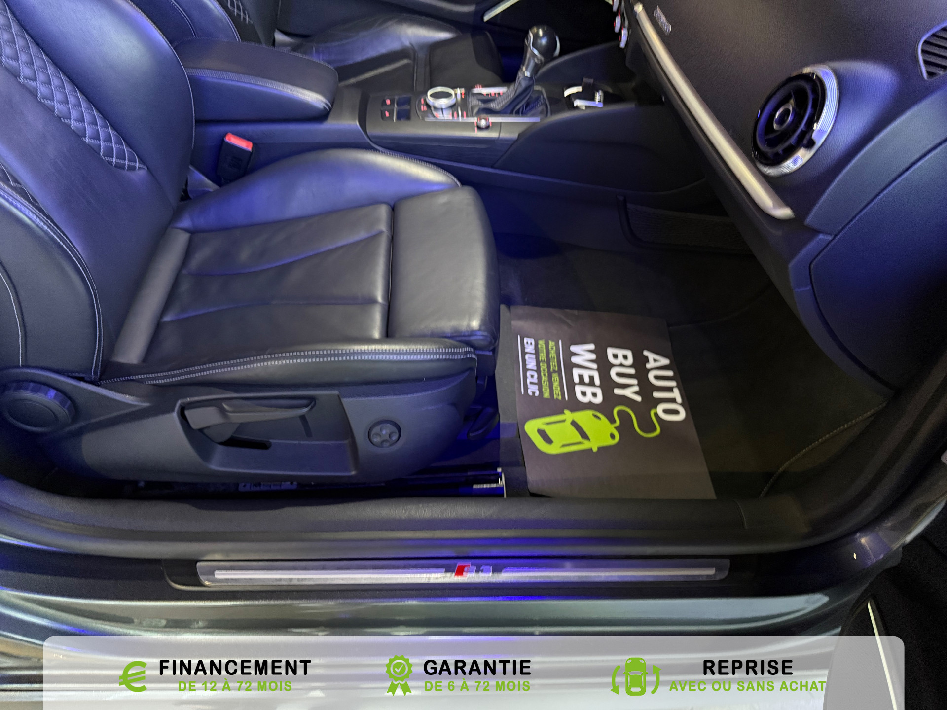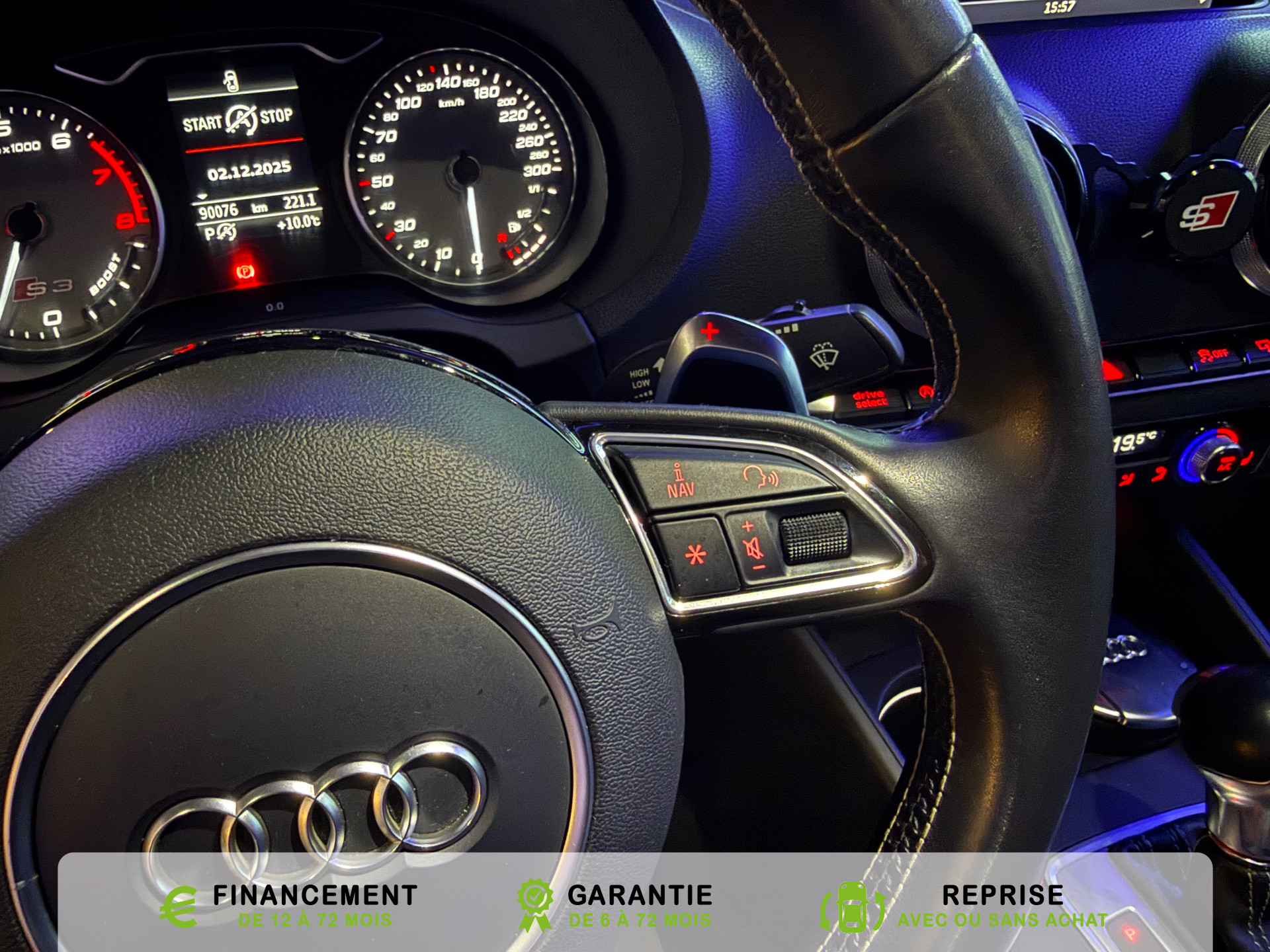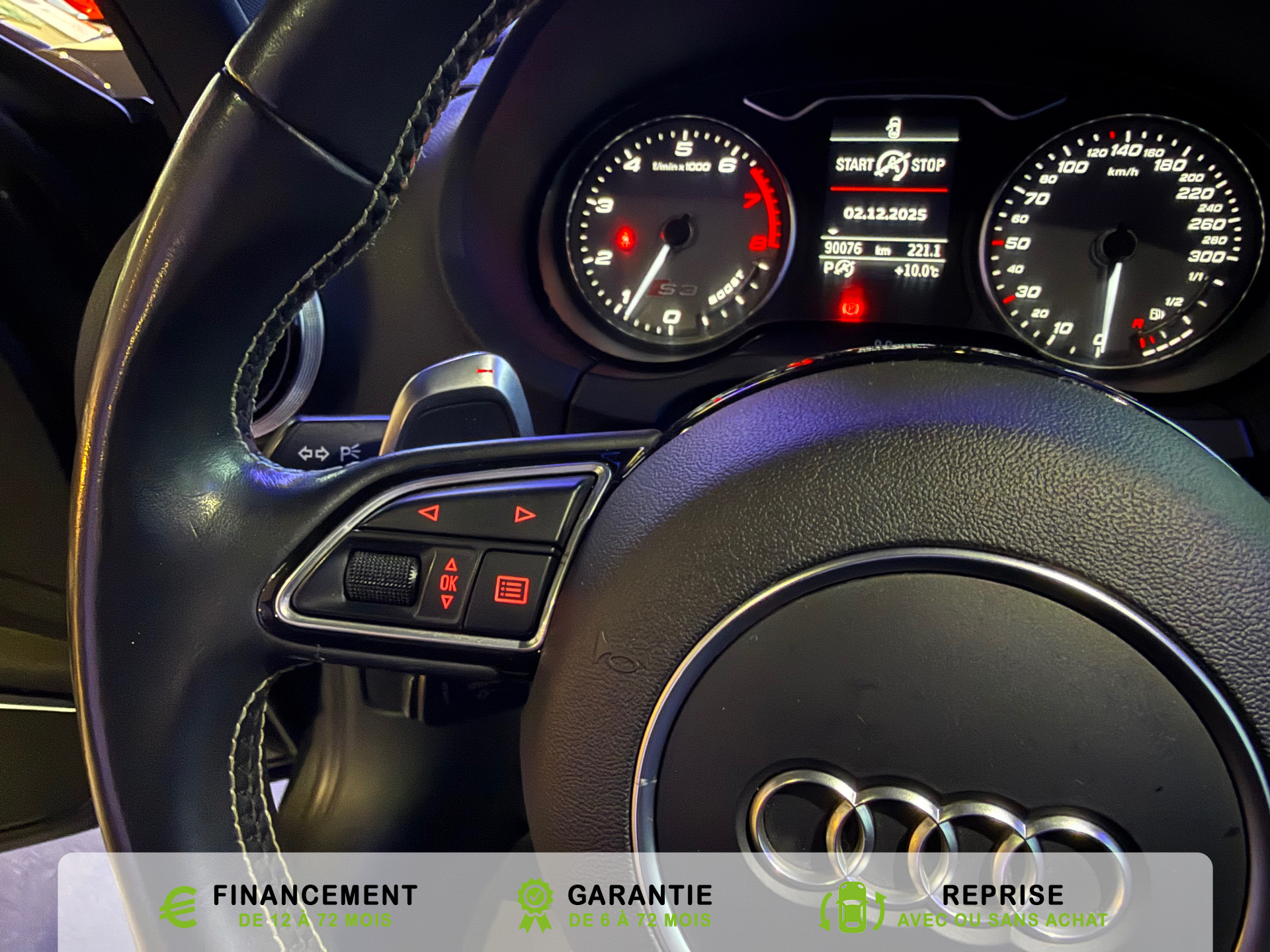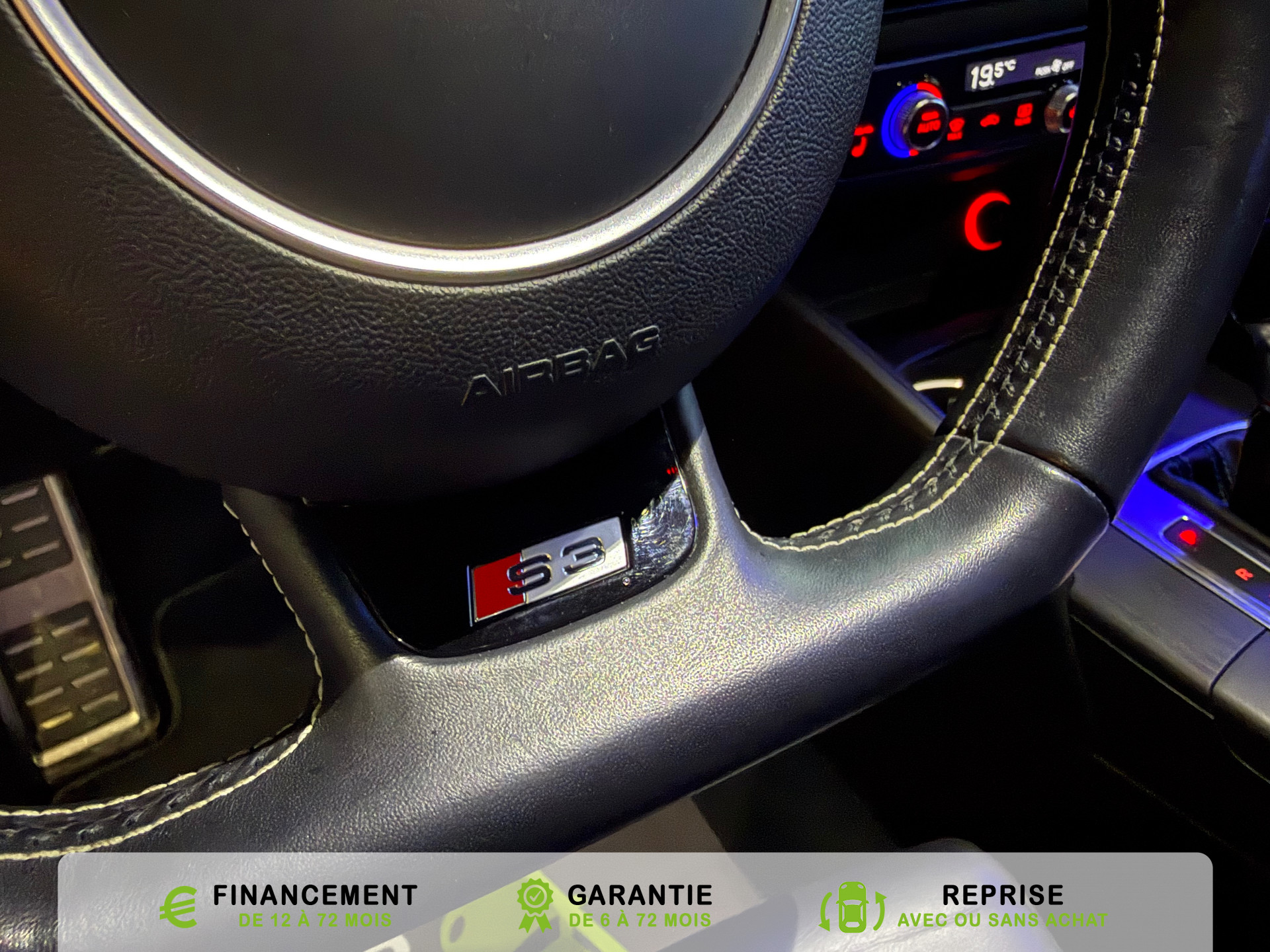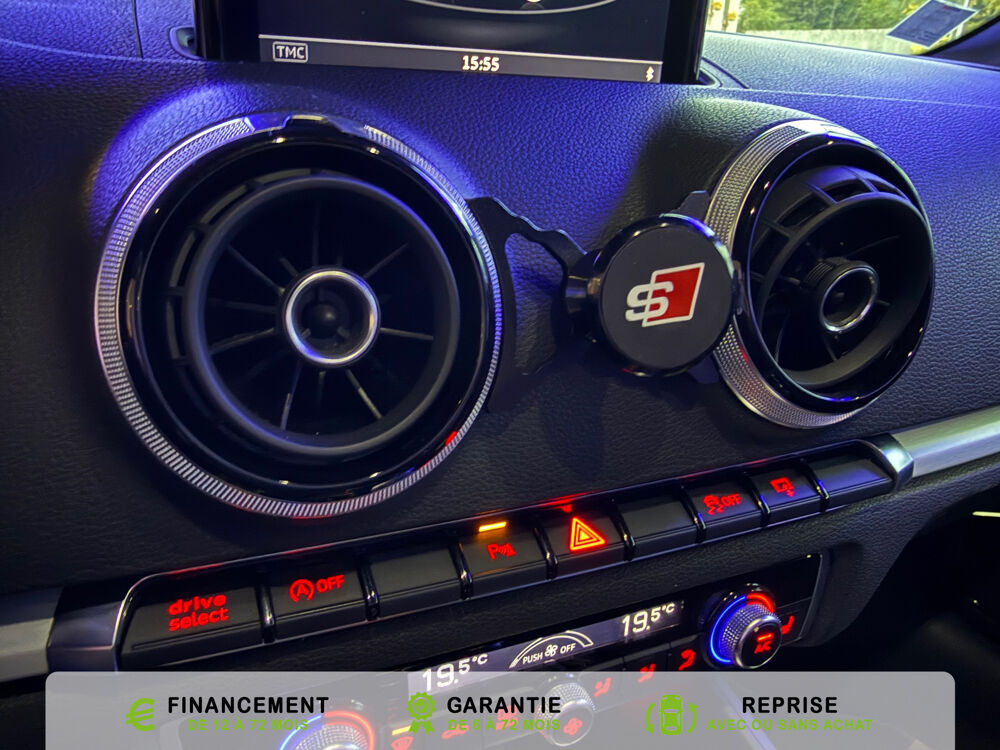 transmission integrale permanente avec repartition asymetrique et dynamique du couple, Rangements dans les contre-portes a l'AV avec casier de rangement pour boissons et rangements dans l, Recommandation de repos qui analyse le comportement routier au moyen de differents capteurs et, Reglage manuel de : longueur, repose-cuisses, inclinaison de dossier, hauteur des sieges AV, Regulateur de vitesse avec maintien constante de la vitesse souhaitee a partir de 30km/h, commande, Retroviseur interieur jour et nuit automatique, Retroviseurs exterieurs avec clignotants a LED integre reglables electriquement et degivrants,, Retroviseurs exterieurs style aluminium avec rappels de clignotant a diodes, aspherique cote, Roue de secours temporaire de type galette, Sellerie mixte en Alcantara et Cuir Milano, Seuils de portes avec inserts en aluminium et embleme S3, Sieges AV Sport avec estampillage S sur le dossier et bourrelets lateraux fortement marques assurant, Sieges conducteur et ...