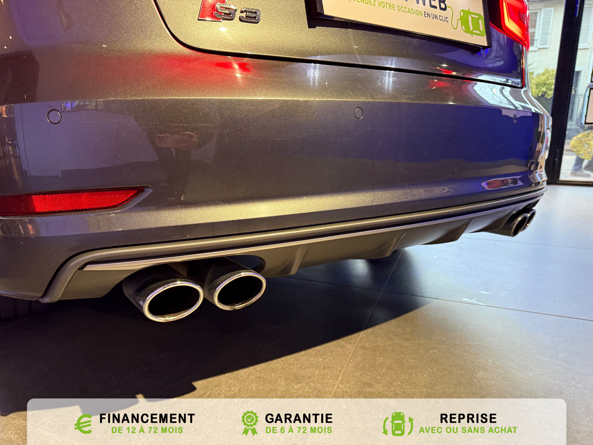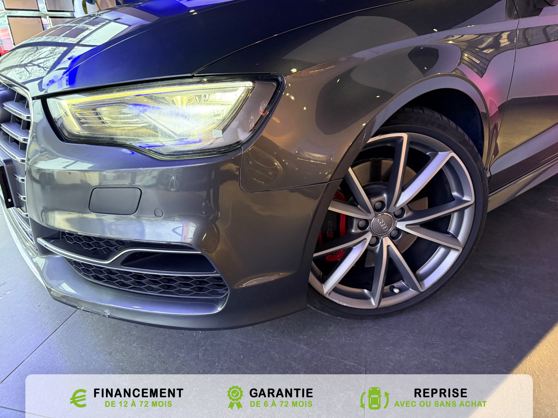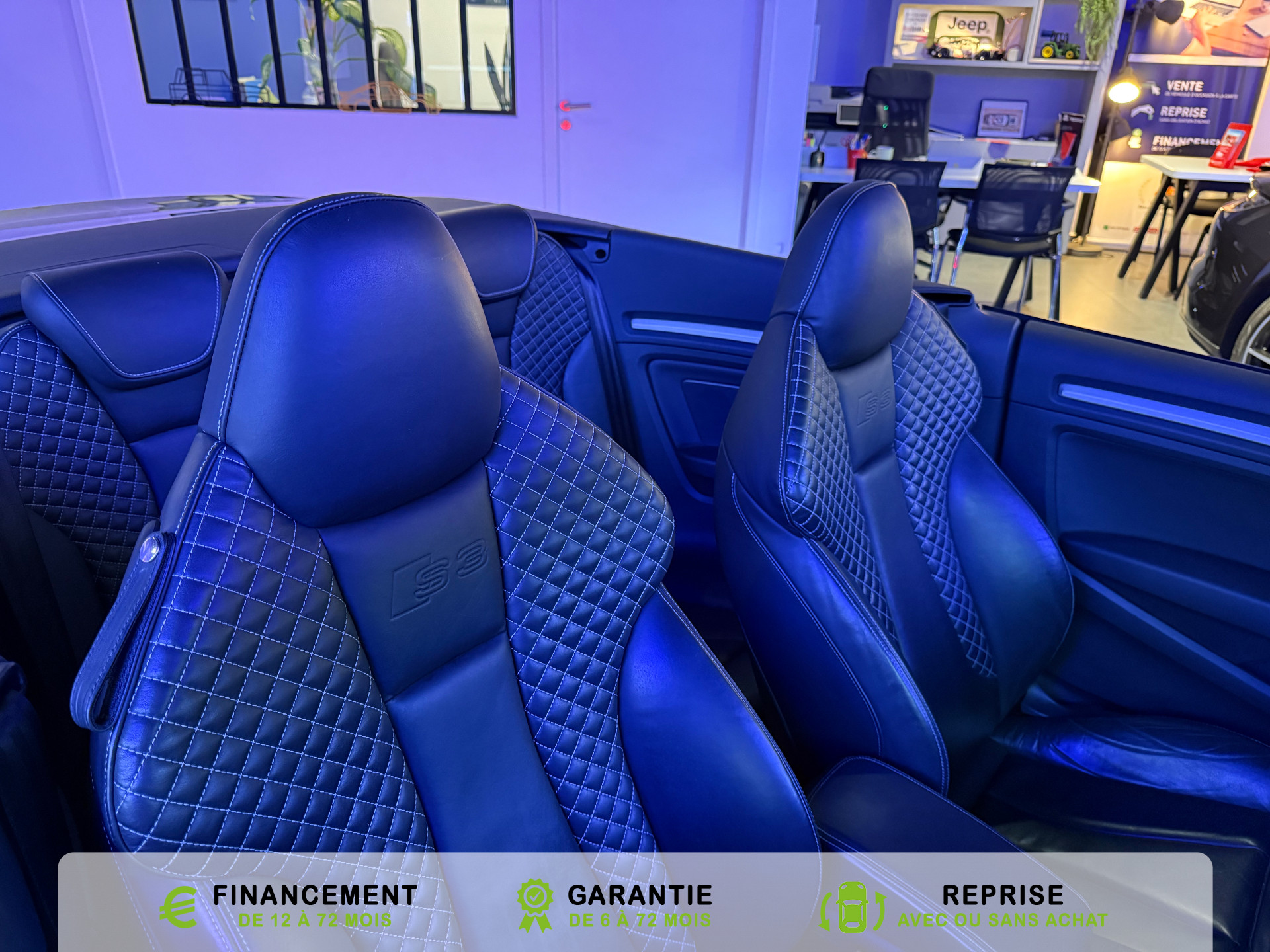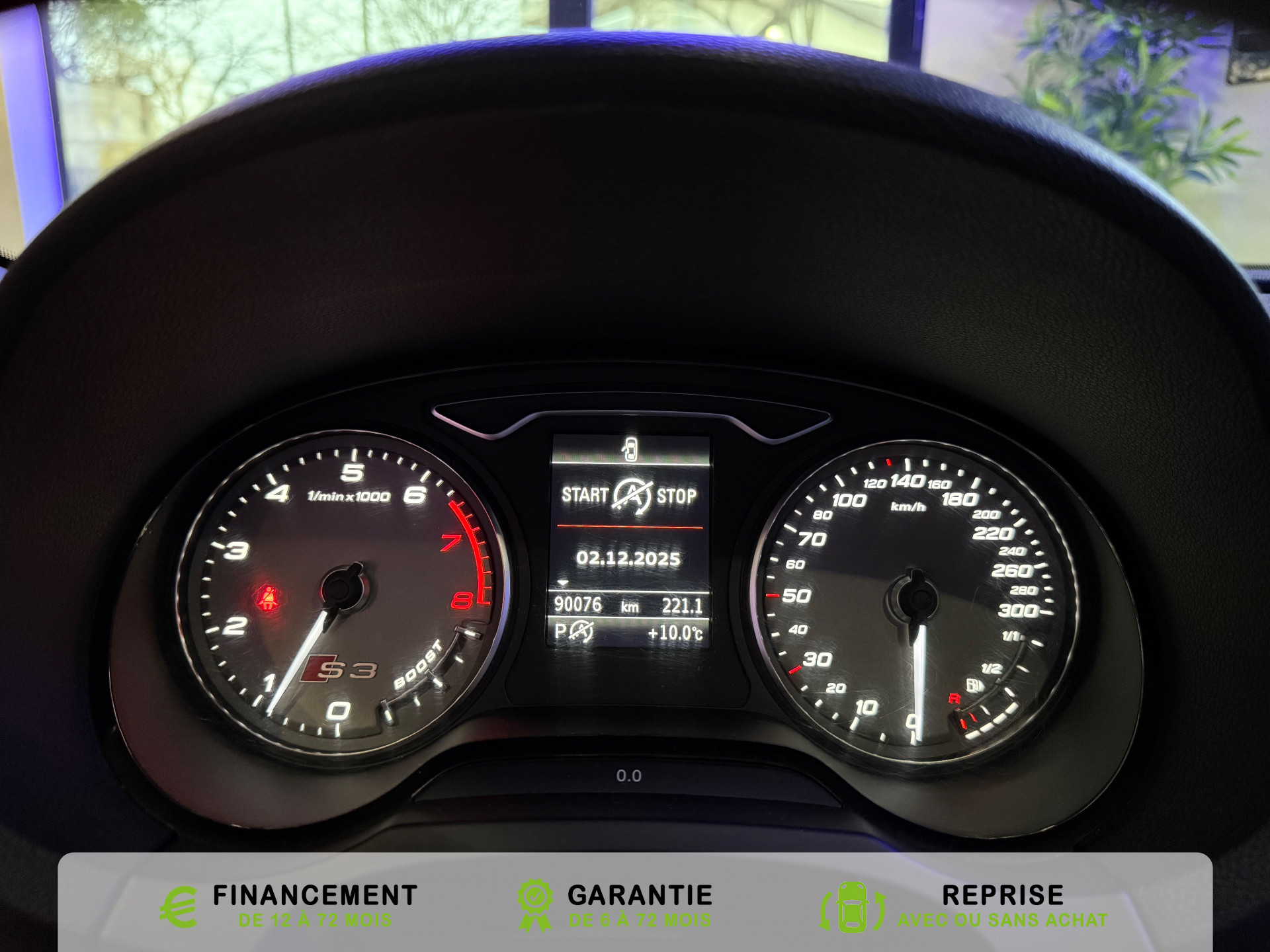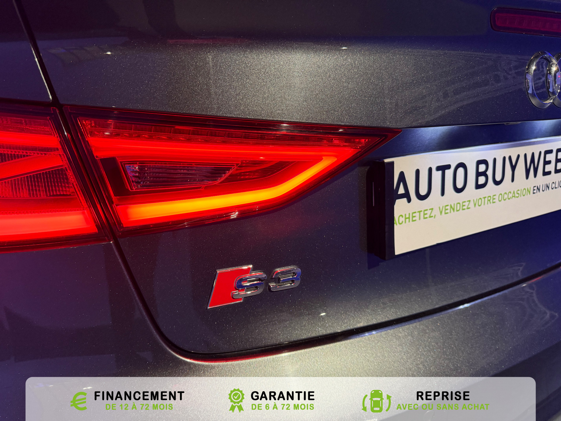 transmission integrale permanente avec repartition asymetrique et dynamique du couple, Rangements dans les contre-portes a l'AV avec casier de rangement pour boissons et rangements dans l, Recommandation de repos qui analyse le comportement routier au moyen de differents capteurs et, Reglage manuel de : longueur, repose-cuisses, inclinaison de dossier, hauteur des sieges AV, Regulateur de vitesse avec maintien constante de la vitesse souhaitee a partir de 30km/h, commande, Retroviseur interieur jour et nuit automatique, Retroviseurs exterieurs avec clignotants a LED integre reglables electriquement et degivrants,, Retroviseurs exterieurs style aluminium avec rappels de clignotant a diodes, aspherique cote, Roue de secours temporaire de type galette, Sellerie mixte en Alcantara et Cuir Milano, Seuils de portes avec inserts en aluminium et embleme S3, Sieges AV Sport avec estampillage S sur le dossier et bourrelets lateraux fortement marques assurant, Sieges conducteur et ...