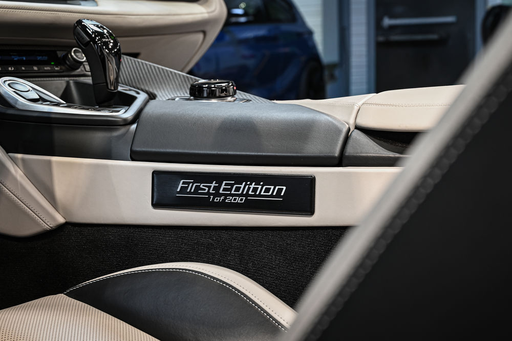 Côté équipements, il concentre l'essentiel de ce qui fait la force de l'i8 Roadster : projecteurs Laser, Affichage tête haute, caméra 360°, système Harman / Kardon, Apple CarPlay ou encore clé Display Key. Le tout complété par des touches exclusives ; inserts en carbone, applications en céramique, ceintures bleues, qui rappellent le soin apporté aux détails.