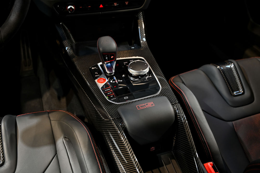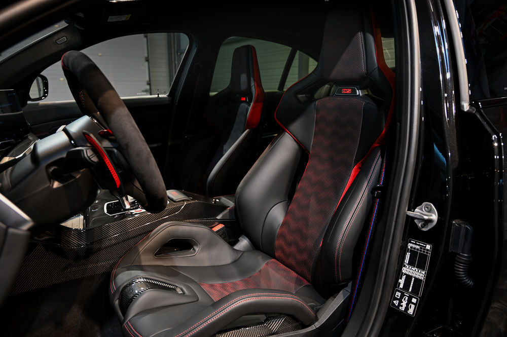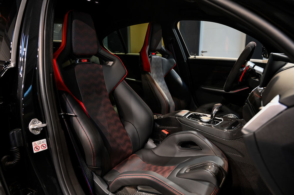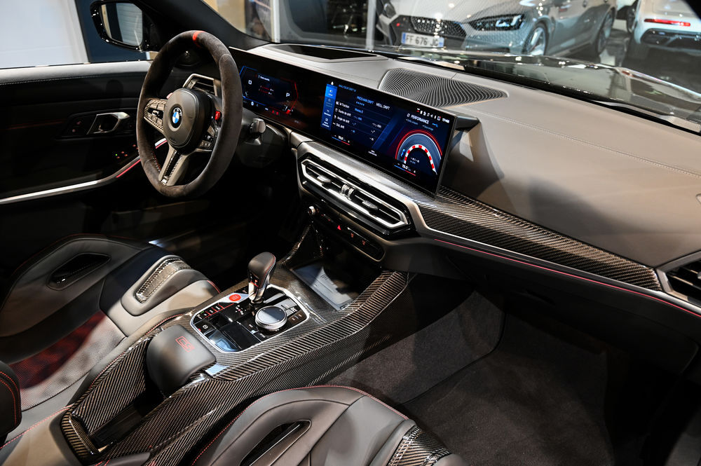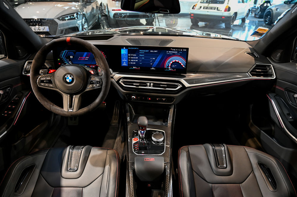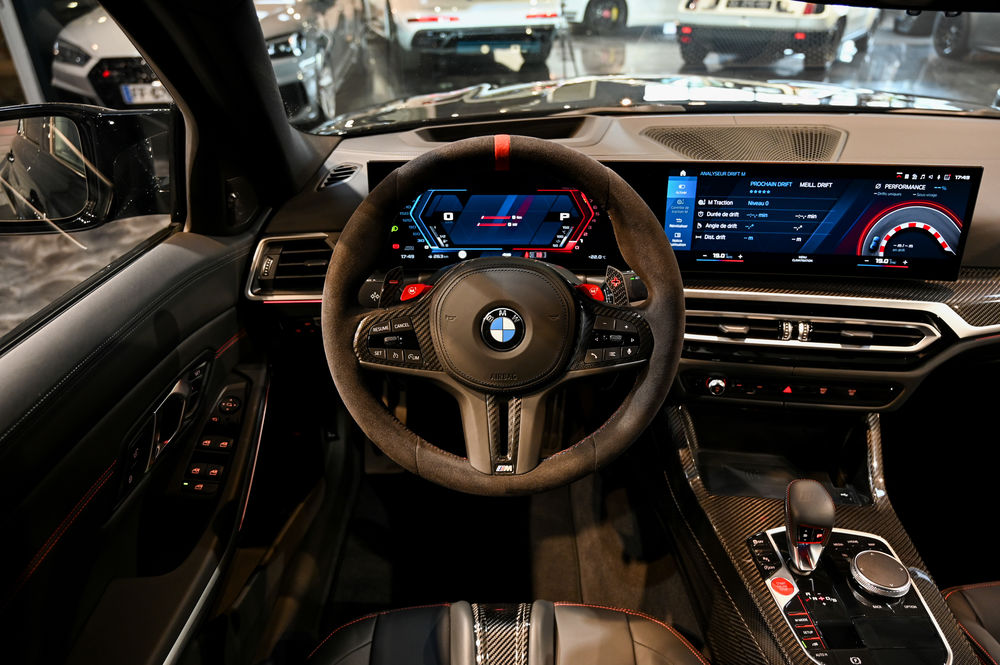 L'intérieur de la M3 CS est un véritable cockpit orienté vers la performance. Les sièges baquets M Carbon, enveloppés de cuir Merino, offrent un maintien latéral optimal. Le tableau de bord numérique, avec affichage spécifique CS, permet une visualisation instantanée des données de performance.