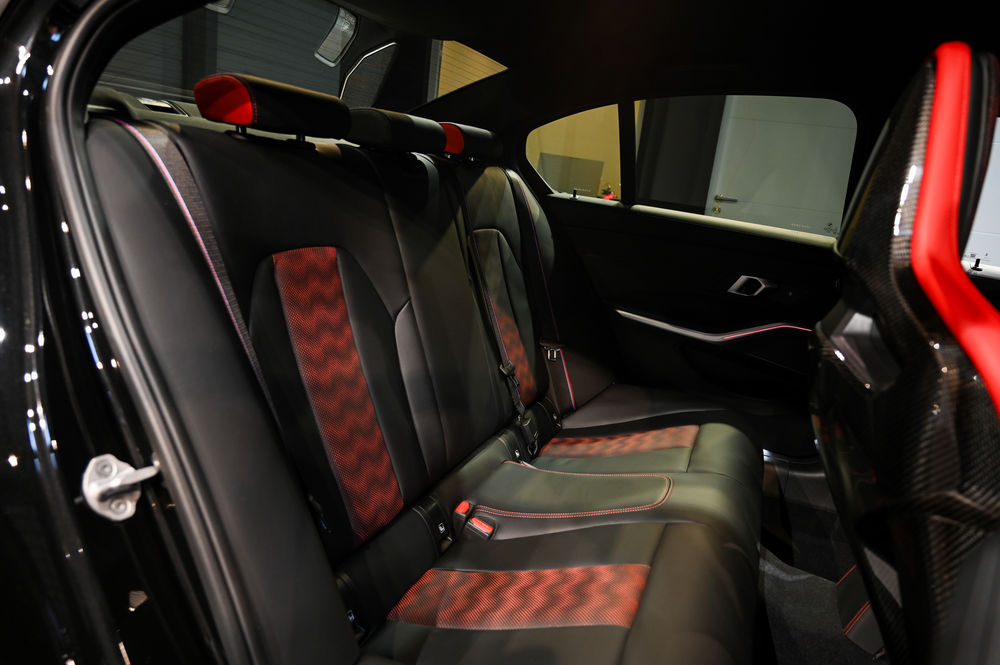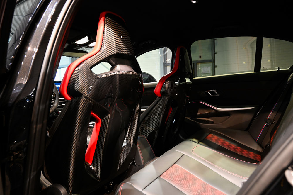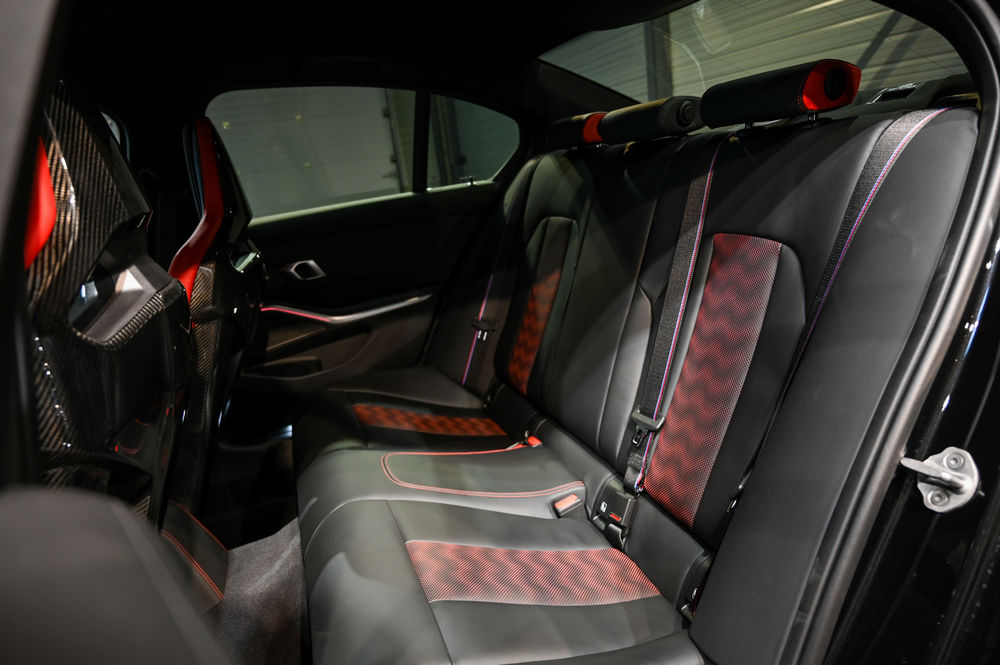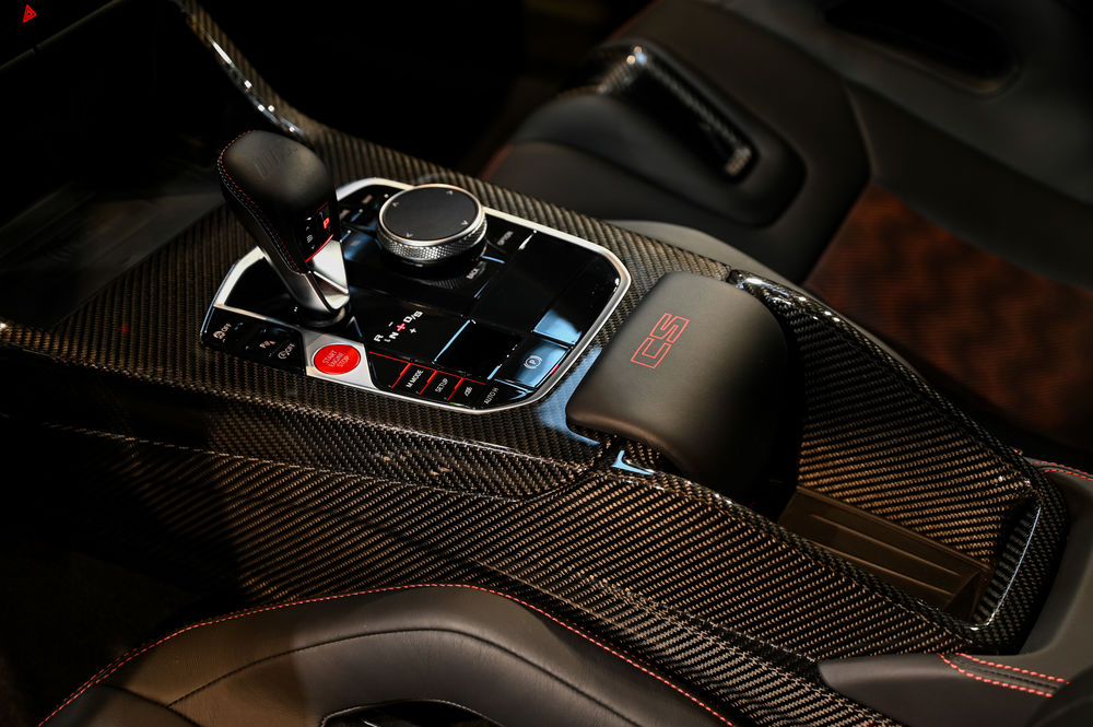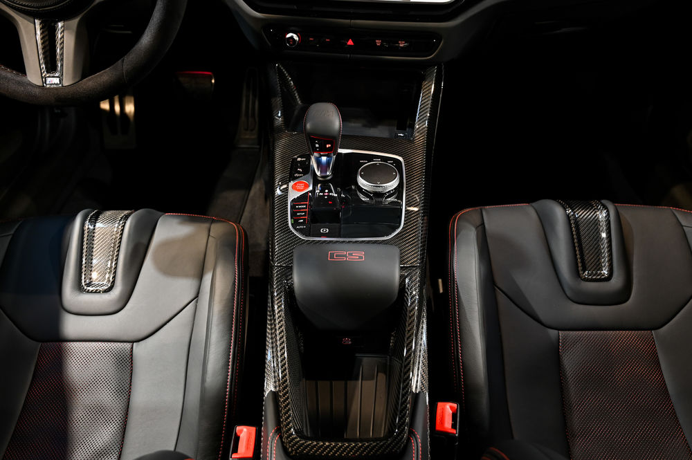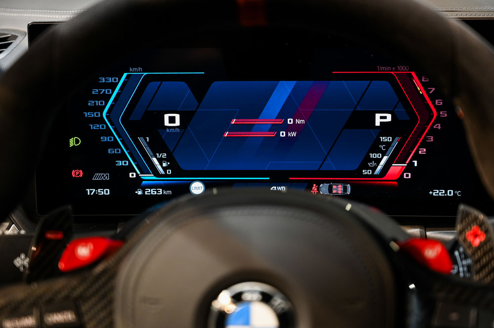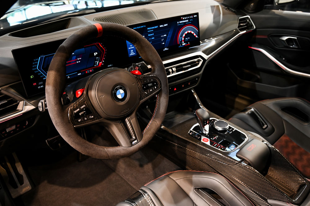 L'intérieur de la M3 CS est un véritable cockpit orienté vers la performance. Les sièges baquets M Carbon, enveloppés de cuir Merino, offrent un maintien latéral optimal. Le tableau de bord numérique, avec affichage spécifique CS, permet une visualisation instantanée des données de performance.
