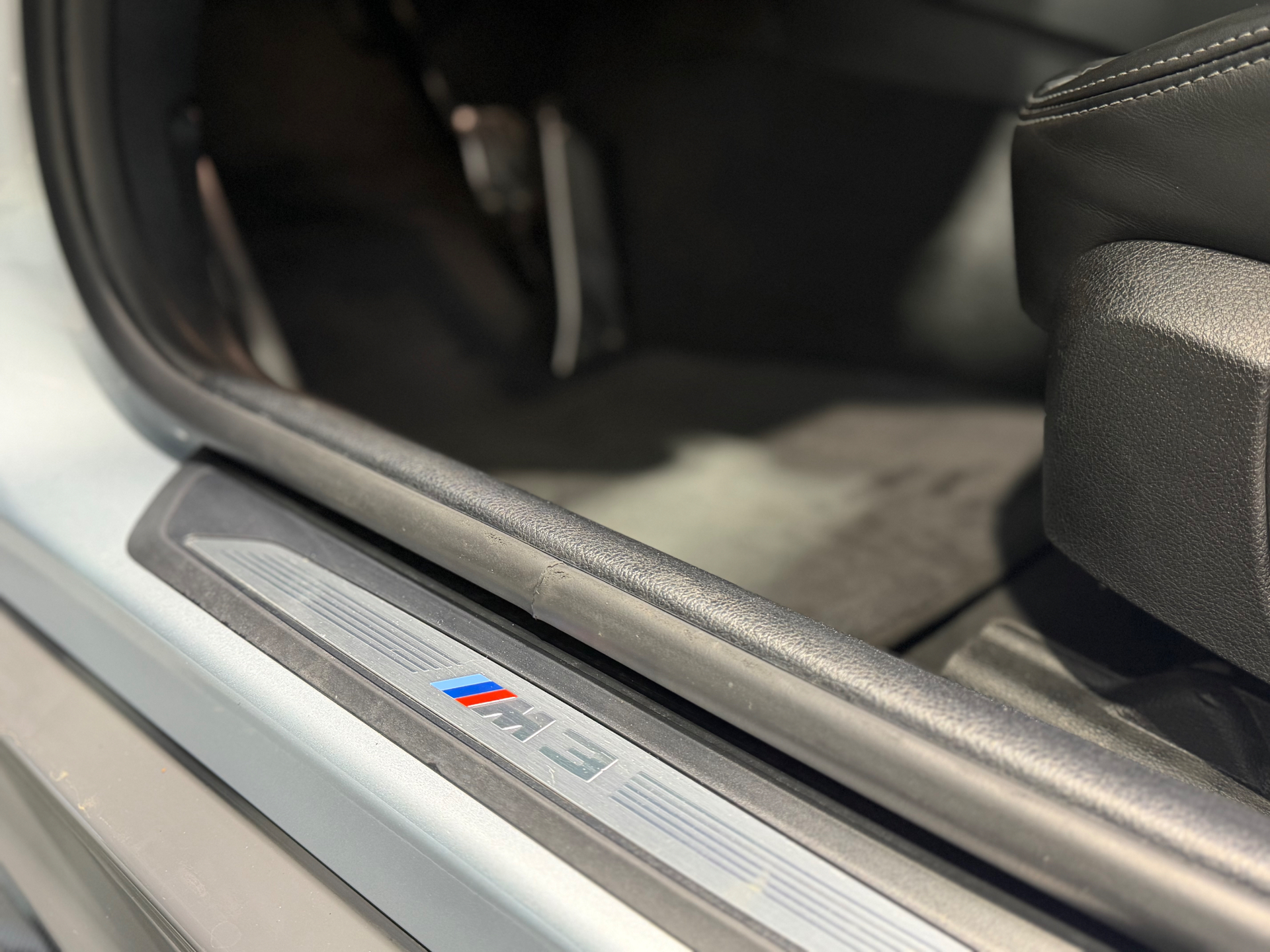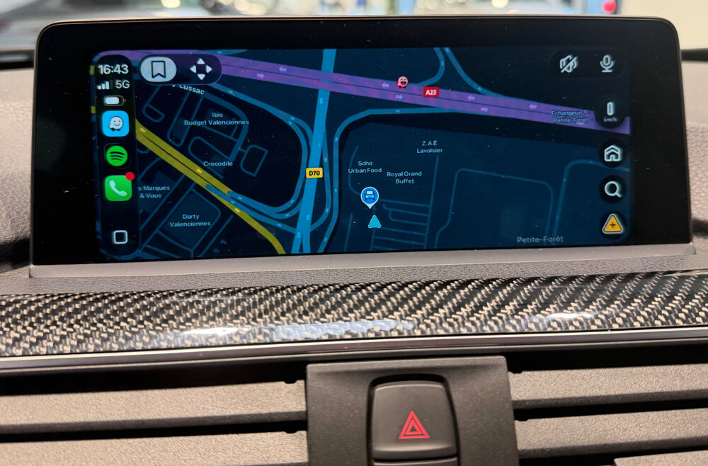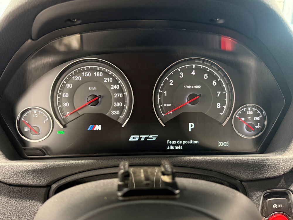 Equipements : 8 touches de favoris programmables et "Controller" iDrive Touch avec touches de raccourci, Bouton de demarrage "Start/Stop" avec contour chrome, Calandre avec cadre en chrome et doubles barreaux verticaux noirs et logo "M3" ou "M4", Ciel de pavillon "Anthrazit", Cles radiocommandees a memorisation automatique des reglages "Personal Profile", Fonctions "Ma BMW a distance" (a vie), Inserts decoratifs "Blue Shadow" souligne de noir brillant, Jantes en alliage leger 19" (48 cm) style 437 M a rayons doubles avec monte pneumatique mixte, Ouies laterales au traite en relief avec entourage chrome, avec inscription "M3" ou "M4", Repose-pied conducteur sigle "M"