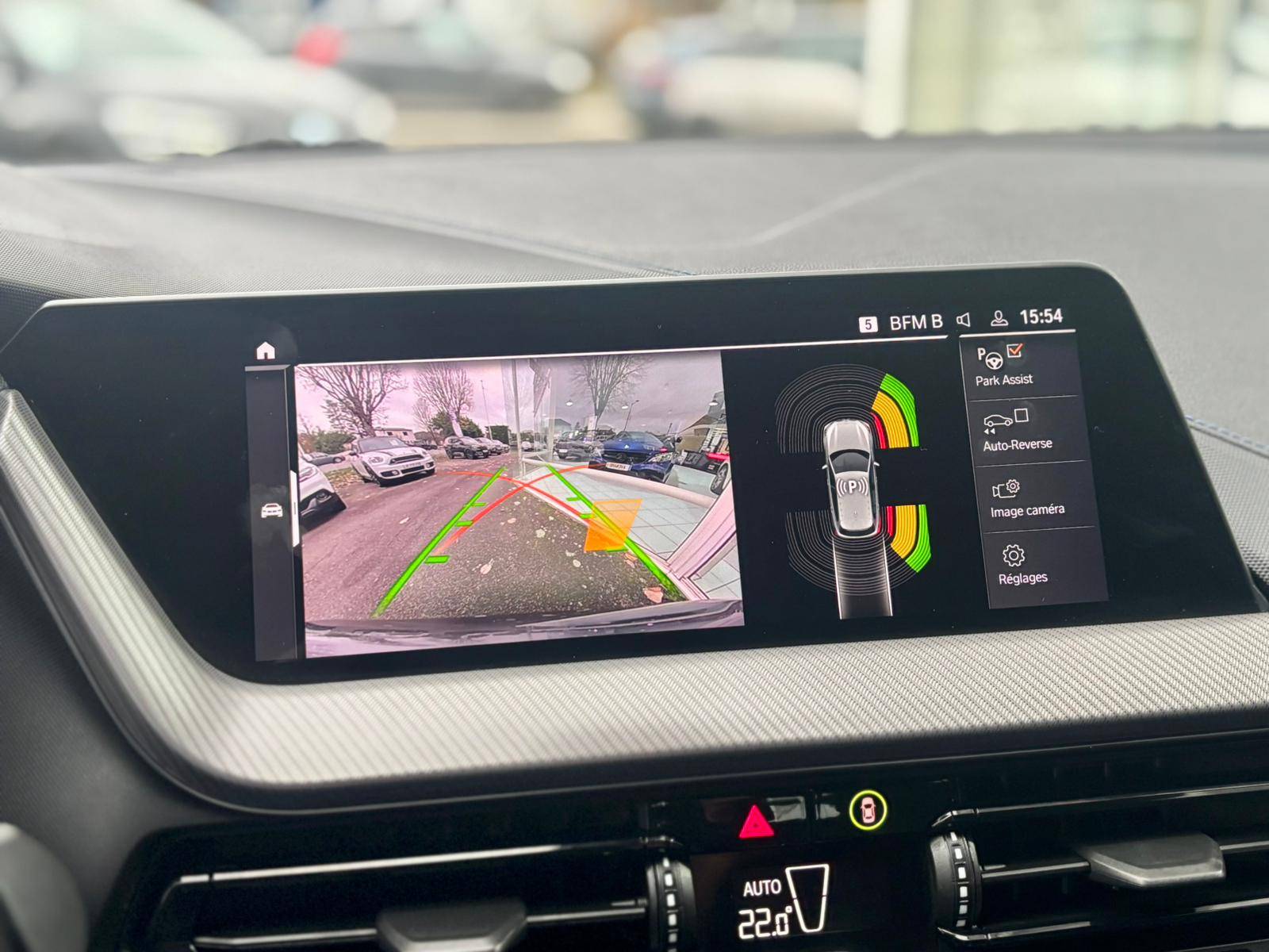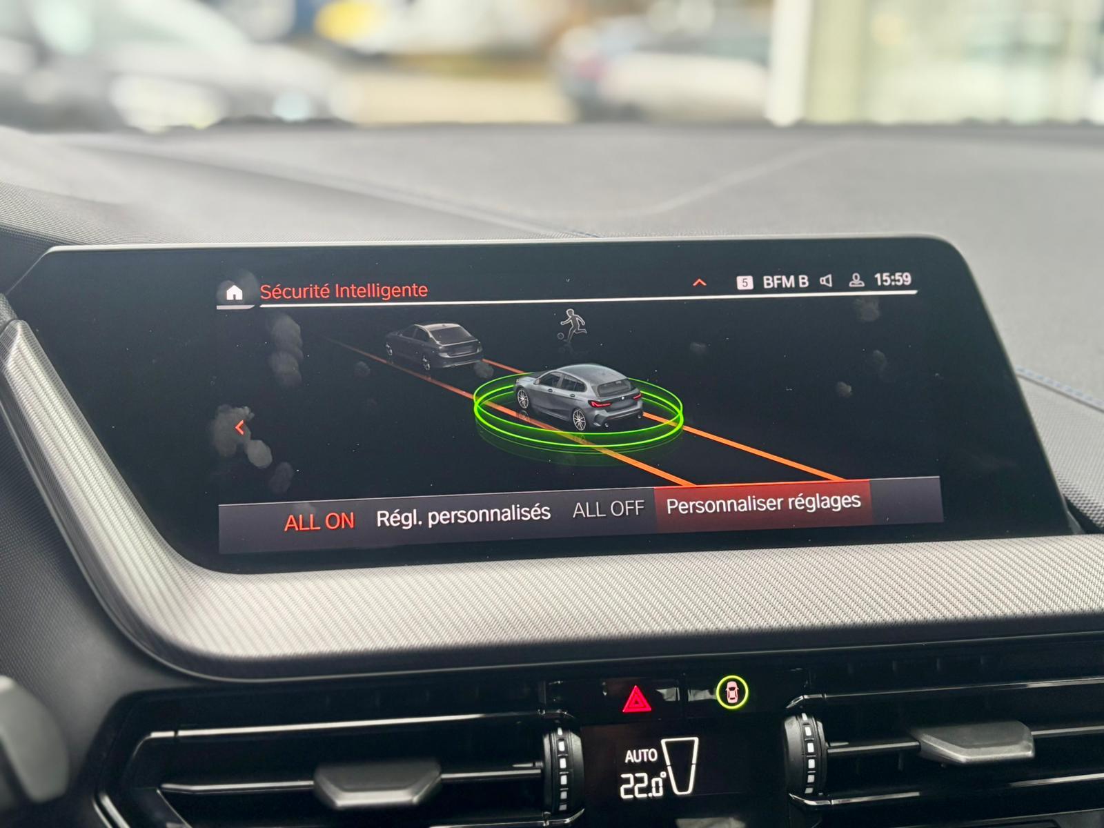 des 15 km/h environ, Verrouillage centralise des portes, du coffre et de la trappe a carburant, Vide-poches ergonomiques dans les portes AV, Volant gaine cuir, Volant M gaine cuir, Volant reglable en hauteur et en profondeur, Capacite du reservoir augmentee, Kit de mobilite BMW, Repair Inclusive 3 ans / 200 000 km : Garantie Commerciale etendue 2 ans + 1 an, Retroviseur interieur electrochrome, Teinte de carrosserie metallisee Saphirschwarz, Trappe a ski rabattable.