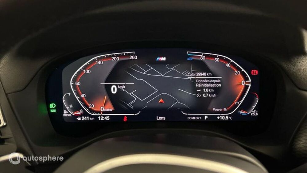 Equipements: ABS, Accoudoir arrière, Accoudoir central AV, Aide au freinage d'urgence, Airbag conducteur, Airbag passager déconnectable, Airbags latéraux avant, Airbags rideaux, Airbags rideaux AR, Alarme antivol, Alarme périmétrique, Antidémarrage électronique, Antipatinage, Appel d'Assistance Localisé, Appel d'Urgence Localisé, Arrêt et redémarrage auto. du moteur, Bacs de portes avant, Banquette 40/20/40, Banquette AR rabattable, Banquette arrière 3 places, Borne Wi-Fi, Buses de lave-glace chauffantes, Caméra de recul, Capteur de luminosité, Capteur de pluie, Ceinture de vitrage chromée, Clim automatique tri-zones, Coffre assisté électriquement, Commande Climatisation AR, Commande du comportement dynamique, Commande Mode ECO, Commandes du système audio au volant, Commandes vocales, Compte tours, Contrôle de couple en courbe, Contrôle de freinage en courbe, Contrôle de Traction, Contrôle élect. de la pression des pneus, Démarrage sans clé, EBD, Echappement à double sortie, Ecran multifonction couleur, Ecran tactile, ESP, Filtre à particules, Filtre à Pollen, Fixations Isofix aux places arrières, Fonction MP3, Freinage automatique d'urgence, GPS Cartographique, Interface Media, Jantes Alu, Kit mains-libres Bluetooth, Limiteur de vitesse, Miroir de courtoisie conducteur, Miroir de courtoisie passager, Ordinateur de bord, Ouverture des vitres séquentielle, Palettes changement vitesses au volant, Phares avant LED, Poignées ton carrosserie, Porte-gobelets avant, Prise 12V, Prise USB, Radar de stationnement AR, Radar de stationnement AV, Radio, Radio numérique DAB, Régulateur de vitesse, Répétiteurs de clignotant dans rétro ext, Rétroviseur intérieur électrochrome, Rétroviseurs dégivrants, Rétroviseurs électriques, Rétroviseurs ext. indexés à la marche AR, Rétroviseurs extérieurs électrochromes, Rétroviseurs rabattables électriquement, Services connectés, Siège conducteur réglable en hauteur, Siège passager réglable en hauteur, Sièges avant sport, Sortie d'échappement chromée, Suspensions Sport, Système d'assistance à la descente, Système d'assistance au stationnement, Système d'éclairage intelligent, Système de détection de somnolence, Système de mesure de place disponible, Système de prévention des collisions, Tablette cache bagages, Température extérieure, TMC, Troisième ceinture de sécurité, Vitres arrière électriques, Vitres avant électriques, Volant cuir, Volant multifonction, Volant réglable en profondeur et hauteur, Volant sport, BMW Gesture Command, BMW Live Cockpit Navigation Pro, Inserts M Alu Rhombicle foncé, Rails de toit Shadow Line M brillant, Similicuir Sensatec perf Schwarz