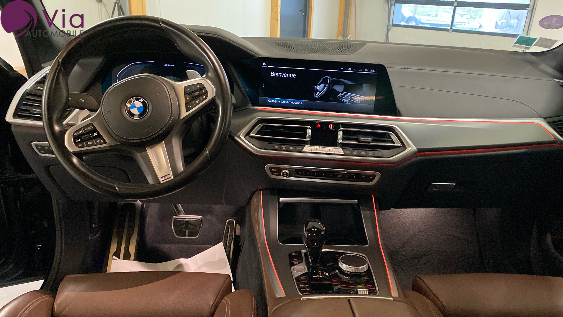 Equipements : Cles radiocommandees a memorisation automatique des reglages "Personal Profile", Designation du modele "X5" a gauche et "xDrive" a droite sur le hayon, Inserts decoratifs en Aluminium "Mesheffect" fonce, Instrumentation avec 4 combines ronds haute resolution 5,7" couleur, Jantes en alliage 19" style 734 a rayons en V, Systeme de manoeuvres entierement automatiques "Park Assist", Trappe de recharge electrique cote conducteur avec badge "electrified by i", Inserts decoratifs BMW Individual "Piano Black", Planche de bord en cuir (en relation avec Sellerie Cuir integral "Merino" BMW Individual), Regulateur de vitesse actif ACC+ avec fonction Stop&Go