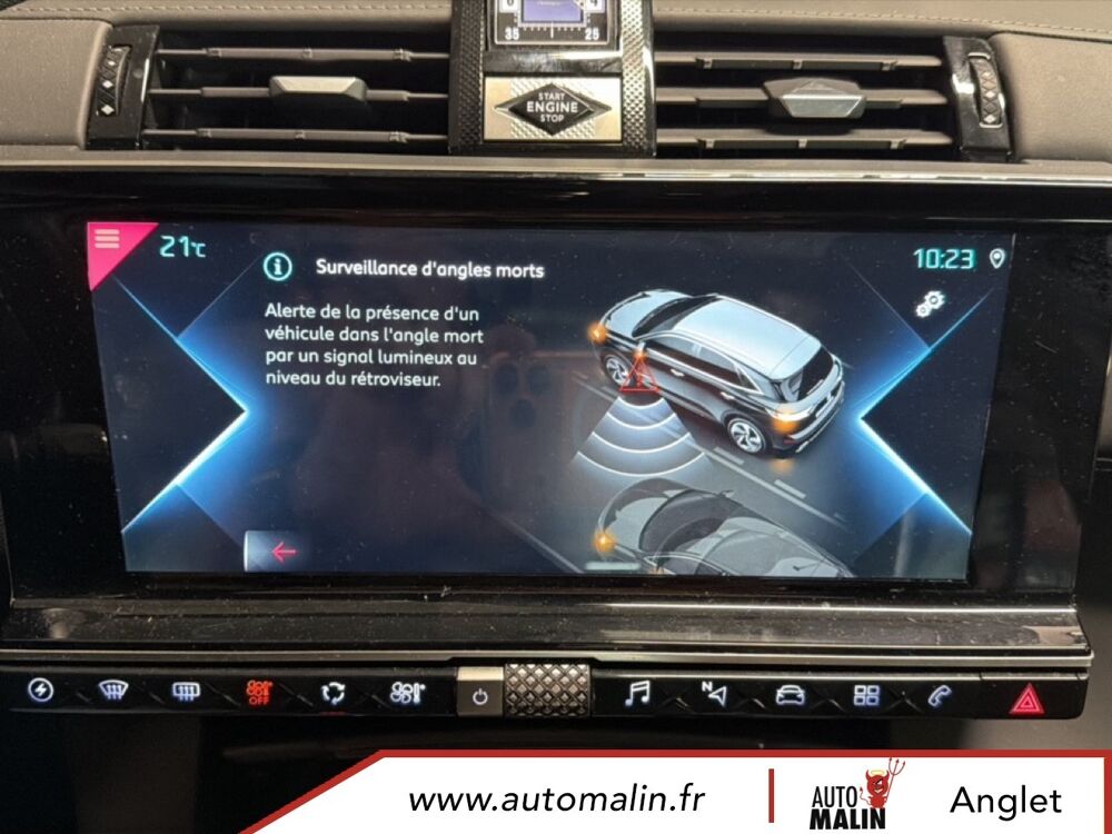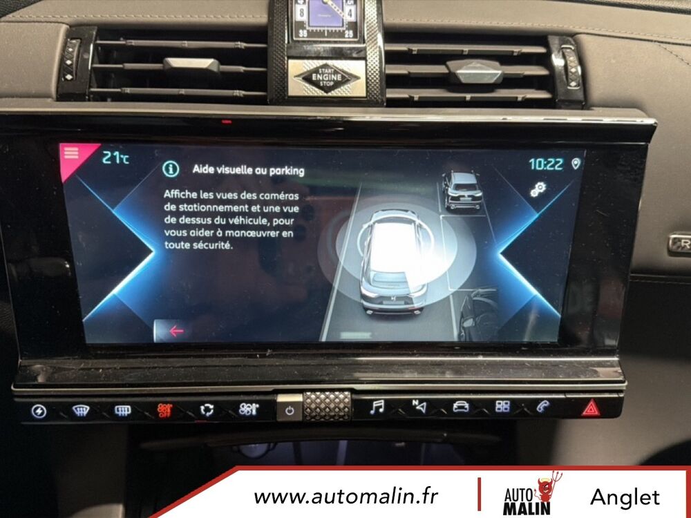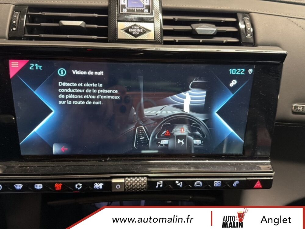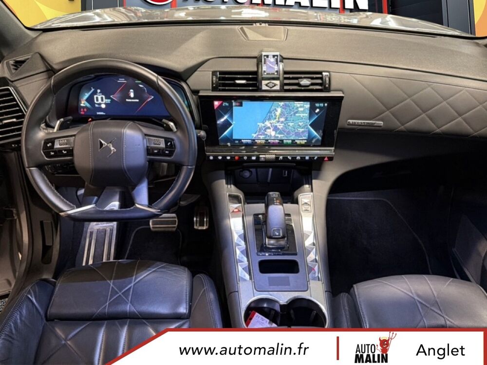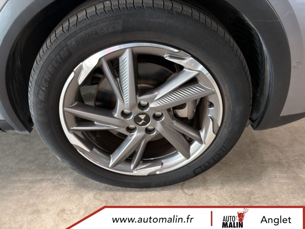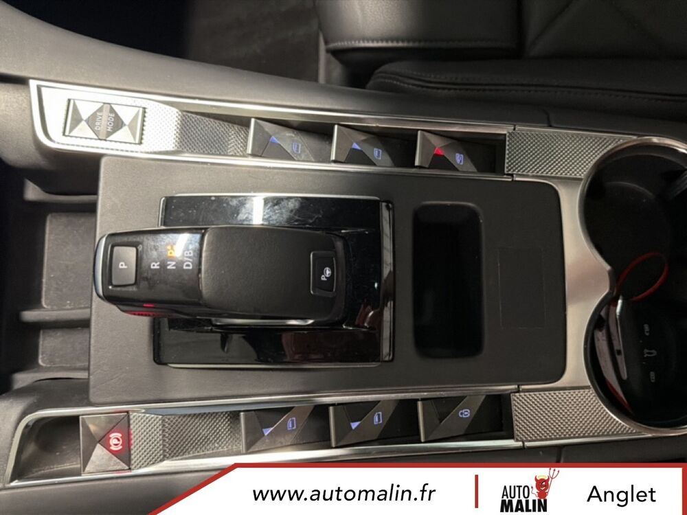 Equipements supplémentaires : ABS avec repartiteur electronique de freinage (REF) et Aide au Freinage d'Urgence (AFU), ABS, AFU, ESP, REF, Acces et demarrage mains libres, Accoudoir central AR avec porte-gobelets, Accoudoir central AV avec rangement, Accoudoir central/de porte similicuir graine et crosses de portes similicuir Noir Basalte, Accoudoir central/de porte TEP Isabella, Aide au demarrage en pente, Aide au stationnement AR, Aide au stationnement AV et AR, Aide au stationnement AV et AR avec Camera de recul, Airbags frontaux aux places AV avec desactivation par cle de l'airbag passager, Airbags rideaux aux places AV, Airbags rideaux aux places AV et AR, Alerte active de franchissement involontaire de ligne, Alerte Attention Conducteur, Alerte Attention Conducteur par camera, Allumage automatique des feux de detresse en cas de forte deceleration, Allumage automatique des projecteurs, Antenne radio integree dans la lunette AR, Aumonieres de dos sur les sieges AV, Avertisseur bi-ton, Badge de planche de bord RIVOLI, Banquette AR 2/3 - 1/3 avec 3 appuie-tete, Banquette AR 2/3 - 1/3 permettant un plancher plat, Banquette AR inclinable electriquement, Banquette AR rabattable depuis le coffre, Barres de toit aluminium, Boite a gants refrigeree, Cable de recharge mode 2 standard 1,8 kW (8 A), Calandre surmontee de l'embleme E-TENSE, Camera de recul, Chargeur embarque de 7,4 kW, Chargeur pour une recharge plus rapide de la batterie, Chargeur sans fil, Clignotants impulsionnels 3 coups, Climatisation automatique bi-zone, Climatisation avec aerateurs aux places AR, Commutation automatique des feux de route, Condamnation automatique des portes, du hayon et de la trappe a carburant en roulant, Controle de stabilite de l'attelage, Controle de traction intelligent, Controle dynamique de stabilite (ESP) avec antipatinage des roues (ASR), Coques de retroviseurs exterieurs Noir Perla Nera, Crochet d'arrimage dans le coffre au dessus du plancher de coffre x4, Detection de sous-gonflage, Direction a assistance variable, Double canule d'echappement chromee, DS ACTIVE LED VISION, DS ACTIVE SCAN SUSPENSION, DS CONNECT NAV avec radio numerique, DS Wings chromees, Eclairage a LED, Eclairage d'accompagnement automatique, Eclairage d'accueil a louverture du vehicule, Eclairage d'accueil automatique, Eclairage d'ambiance integral a LED, Entourage des vitres laterales chrome, Essuie-vitre AV a declenchement et cadencement automatiques, Essuie-vitre AV automatique, Feux AR 3D (traitement ecailles), Feux AR 3D a LED, Feux diurnes a LED, Filtre a odeurs avec charbon actif, Filtre a pollen, Fixations ISOFIX a la place passager AV et aux places laterales AR, Frein de stationnement electrique automatique, Freinage d'urgence automatique, Grille de calandre noir brillant, Guide utilisateur numerique, Hayon motorise, Indicateur de changement de rapport, Indicateur de rapports engages, Interieur Cuir Gris Perle, Interieur Cuir Noir Basalte, Jonc sur volet et bouclier AR chrome, Kit de depannage provisoire de pneumatiques, Leve-vitres AV et AR electriques avec fonction antipincement, Leve-vitres AV/AR electriques, sequentiels et avec fonction antipincement, Limiteur de vitesse, Lunette AR chauffante, Mirror Screen, Montre B.R.M. R180, Navigation, NAVIGATION avec radio numerique, Ouverture et fermeture des vitres a distance, Pack Auto Confort, Pack Modularite, Pack Securite, Pack Securite Etendue avec freinage durgence automatique, Pack Sieges Confort, Pack Sieges Electriques, Palettes au volant, Panneaux de portes en cuir Nappa Gris Perle, Pare-brise acoustique, Pare-brise teinte et acoustique, Pare-soleil rembourres avec eclairage a LED, Pedalier et le repose-pied aluminium, Pieds de retroviseurs exterieurs couleur carrosserie, Planche de bord en Cuir Nappa Gris Perle, Planche de bord en cuir Nappa Noir Basalte, Planche de coffre avec zone de rangement integree pour le cable de recharge, Plancher de coffre modulable a 2 positions, Poignees de portes couleur carrosserie, Prise 12 V, Prise USB Data a l'AV, Prises USB x2 aux places AR, Projecteurs antibrouillard a LED, Radio numerique terrestre (DAB), Rangements lateraux, Rangements lateraux dans le coffre, Reconnaissance des panneaux de vitesse et preconisation, Reconnaissance etendue des panneaux de circulation, Reconnaissance vocale, Regulateur/Limiteur de vitesse, Retroviseur interieur electrochrome sans cadre, Retroviseurs exterieurs rabattables electriquement avec projection au sol du logo DS, Retroviseurs exterieurs rabattables electriquement et indexes a la marche AR avec, Sabot AV finition Gris