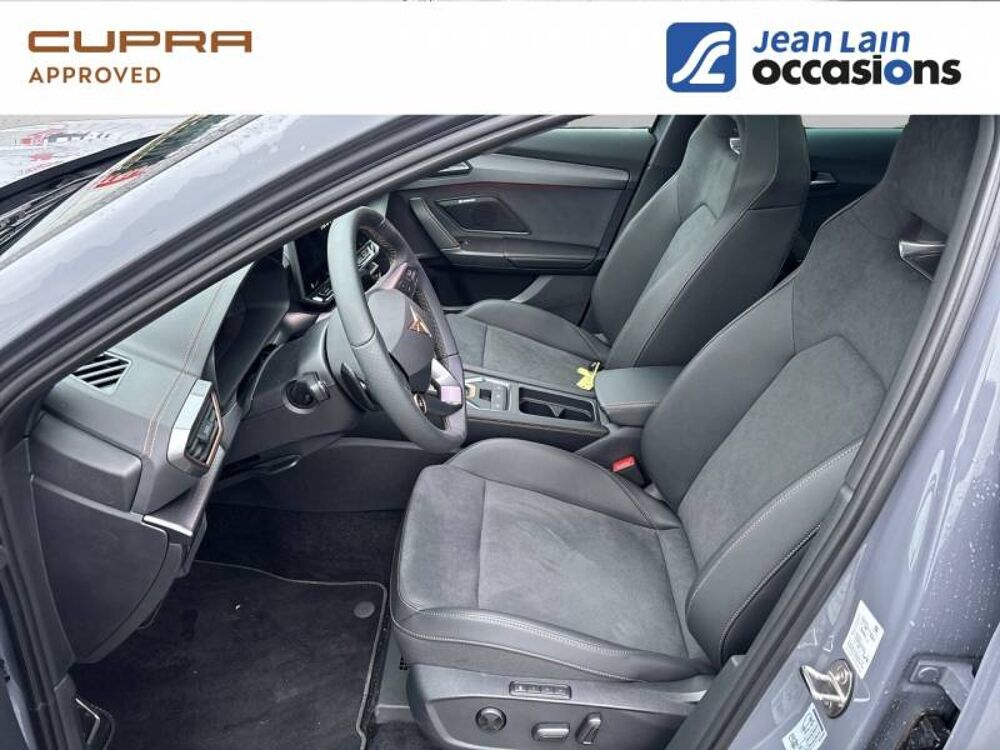 - Design intérieur Dynamic - Sièges baquets suédine Noir Asphalte avec poinçonnage Bleu Astral et surpiqûres cuivrées - Logos CUPRA estampés sur les appuie-têtes - Planche de bord noire surpiquée avec inserts Dark Alu - Contre-portes suédine noire avec poinçonnage Bleu Astral - Siège conducteur : chauffant avec réglage électrique à mémoire, y compris réglage lombaire - Siège passager : chauffant avec réglage manuel de la hauteur
