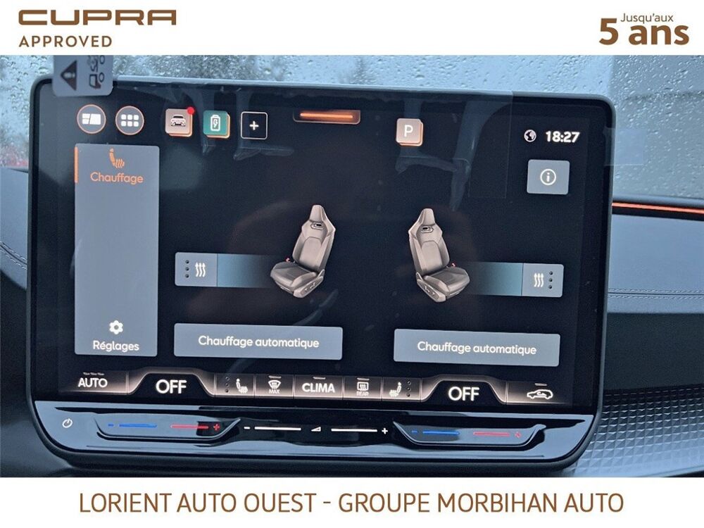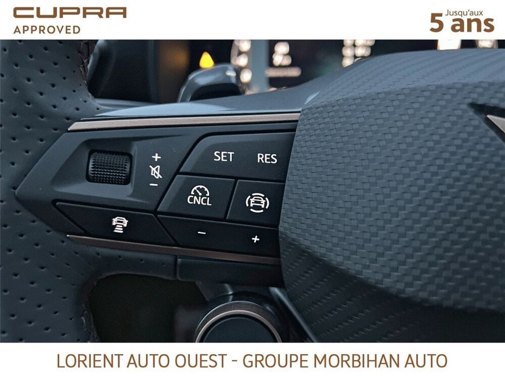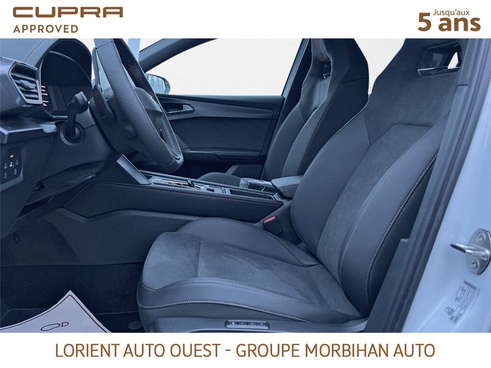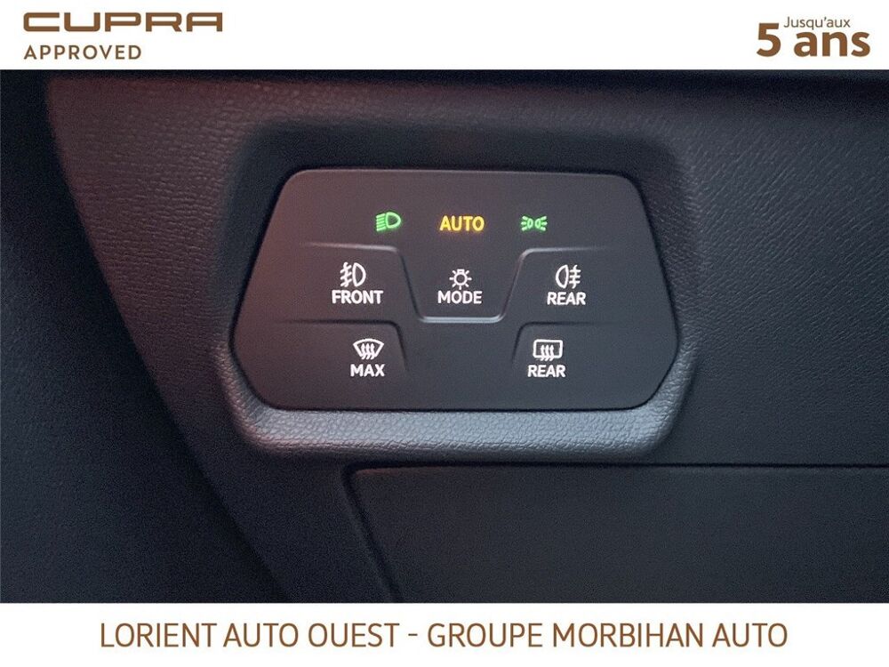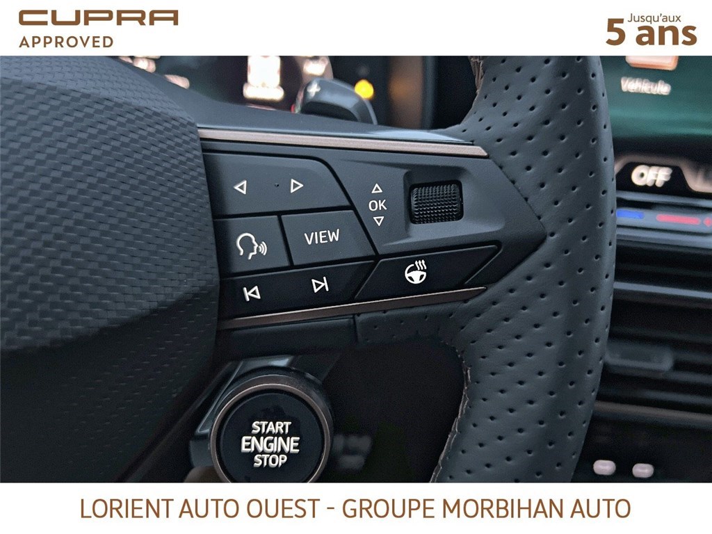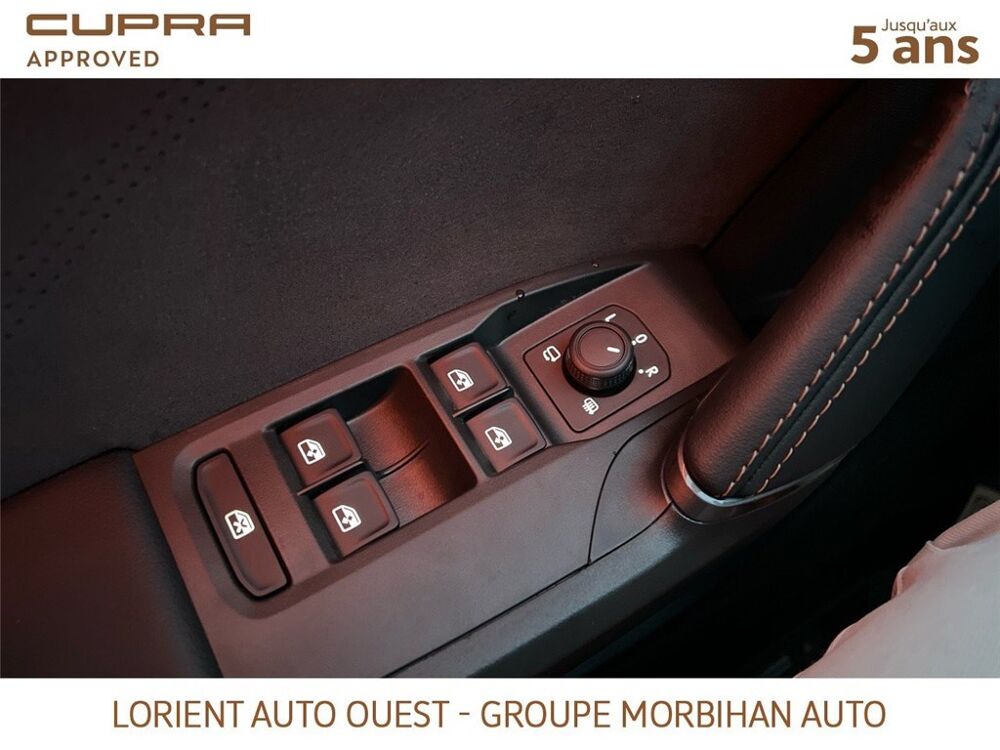 - Design intérieur Dynamic - Sièges baquets suédine Noir Asphalte avec poinçonnage et surpiqûres cuivrées - Logos CUPRA estampés sur les appuie-têtes - Planche de bord noire texturée avec inserts Dark Alu - Contre-portes suédine noire avec poinçonnage cuivré - Conducteur : siège électrique, dont réglage lombaire, à mémoire - Passager : réglage manuel de la hauteur et lombaire - Conducteur + passager chauffants