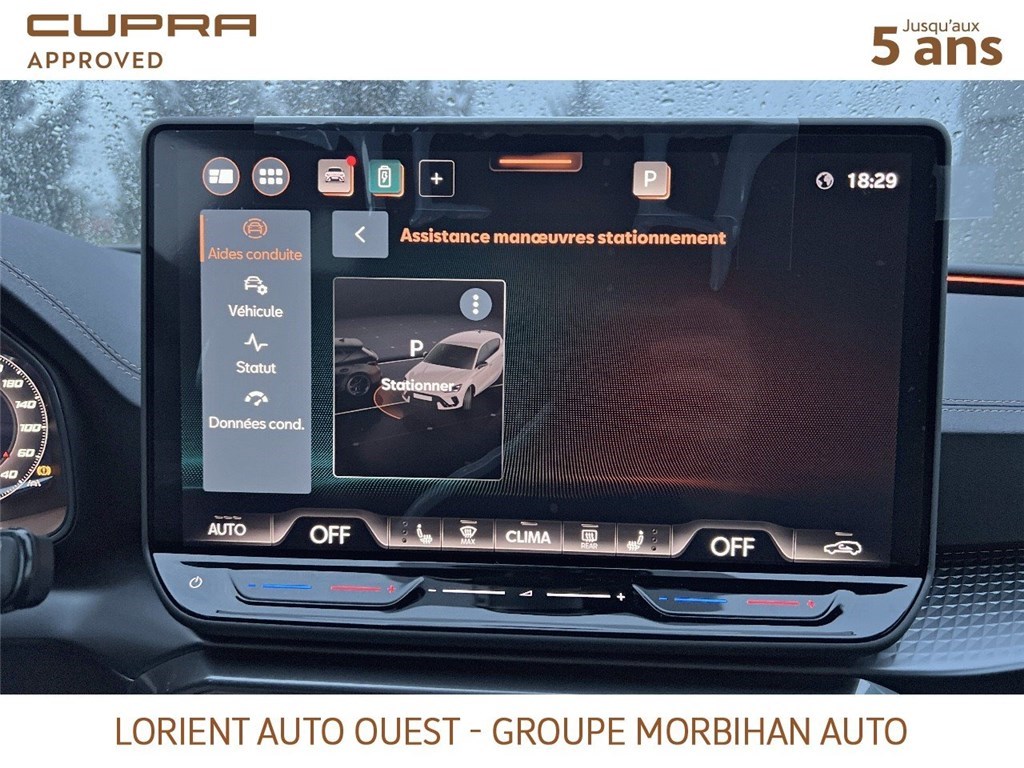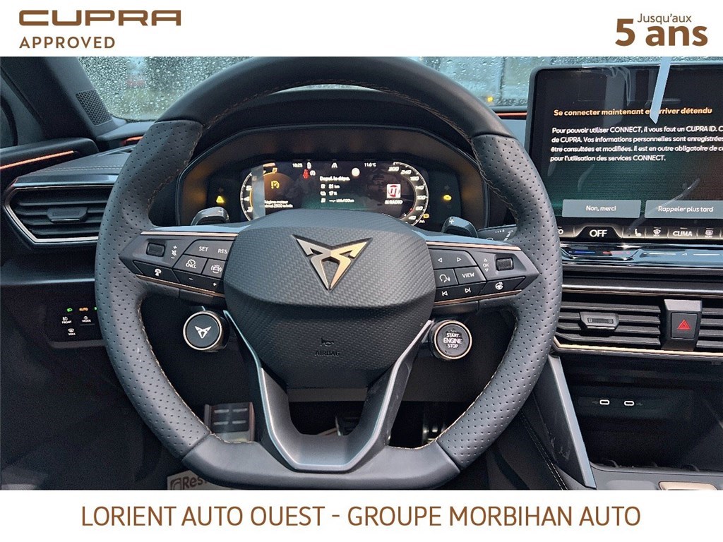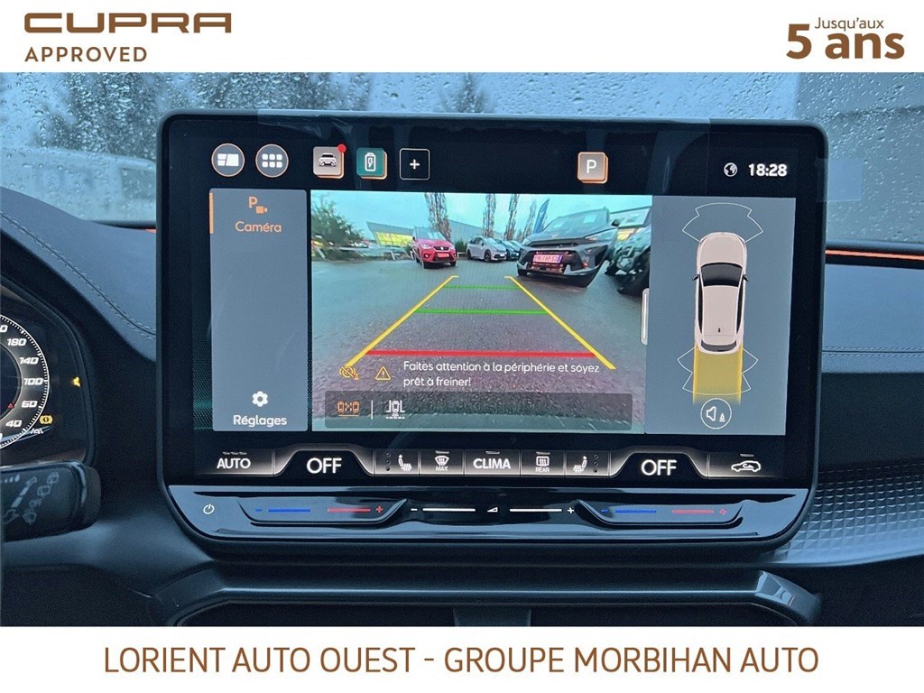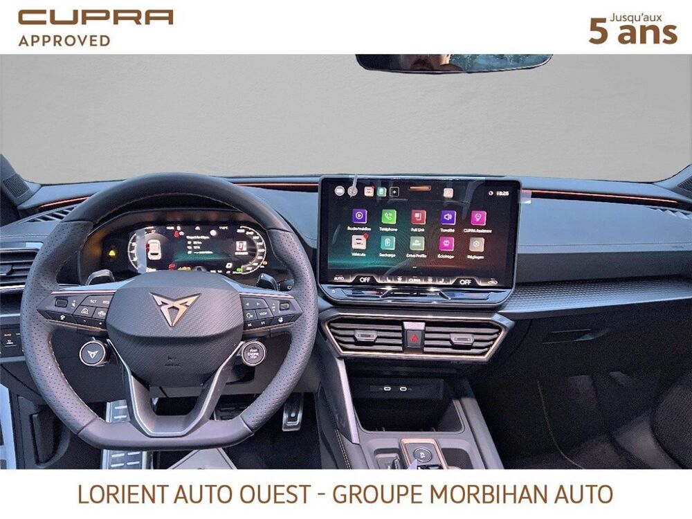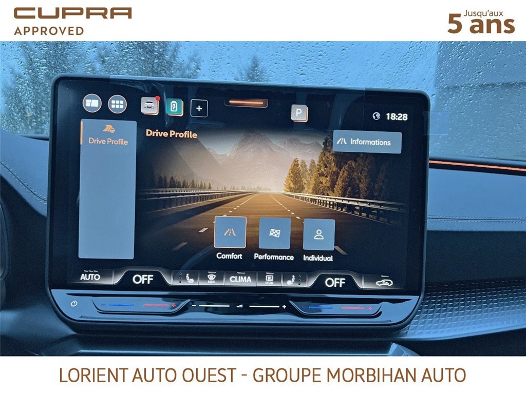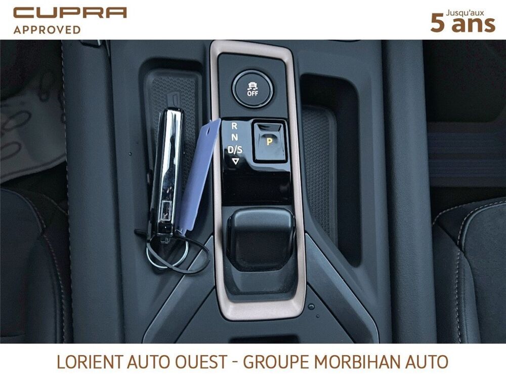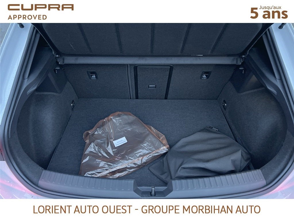 - Design intérieur Dynamic - Sièges baquets suédine Noir Asphalte avec poinçonnage et surpiqûres cuivrées - Logos CUPRA estampés sur les appuie-têtes - Planche de bord noire texturée avec inserts Dark Alu - Contre-portes suédine noire avec poinçonnage cuivré - Conducteur : siège électrique, dont réglage lombaire, à mémoire - Passager : réglage manuel de la hauteur et lombaire - Conducteur + passager chauffants
