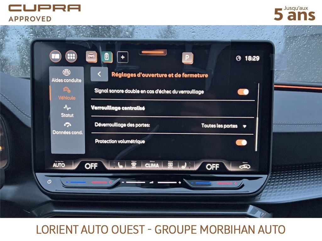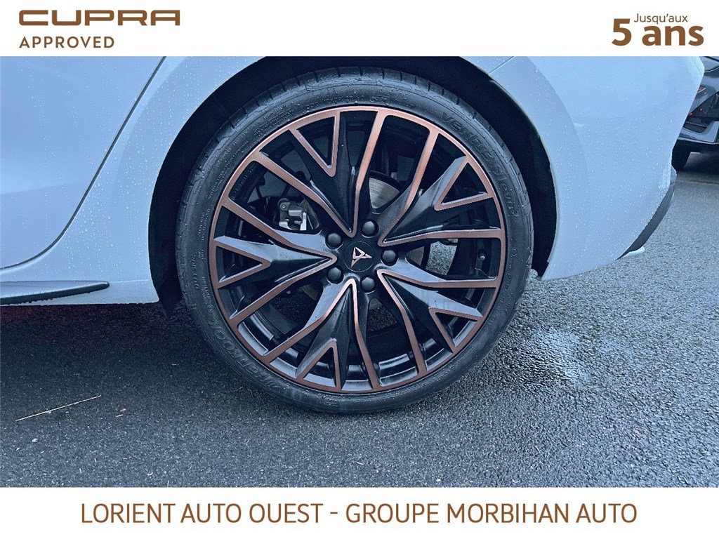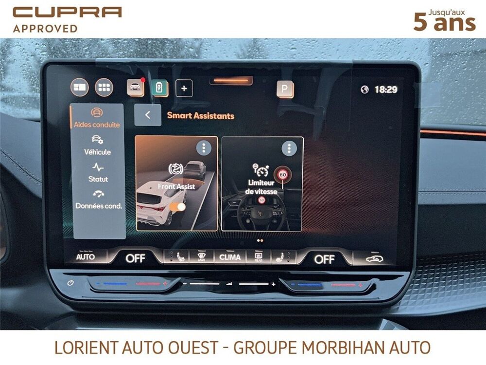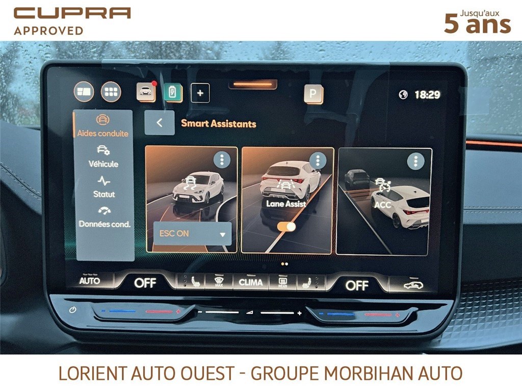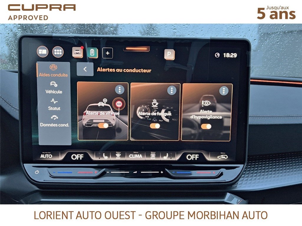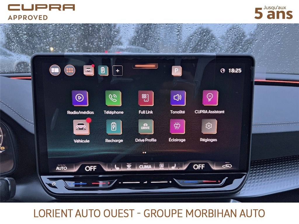 - Design intérieur Dynamic - Sièges baquets suédine Noir Asphalte avec poinçonnage et surpiqûres cuivrées - Logos CUPRA estampés sur les appuie-têtes - Planche de bord noire texturée avec inserts Dark Alu - Contre-portes suédine noire avec poinçonnage cuivré - Conducteur : siège électrique, dont réglage lombaire, à mémoire - Passager : réglage manuel de la hauteur et lombaire - Conducteur + passager chauffants