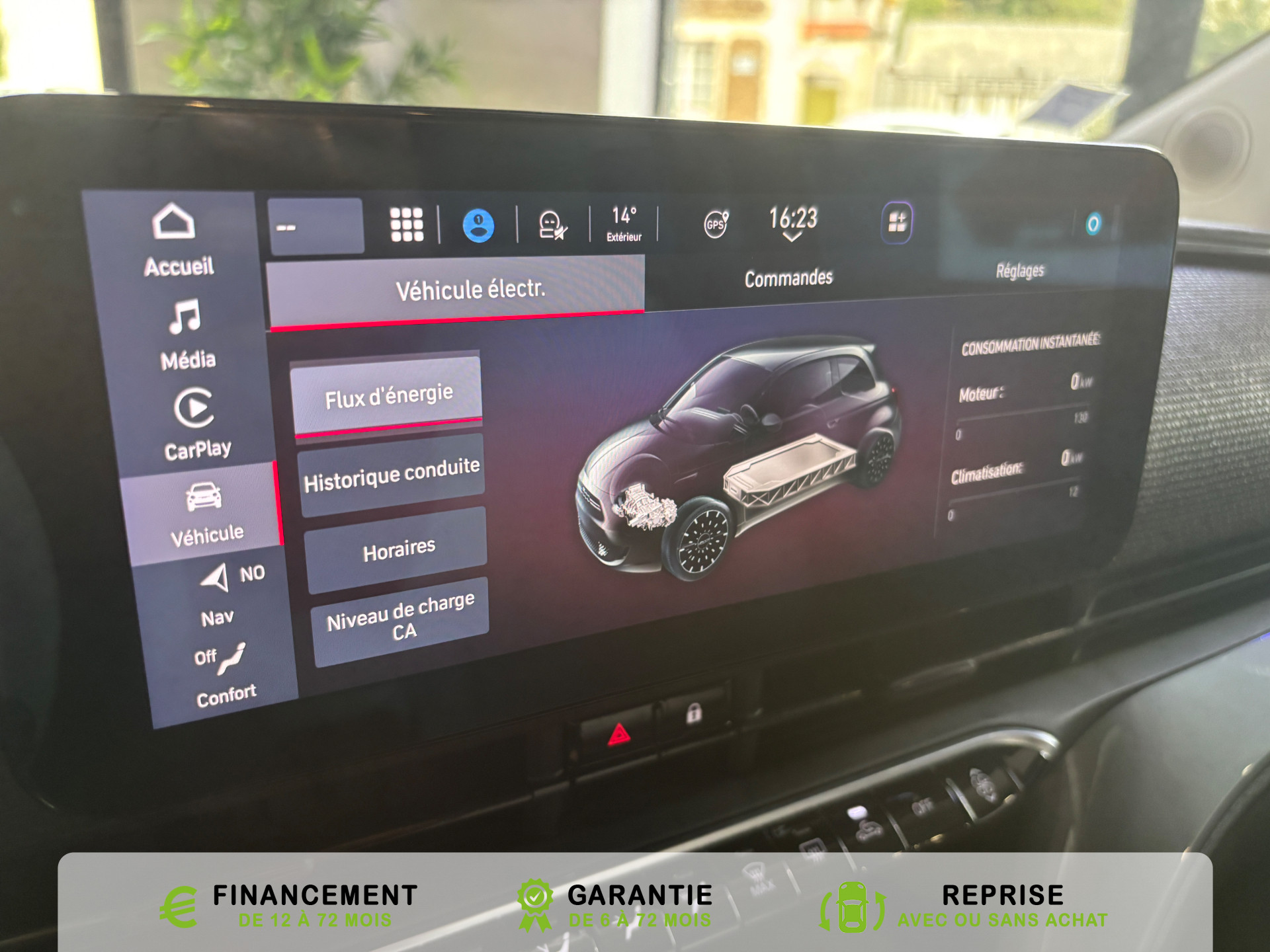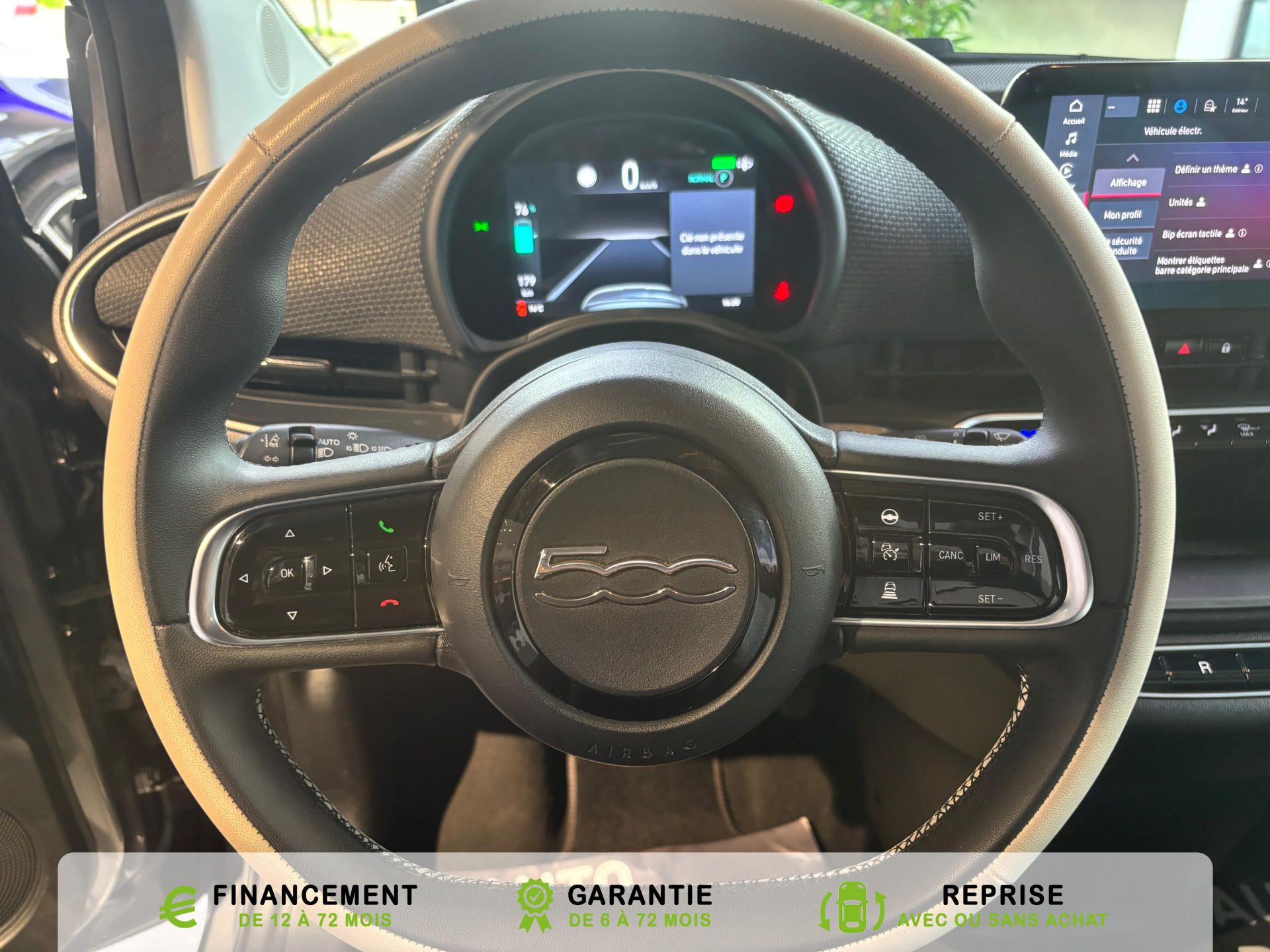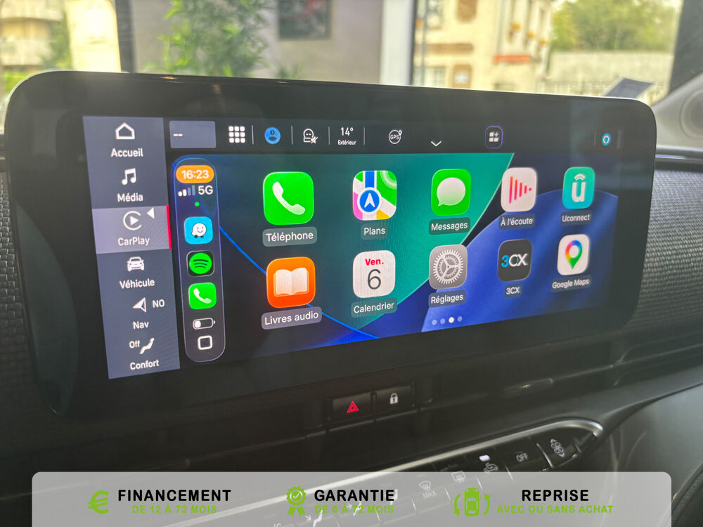 Equipements supplémentaires : Alerte franchissement de ligne LDWS, Appel d'urgence, Apple CarPlay et Android Auto sans fil, ATTENTION - Equipements non communiques, Cable mode 2 (2,3 kW), Capteur de luminosite, Capteur de pluie, Cle specifique en forme de galet, Climatisation automatique, Contours de vitres chromes, Demarrage sans cle, Detecteur de fatigue, Feux de jour a LED, Frein a main electrique, Freinage autonome d'urgence avec detection de pieton et de cycliste, Garantie 2 ans, Garantie batteries 42 kW : 8 ans ou 160 000 km, Limiteur de vitesse intelligent, Ouverture sans cle, Pack Avantage, Prise charge rapide (85kW), Radar de recul, Reconnaissance panneaux, Regulateur de vitesse, Selecteur de mode de conduite, Sellerie Tissu Seaqual gris/bleu + Planche de bord couleur carrosserie, Services connectes via application smartphone, Siege conducteur avec 4 reglages, Sieges AV avec 4 reglages, Systeme audio a 4 HP, Systeme Uconnect 10,25'' avec navigation, Toit vitre panoramique, Vitres full electriques ouverture/fermeture par telecommande, Volant eco-cuir, Cable de recharge Mode 3, Coloris de personnalisation Onyx Black, Kit Novetud, Pack Confort, Pack Magic Eye, climatisation automatique, GPS, caméra de recul, BLUETHOOTH TELEPHONE, FEUX ESSUIE GLACE AUMATIQUE, Régulateur de vitesse adaptatif ACC.