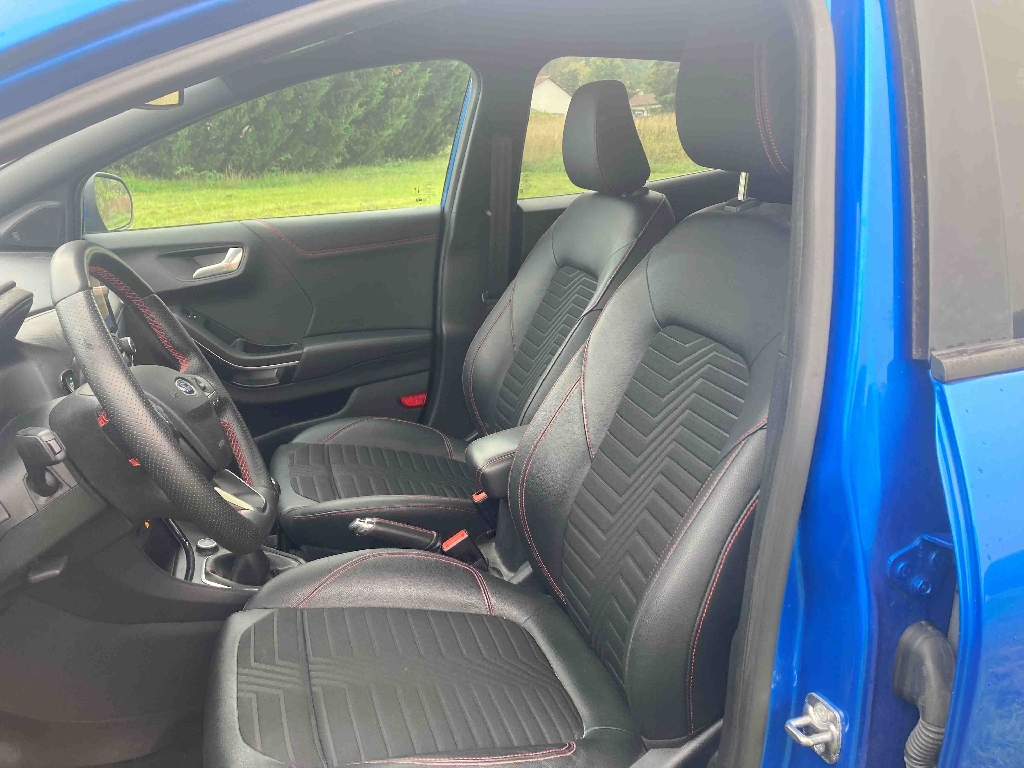 2 Fixations ISOFIX aux places AR, 3 appuis-tête AR, 5 ceintures de sécurité 3 points, 5 Modes de conduite sélectionnables (normal, eco, sport, faible adhérence, trail), Aide au démarrage en côte, Aide au maintien dans la voie avec détection des bas-côtés, Aide au stationnement AR, Air conditionné automatique, Airbags frontaux, latéraux (thorax) et rideaux, Alerte de ceinture de sécurité AV/AR, Alerte de franchissement involontaire de ligne, Allumage automatique des essuie-glaces, Allumage automatique des feux, Badges extérieurs ST-Line, Banquette AR rabattable 60/40, Becquet AR couleur carrosserie, Bouton de démarrage "Ford Power", Combiné d'instrumentalisation numérique 12.3" avec Ecomode, Console centrale avec accoudoir et rangements, Correcteur électronique de trajectoire (ESP), Désactivation de l'airbag passager, Direction assistée électrique, Disques de frein AV et AR, Eclairage d'ambiance intérieur, Environnement noir, Feux antibrouillard AV avec fonction éclairage d'angle, Feux AR à LED, Feux de jour à LED, Feux de route intelligents - Commutation automatique des feux de route aux feux de croisement, FordPass Connect avec modem embarqué et fonction E-Call, Frein AV et AR à disques, Grille de calandre ST-Line, Jantes alliage 18" 5x2 branches finition Black Matt (pour pneus 215/50 R18 92H), Kit de carrosserie ST-Line, Kit de réparation pneumatique, Levier de frein à main gainé de simili cuir, Levier de frein à main Sensico, Levier de vitesse gainé de simili cuir avec insert aluminium, Levier de vitesses Sensico avec insert aluminium, Limiteur de vitesse intelligent (affichage instantané des limitations de vitesse sur le tableau de bord), Pack Confort, Pare-brise acoustique, Pédalier Aluminium, Peinture non métallisée Bleu Abysse, Peinture non métallisée Rouge Racing, Phares antibrouillard AV avec fonction éclairage des angles, Plancher de coffre ajustable, Plaques de seuil de portes AV ST-Line, Recharge de téléphone par induction, Reconnaissance des panneaux de signalisation, Régulateur de vitesse, Rétroviseur intérieur électrochrome, Rétroviseurs extérieurs couleur carrosserie électriques, Sellerie Mixte noire tissu Tire on Casual et simili cuir Salerno, Sellerie Mixte tissu noir Tire on Casual avec renforts lateraux en Sensico Salemo et surpiqures rouges, Sellerie tissu noir Alhambra, Siège conducteur réglable en hauteur avec réglage lombaire, Siège passager réglable en hauteur avec réglages lombaire, Sortie d'echappement chromée, Suspension Sport, Système audio B&O avec radio numérique DAB, Système audio B&O avec SYNC3 avec écran tactile 8", Système de navigation Europe et points d'intérêts Michelin, Système de prévention de collision avec freinage post-collision et détection piétons, Système de surveillance de la pression des pneus, Système MyKey (seconde clé programmable), Tapis de sol AV/AR avec surpiqûres, Trappe Easy Fuel, Verrouillage centralisé à distance, Vitres AR surteintées, Vitres AV électriques à impulsion haut/bas, Vitres AV/AR électriques à impulsion haut/bas, Volant à méplat 3 branches ST-Line avec surpiqûres, 6 vitesses, 5 places, puissance fiscal : 6, puissance din : 125, émission de CO2 : 97 g/km.