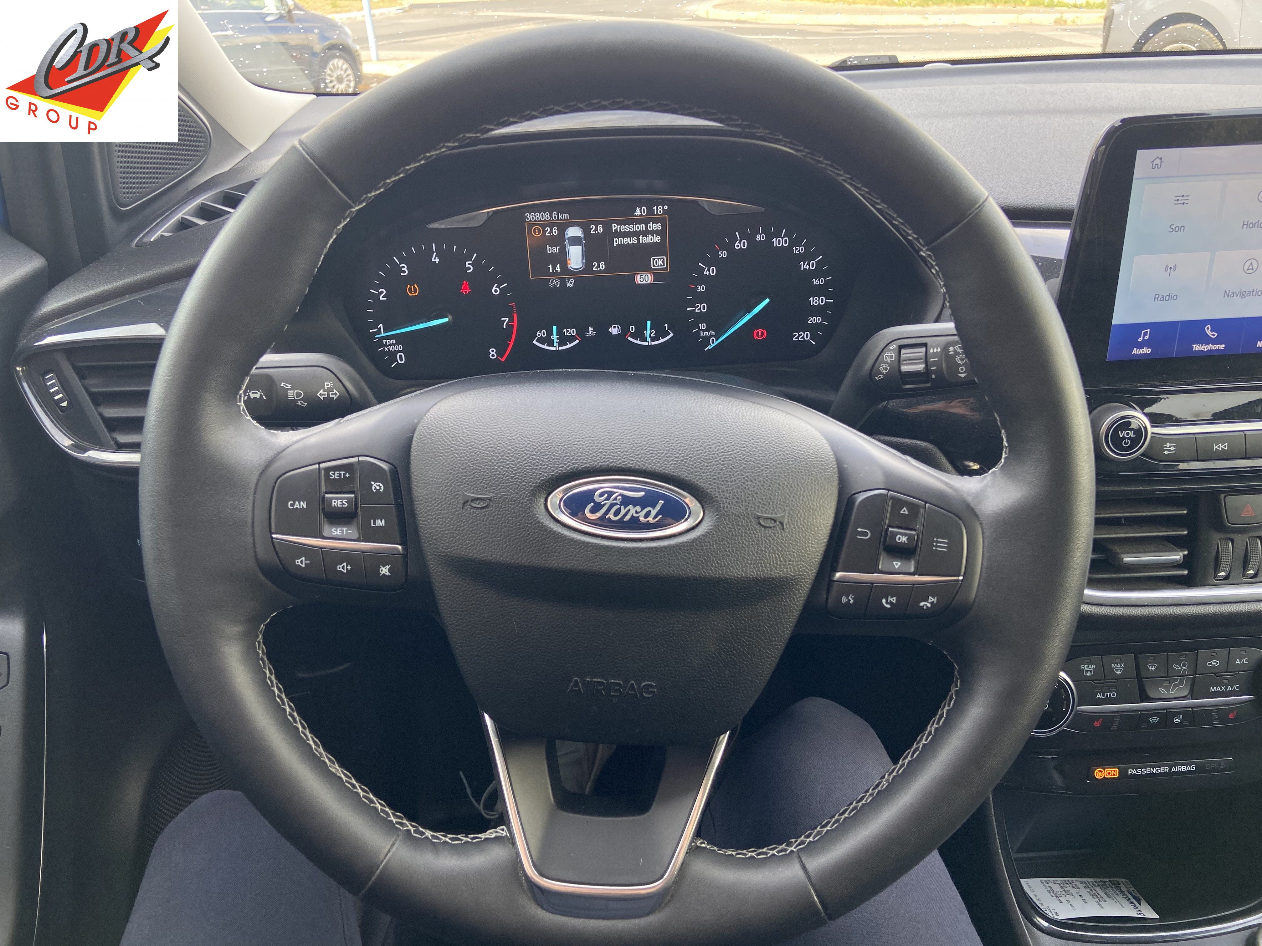 Hors contrat de service et assurances facultatives diverses Equipements supplémentaires : 2 Fixations ISOFIX aux places AR, 3eme appui-tete AR, 5 ceintures de securite 3 points, 5 Modes de conduite selectionnables (normal, eco, sport, faible adherence, trail), Aide au demarrage en cote, Aide au maintien dans la voie avec detection des bas-cotes, Aide au stationnement AR, Air conditionne manuel, Airbags frontaux, lateraux (thorax) et rideaux, Alerte de ceinture de securite AV/AR, Alerte de franchissement involontaire de ligne, Allumage automatique des feux, Banquette AR rabattable 60/40, Becquet couleur carrosserie, Console centrale avec accoudoir et rangements, Contours de vitres noir brillant, Correcteur electronique de trajectoire (ESP), Desactivation de l'airbag passager, Direction assistee electrique, Disques de frein AV, Eclairage d'ambiance interieur, Environnement noir, Feux AR a LED, Feux de jour a LED, Feux de route intelligents - Commutation automatique des feux de route aux feux de croisement, FordPass Connect avec modem embarque et fonction E-Call, Grille de calandre avec barres horizontales et contour facon chrome, Kit de reparation pneumatique, Levier de frein a main Sensico, Levier de vitesse Sensico, Limiteur de vitesse intelligent (affichage instantane des limitations de vitesse sur le tableau de, Pare-brise acoustique, Pare-chocs couleur carrosserie, Peinture non metallisee Bleu Abysse, Peinture non metallisee Rouge Racing, Phares antibrouillard AV avec fonction eclairage des angles, Plancher de coffre ajustable, Plaques de seuil de portes AV Titanium, Recharge de telephone par induction, Reconnaissance des panneaux de signalisation, Regulateur de vitesse, Retroviseurs exterieurs couleur carrosserie electriques, degivrants et rabattables electriquement, Sellerie tissu noir Alhambra, Siege conducteur massant reglable en hauteur avec soutien lombaire, Siege conducteur reglable en hauteur avec soutien lombaire, Siege passager massant reglable en hauteur avec soutien lombaire, Siege passager reglable en hauteur avec soutien lombaire, Sieges Sport, Systeme de navigation Europe et points d'interets Michelin, Systeme de prevention de collision avec freinage post-collision et detection pietons, Systeme de surveillance de la pression des pneus, Systeme MyKey (seconde cle programmable), Tapis de sol AV avec surpiqures, Tapis de sol AV/AR avec surpiqures, Trappe Easy Fuel, Verrouillage centralise a distance, Vitres AV electriques a impulsion haut/bas, Vitres AV/AR electriques a impulsion haut/bas, Volant 3 branches Sensico, Peinture metallisee Fashion Bleu Island, Vitres AR surteintees.