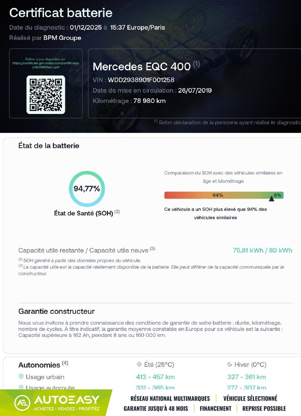 Mercedes EQC 400 4MATIC 408 EDITION 1886 * Soh 94,7% / TVA Récupérable 23192€ HT ELECTRIQUE AUTOMATIQUE 28990 euros 80000 kmContact : Romain DEJESSE