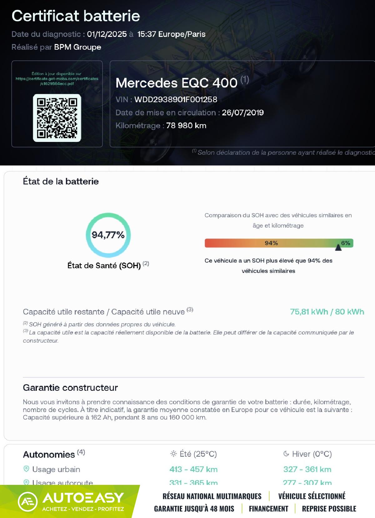 Mercedes EQC 400 4MATIC 408 EDITION 1886 * Soh 94,7% / TVA Récupérable 23192€ HT ELECTRIQUE AUTOMATIQUE 27990 euros 80000 kmContact : Romain DEJESSE