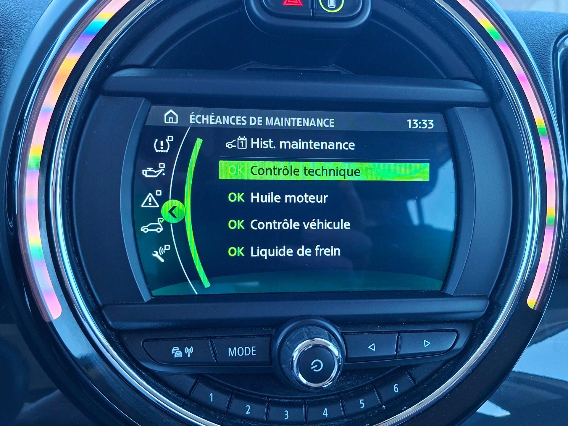 Equipements supplémentaires : 3eme feu stop a LED dans le spoiler de toit, 4HP et 2 woofers, ABS, Accoudoir central AV, Airbags de tete pour les 4 places exterieures, Airbags frontaux pour conducteur et passager AV, Airbags lateraux AV, Appel d'urgence intelligent, Appuis-tetes AV/AR, Autoradio MINI Visual Boost, Avertisseur de risque de collision et systeme anti-collision, Baguette en chrome sur le pourtour inferieur de toutes les vitres, Boite de vitesses 7 rapports a double embrayage, Buses de lave-glace et retroviseurs exterieurs degivrants, Clignotants blancs, Climatisation manuelle, Colour Line Carbon Black, Controle Dynamique de stabilite DSC, Coques de retroviseurs exterieurs couleur carrosserie, Correcteur electronique de freinage, Detecteur de pluie et allumage automatique des projecteurs, Dossier de banquette AR, rabattable en trois parties 40:20:40, Eclairage de la boite a gants a LED (blanc), Eclairage du coffre a LED, a droite (blanc), Eclairage en cascade (orange), Eclairage interieur et liseuses a LED a l'AV/a l'AR (blanc), Ecrous de roues antivol, Feu de brouillard AR, Feux de stop dynamiques, Fixation ISOFIX AV avec desactivation de l'airbag passager AV, Frein a main electrique, Inserts decoratifs Hazy Grey, Kit de reparation de pneus, MINI Connected, MINI Safety (Assistance a la conduite), Ordinateur de bord multifonctions, Pack Connected Media, Poignee de hayon en schwarz a haute brillance, Poignees de portes en chrome, Poignees interieures de portes chromees, Porte-boissons AV (x2), Prise 12 V dans la console centrale AV, Projecteurs antibrouillard AV a LED, Projecteurs Full LED a faisceaux adaptatifs a fond noir, Radars de stationnement AR, Reglage en hauteur du siege passager AV, Regulateur de vitesse avec fonction freinage, Remote Services (3 ans), Services Connected Drive (3 ans), Servotronic, Sortie d'echappement simple cote gauche avec finition chromee, Surveillance de la pression des pneumatiques, Systeme de verrouillage centralise, TeleServices, Touches multifonctions sur le volant avec regulateur de vitesse, Triangle de presignalisation, Volant Sport gaine Cuir, Accoudoir central AV, Climatisation automatique bi-zone.