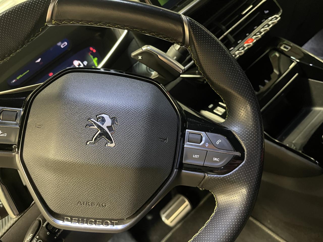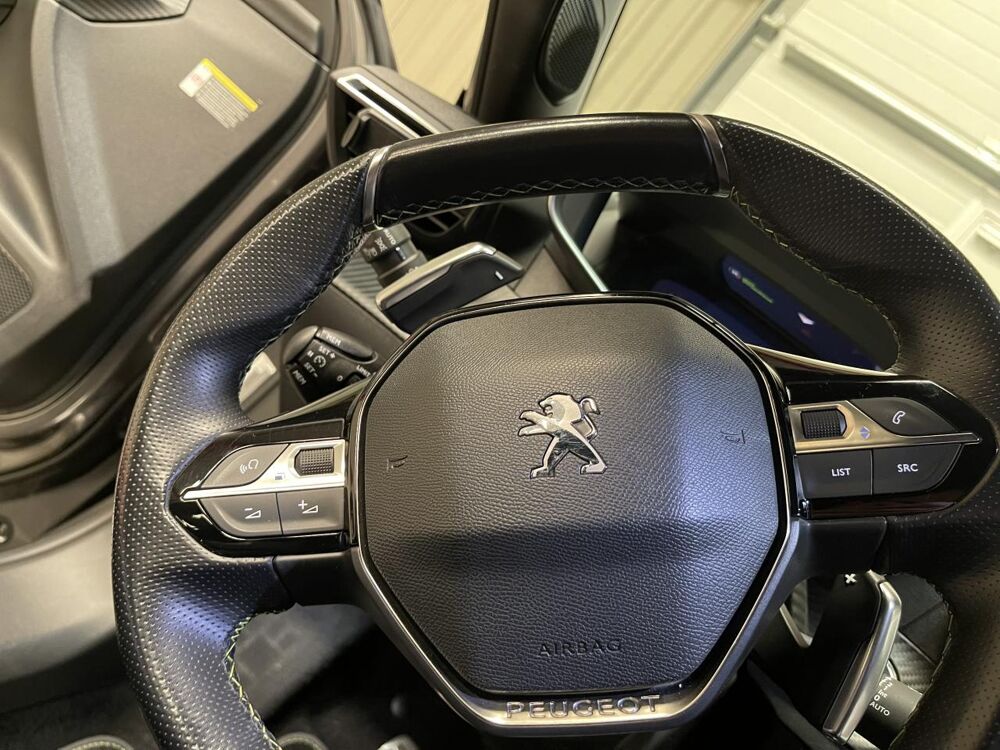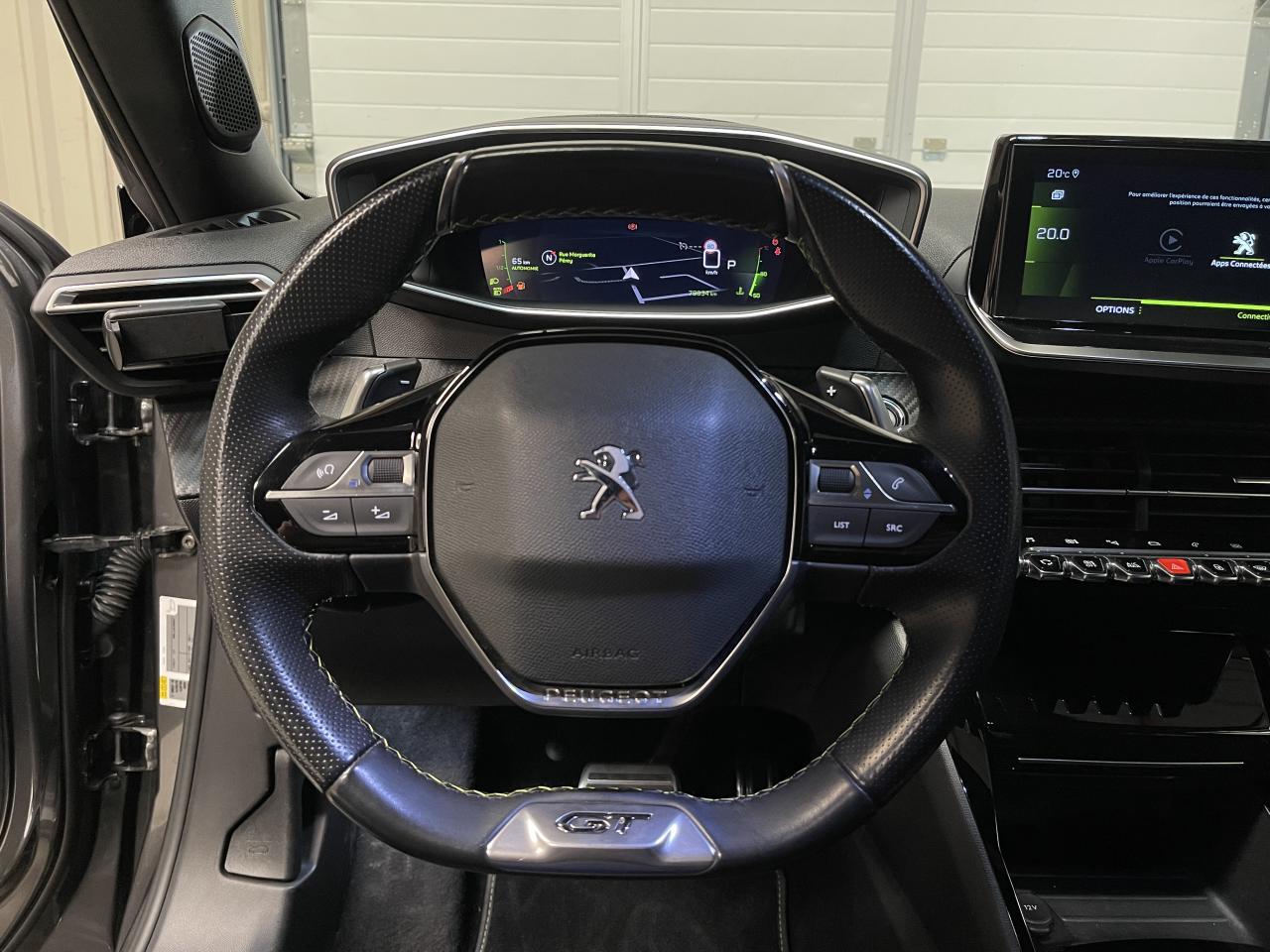 Volant compact cuir fleur avec laçage vert, Lion chromé, badge GT, commandes multimédia sur volant