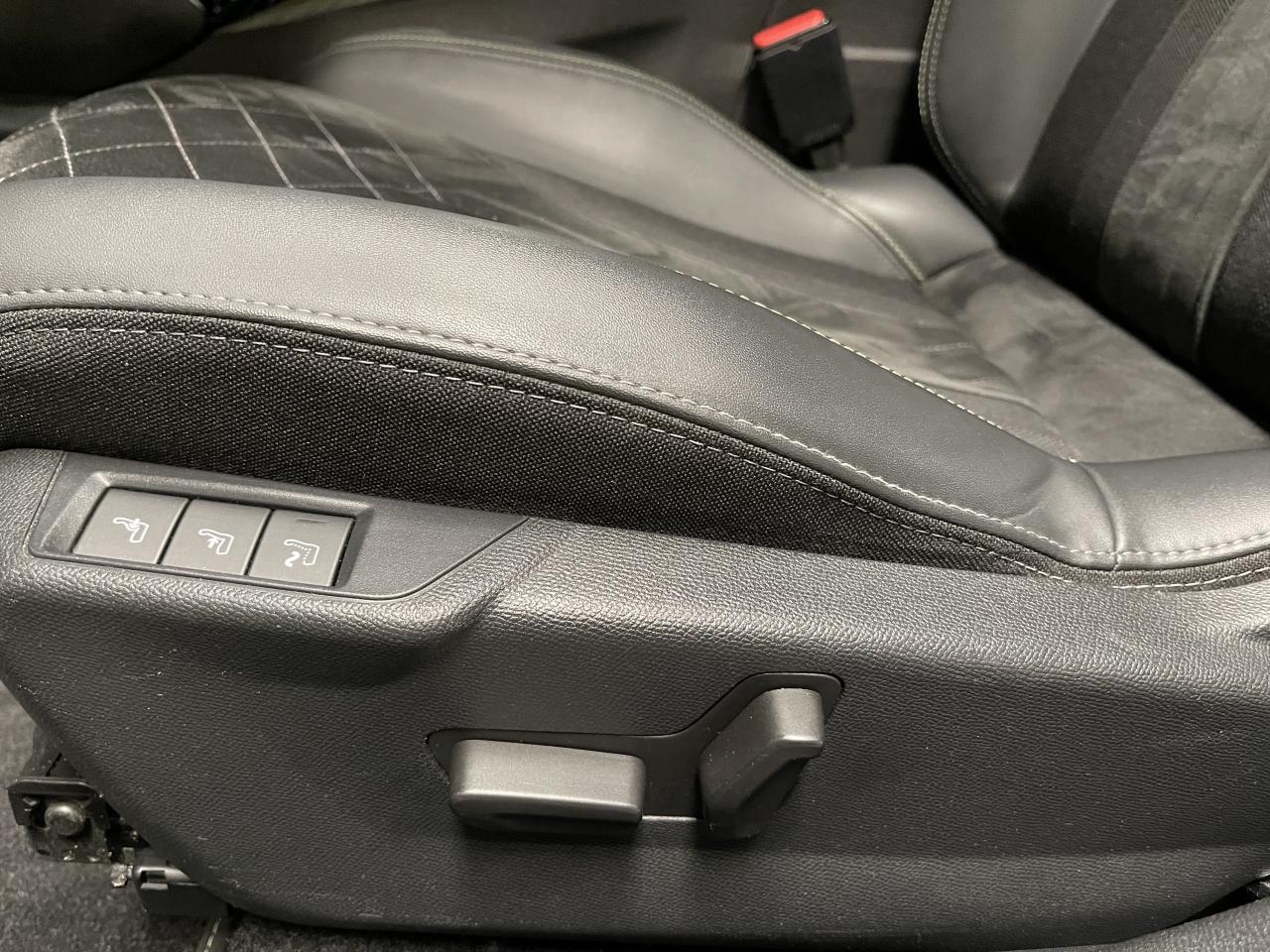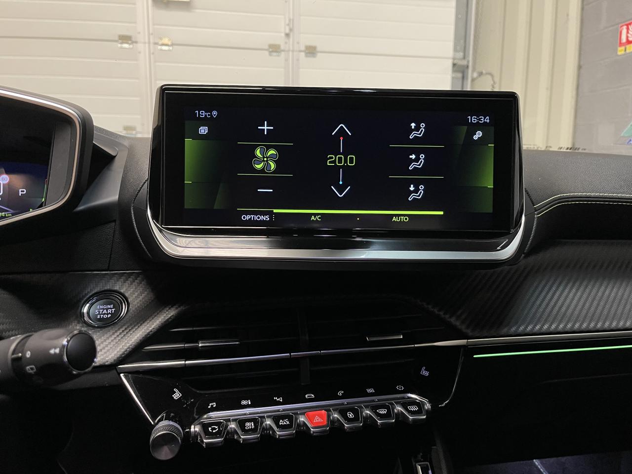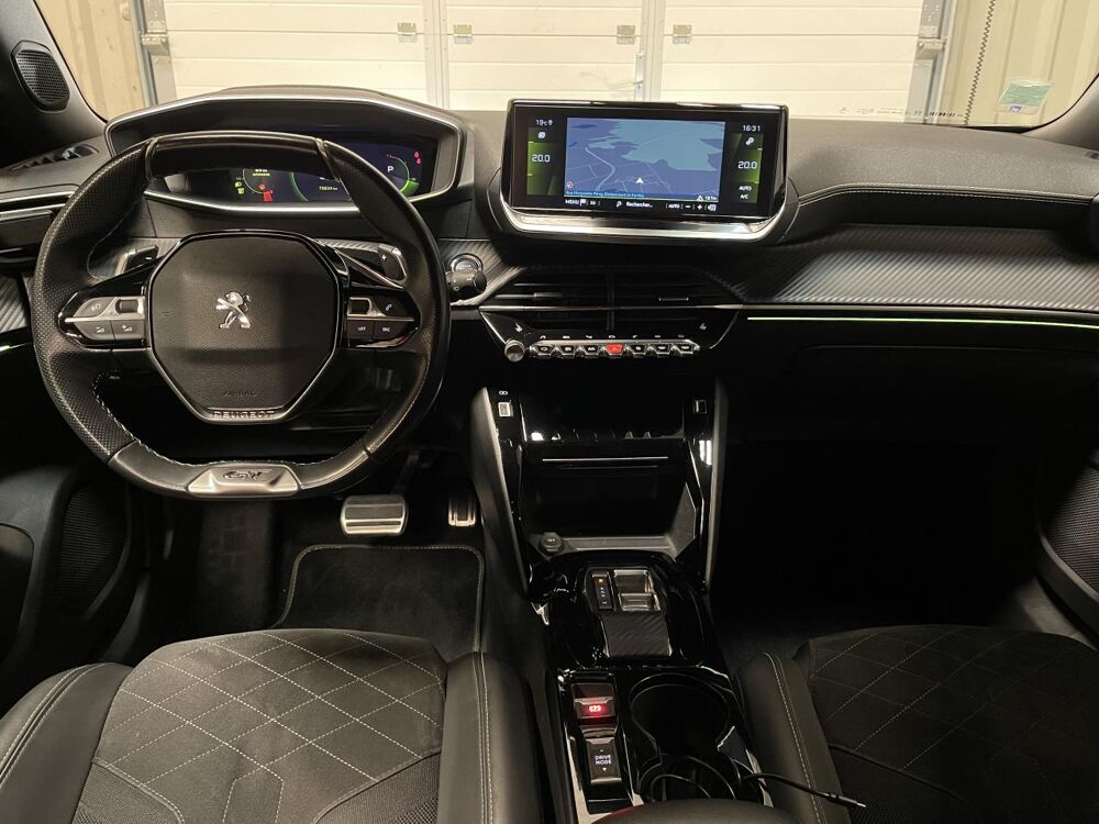 Volant compact cuir fleur avec laçage vert, Lion chromé, badge GT, commandes multimédia sur volant