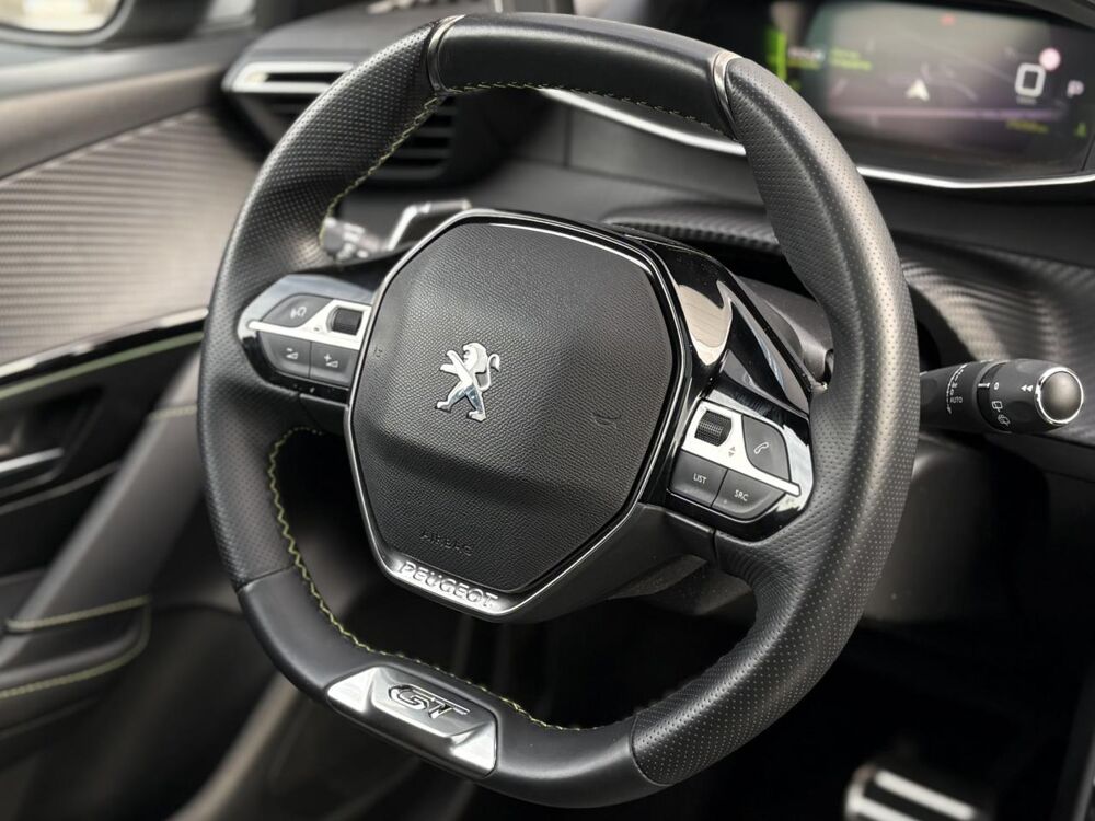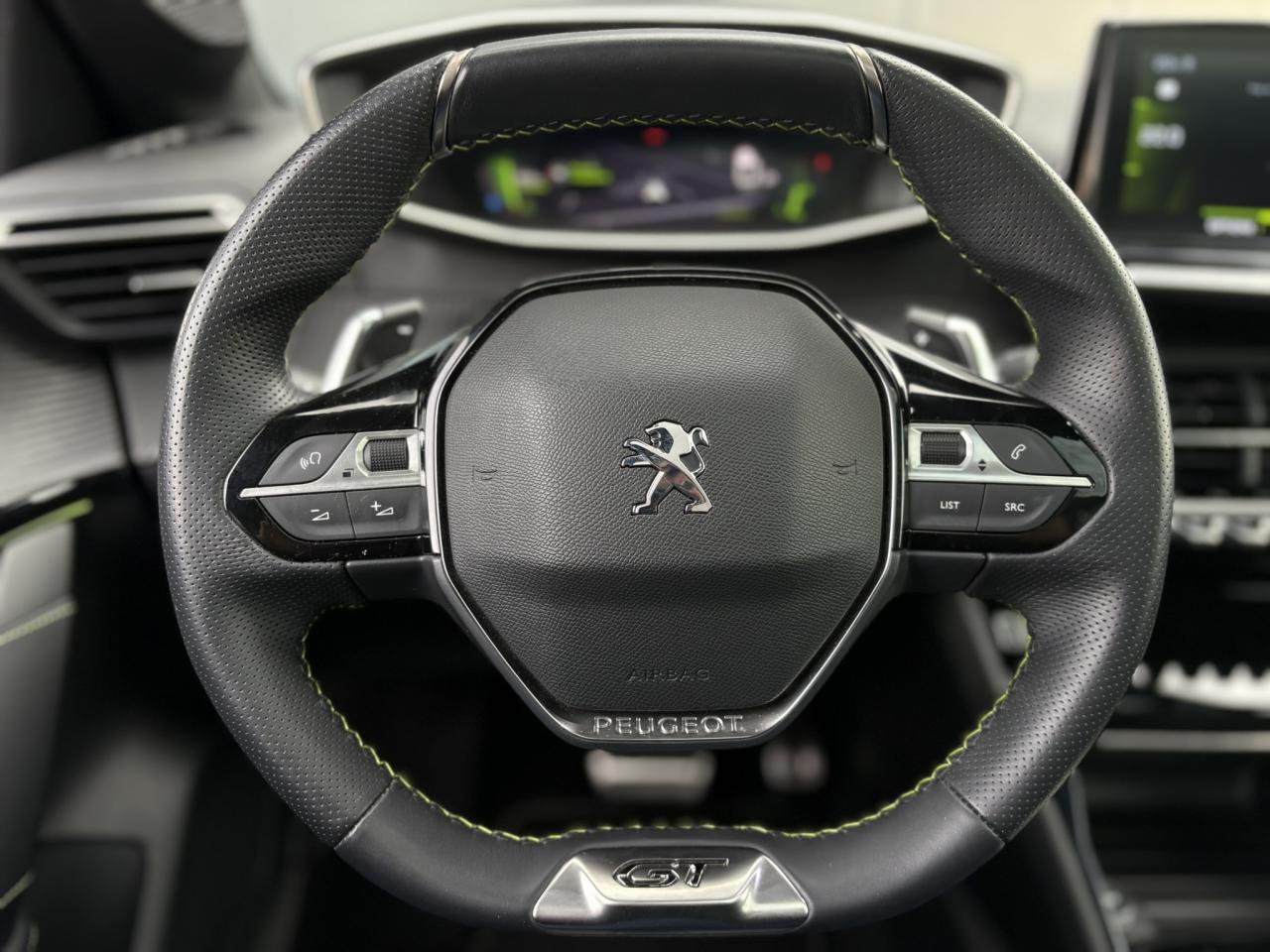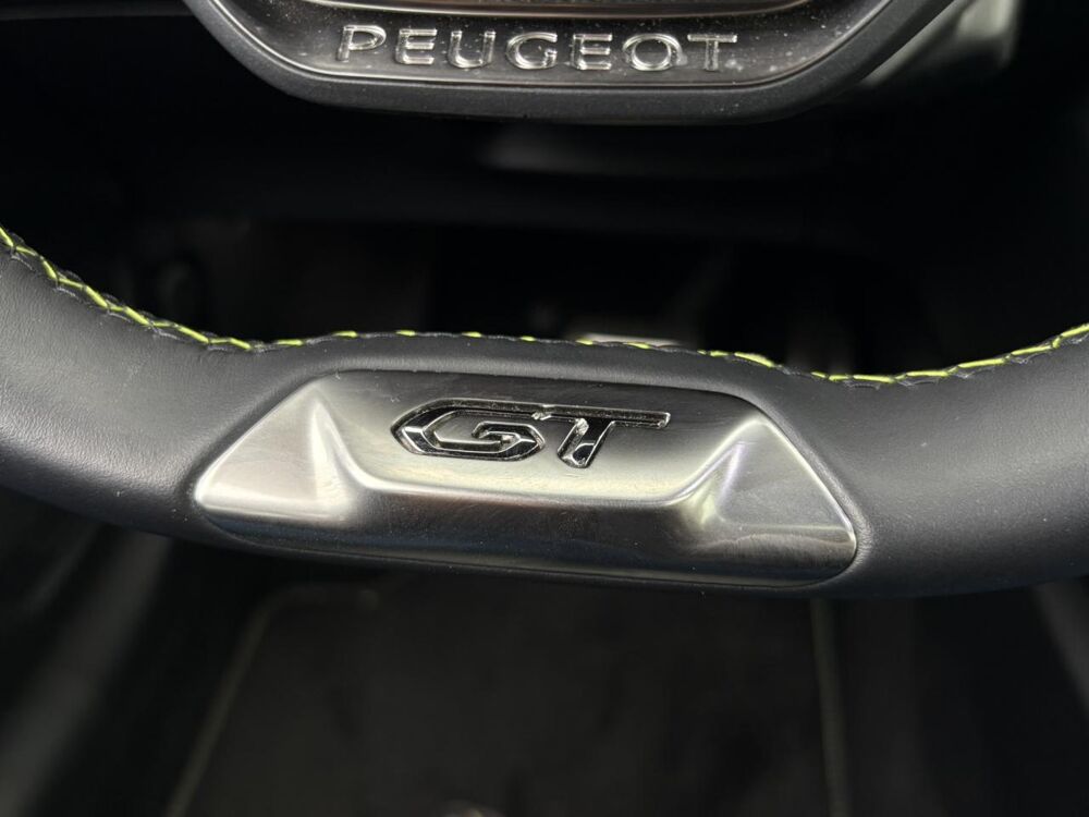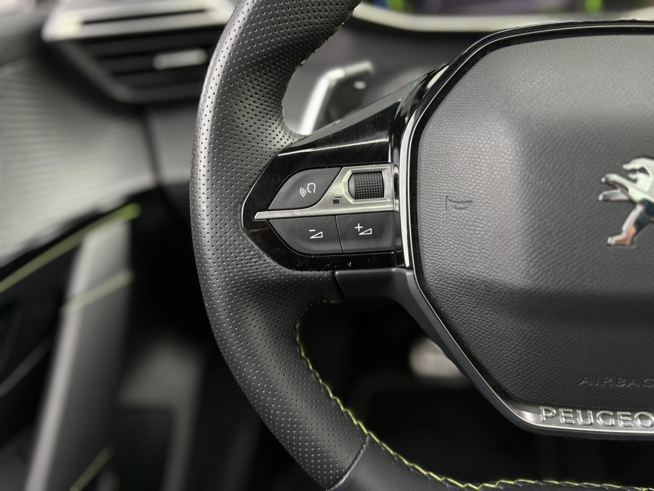 Volant compact cuir fleur avec laçage vert, Lion chromé et badge GT et commandes multimédia sur volant
