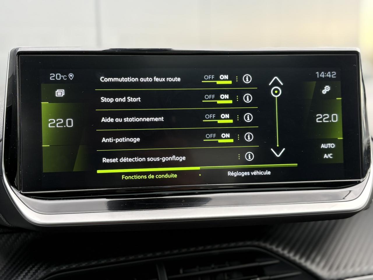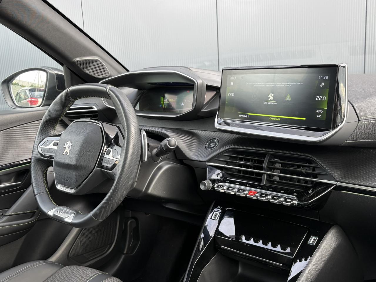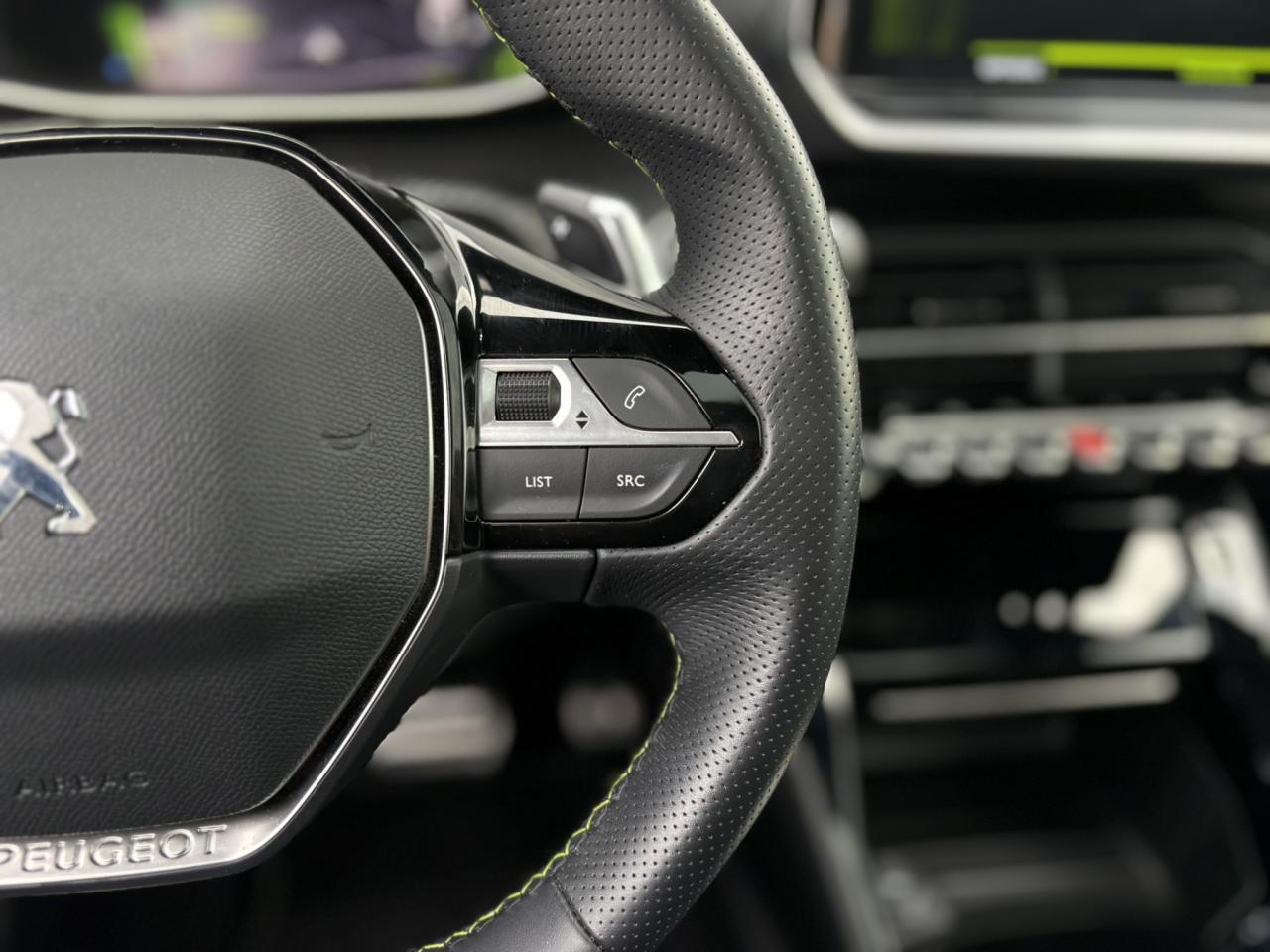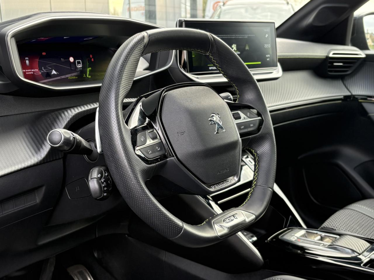 Volant compact cuir fleur avec laçage vert, Lion chromé et badge GT et commandes multimédia sur volant