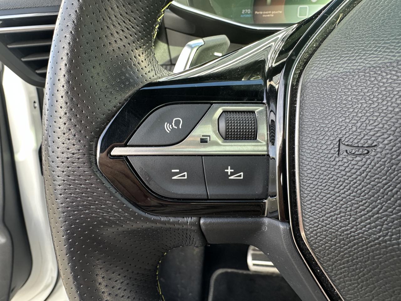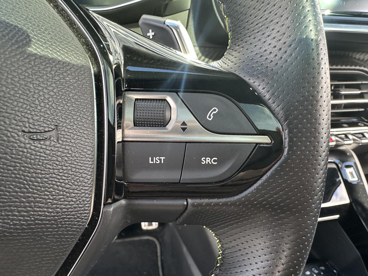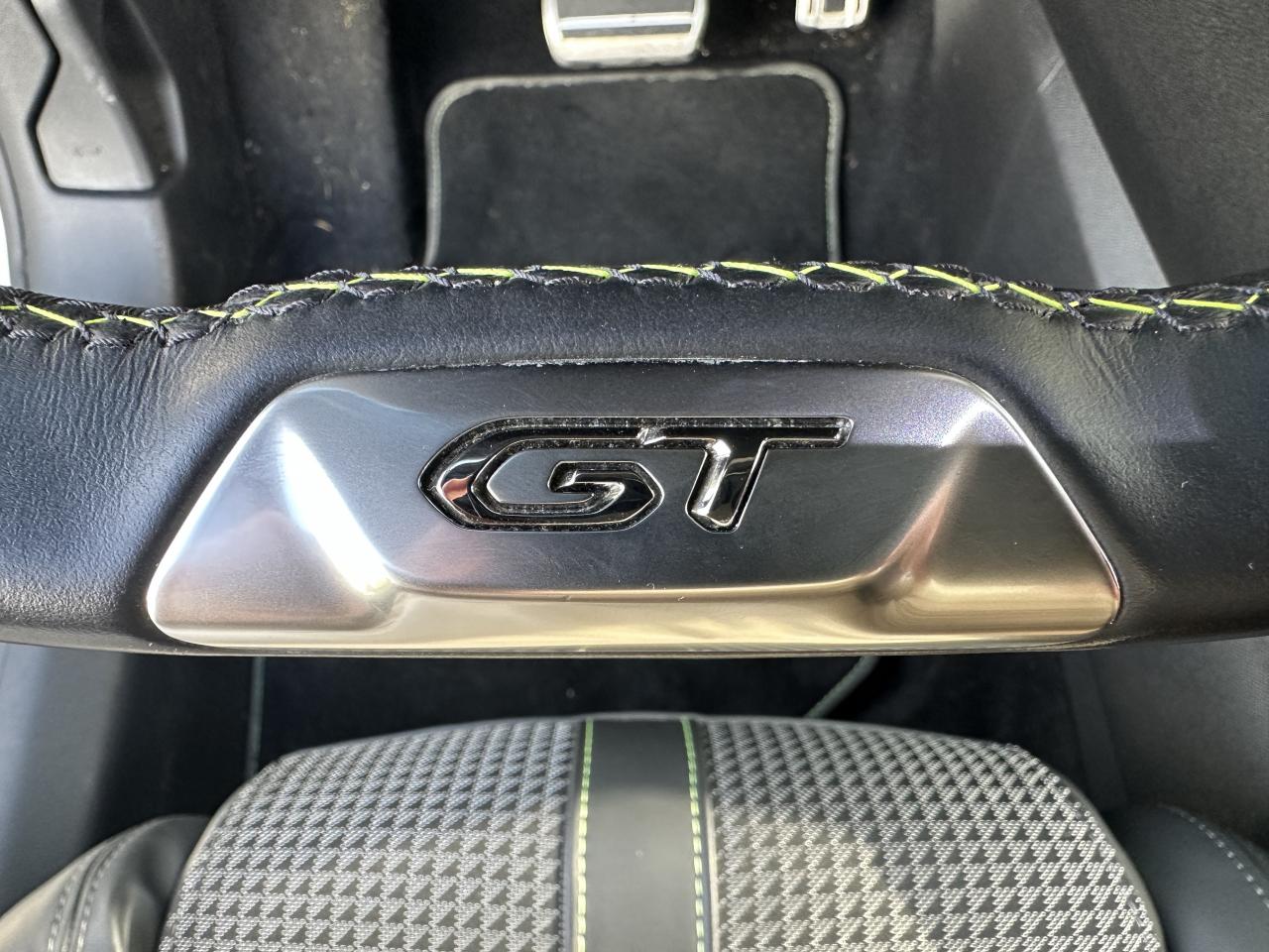 Volant compact cuir fleur avec laçage vert, Lion chromé et badge GT et commandes multimédia sur volant