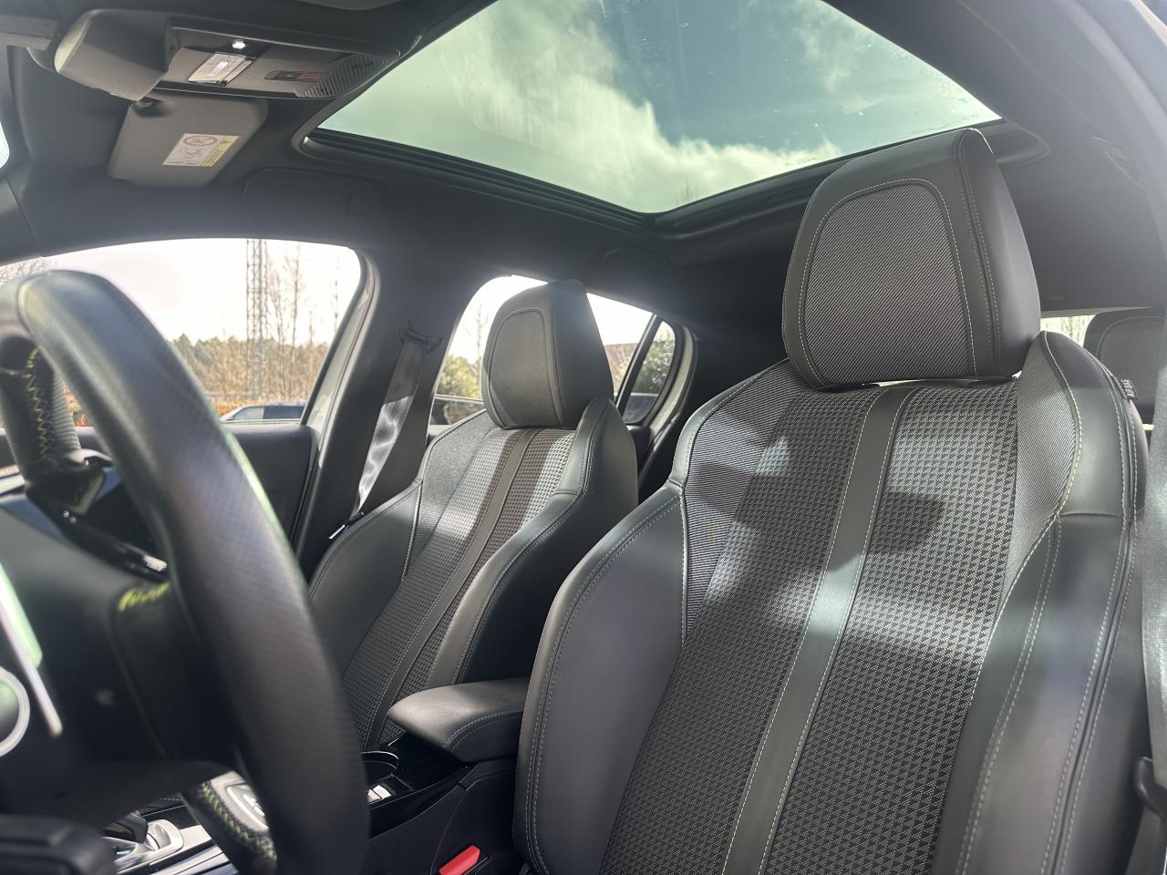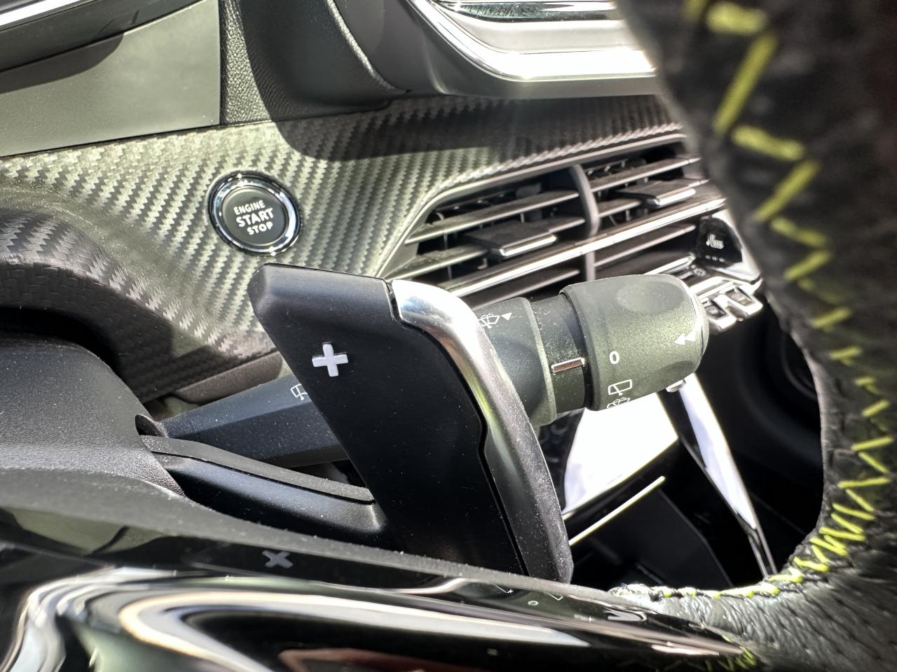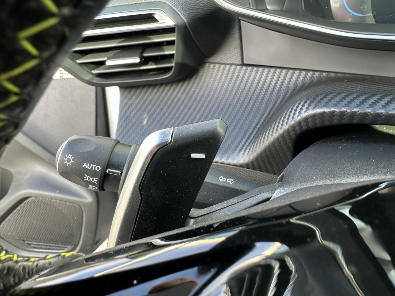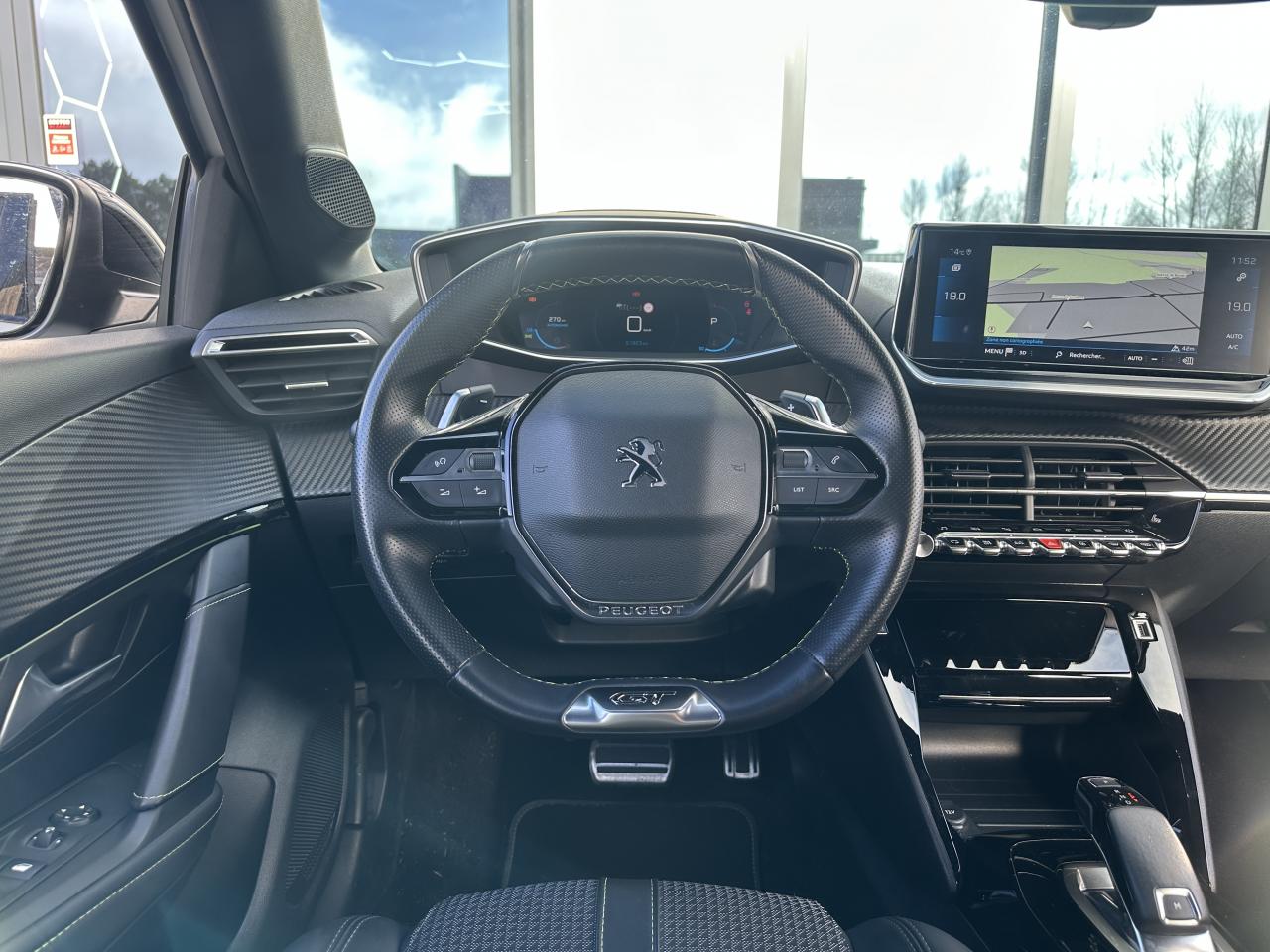 Volant compact cuir fleur avec laçage vert, Lion chromé et badge GT et commandes multimédia sur volant