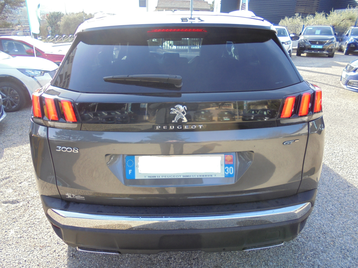 PEUGEOT 3008 (BlueHDi 180ch EAT8 GT) GRIS.Roue de secours galette,Attelage rdso,Accès et démarrage mains libres,Aide au stationnement AR,Aide au stationnement AV,Air conditionné automatique bi-zone,Banquette rabattable 1/3 - 2/3,Commande de verrouillage à distance (2 plips),Détection de sous-gonflage indirecte,Driver Sport Pack,Ecran tactile capacitif 8,Essuie-vitre AR avec enclenchement automatique en marche AR,Fixations pour 3 sièges enfants suivant norme ISOFIX aux places passager AV et latérales AR,Fonction DAB (Radio Numérique Terrestre),Fonction Mirror Screen (Apple Carplay / Android Auto / MirrorLink),Frein de stationnement électrique avec aide au démarrage en pente,Hayon mains libres,Lève-vitres AV et AR électriques séquentiels avec antipincement,Mirror Screen,Mise en tablette du siège passager,Navigation connectée 3D avec reconnaissance vocale,Nouveau PEUGEOT i-Cockpit avec dalle numérique tête haute,Pack City 1,Pack Visibilité,Peugeot Connect,Plancher de coffre 2 positions,Prise USB (dans la zone connectique),Prises 12 V (x 3 : zone connectique,Radio bi-tuner,Reconnaissance des panneaux de vitesse et préconisation de vitesse,Régulateur / Limiteur de vitesse,Rétroviseurs extérieurs électriques dégivrants,Rétroviseurs extérieurs rabattables électriquement avec éclairage d'accueil à LED,Sécurité enfants électrique des vitres AR,Siège conducteur à réglage lombaire,Siège conducteur mécanique réglable en hauteur,Siège passager AV mécanique réglable en hauteur,Surtapis AV et AR,Verrouillage automatique des ouvrants en roulant,Vitres latérales AR et lunette AR surteintées,Volant Cuir pleine fleur perforé avec bagues chromé et badge GT, 8 vitesses, 5 places, puissance fiscal : 9, puissance din : 180, émission de CO2 : 0 g/km.