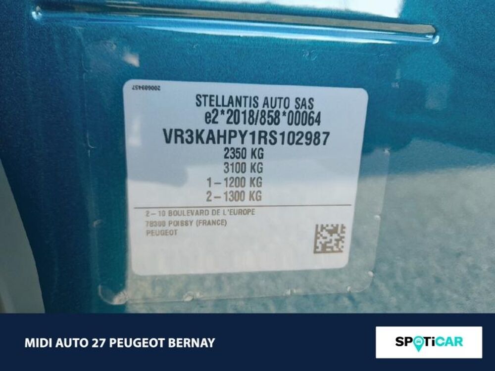 Bleu Obsession (M),Pack 360° Vision & Drive Assist,Pack Panoramic Navigation,Origine Peugeot france avec malus payé,2 sièges arrière supplémentaires,6 Haut parleurs,ABS,Accoudoir central AV avec rangement,AFIL,Aide au démarrage en côte,Aide au freinage d'urgence,Airbag conducteur,Airbag passager,Airbag passager déconnectable,Airbags latéraux avant,Airbags rideaux,Airbags rideaux AR,Allumage des phares automatique,Antipatinage,Appel d'Assistance Localisé,Appel d'Urgence Localisé,Appuis-tête avant actifs,Banquette 40/20/40,Banquette AR rabattable,Banquette coulissante,Becquet arrière,Bleu Ingaro (M),Boite à gants éclairée et réfrigérable,Boite à gants fermée,Caméra de recul,Capteur de pluie,Ceintures avant ajustables en hauteur,Clim automatique tri-zones,Commande Climatisation AR,Commandes du système audio au volant,Commandes vocales,Démarrage sans clé,Détecteur de sous-gonflage,Dispositif freinage automatique,EBD,Eclairage au sol,Ecran multifonction couleur,Ecran tactile,ESP,Feux arrière à LED,Feux de jour à LED,Fixations Isofix aux places arrières,Follow me home
