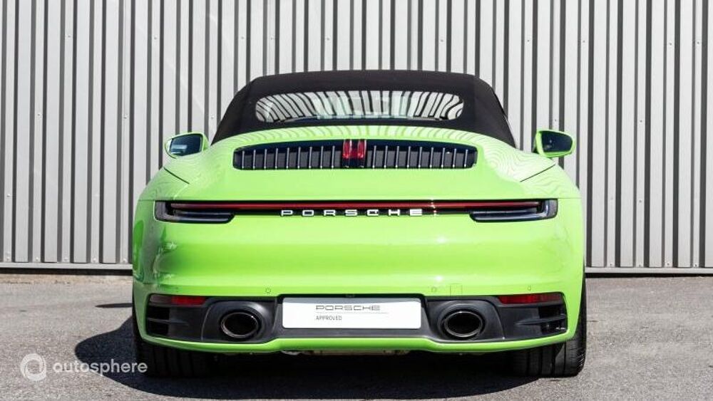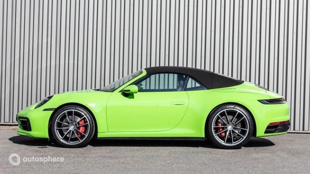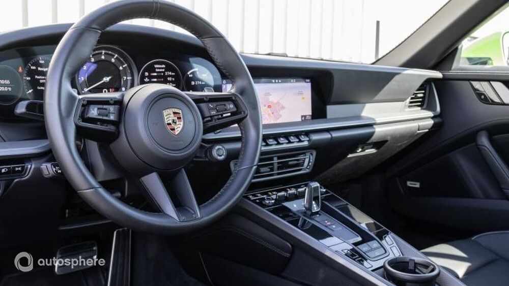 Equipements: 8 Haut parleurs, ABS, Accoudoir central AV avec rangement, Aide au démarrage en côte, Aide au freinage d'urgence, Airbag conducteur, Airbag passager, Airbags latéraux avant, Airbags rideaux, Alarme, Alarme volumétrique, Antidémarrage électronique, Antipatinage, Appel d'Assistance Localisé, Appel d'Urgence Localisé, Arrêt et redémarrage auto. du moteur, Bacs de portes avant, Banquette 50/50, Banquette AR rabattable, Becquet arrière, Boite à gants fermée, Borne Wi-Fi, Caméra de recul, Capote électrique, Capote souple, Capteur de luminosité, Capteur de pluie, Clim automatique bi-zones, Commande du comportement dynamique, Commandes vocales, Compte tours, Contrôle de couple en courbe, Contrôle de Traction, Contrôle élect. de la pression des pneus, Démarrage sans clé, Différentiel à glissement limité, Disque dur multimédia, EBD, Echappement à double sortie, Ecran multifonction couleur, Ecran tactile, ESP, Feux arrière à LED, Feux de jour à LED, Feux de position à LED, Filet anti-remous, Filtre à particules, Filtre à Pollen, Fixations Isofix aux places arrières, Follow me home, Fonction MP3, Frein à main en cuir, GPS Cartographique, Inserts de porte cuir, Inserts de tableau de bord cuir, Interface Media, Jantes Alu, Kit mains-libres Bluetooth, Lecteur carte SD, Lecteur CD, Lecteur DVD, Levier vitesse cuir, Limiteur de vitesse, Lunette AR dégivrante, Ordinateur de bord, Palettes changement vitesses au volant, Phares avant LED, Poignées ton carrosserie, Porte-gobelets avant, Prise 12V, Prise auxiliaire de connexion audio, Radar de stationnement AR, Radar de stationnement AV, Radio, Régulateur de vitesse, Rétroviseurs dégivrants, Rétroviseurs électriques, Services connectés, Siège conducteur électrique, Siège conducteur réglable en hauteur, Siège passager à réglages électriques, Siège passager réglable en hauteur, Sièges avant sport, Sortie d'échappement chromée, Système de sécurité post-collisions, Température extérieure, TMC, Verrouillage centralisé des portes, Vitrage calorifuge, Vitres avant électriques, Vitres teintées, Volant cuir, Volant multifonction, Volant réglable en profondeur et hauteur, Volant sport, BOSE Surround Sound System, Bouclier avant SportDesign, Cuir Noir, Ecusson Porsche sur appuie-tête avant, JA Carrera Classic 20/21 pouces, Levier de vitesse PDK en aluminium, Monogramme arrière 911, Pack rangement, Pack Sport Chrono, Radars AV+AR + Caméra de recul+vue 360°, Radio numérique, Régulateur de vitesse adaptatif, Sièges chauffants à l'avant, Sièges Sport Plus régl élec, Système d'échappement sport Noir, Ventilation des sièges avant, Vert Lezard, Volant Sport GT en cuir