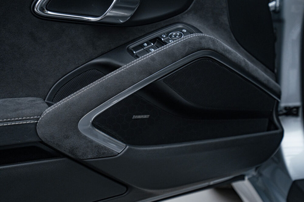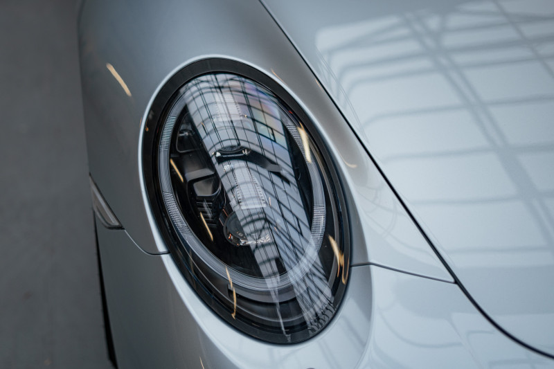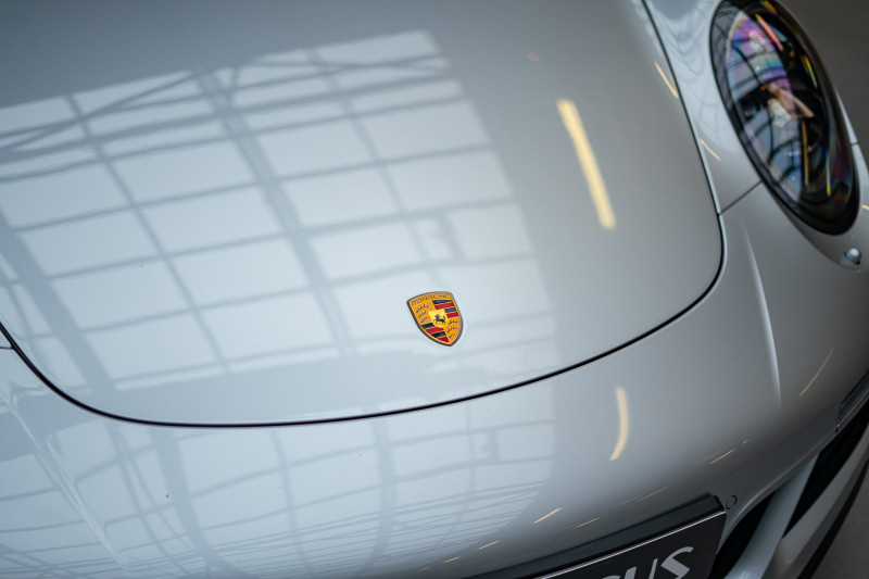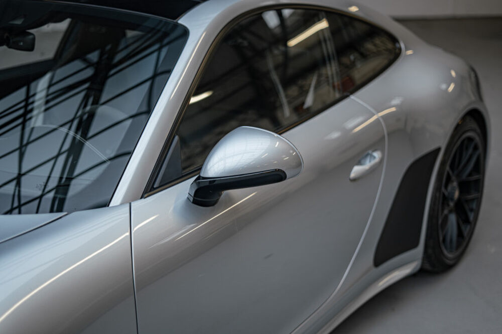Cette 911 a été configurée dans la teinte Gris Rhodium, associée à un intérieur tout en cuir noir avec surpiqûres grises.