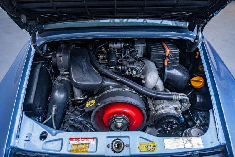 La peinture de cette auto, Horizon Blue Metallic (L37X), est particulièrement rare et recherchée sur une 964. Elle s?associe à un intérieur en cuir noir.