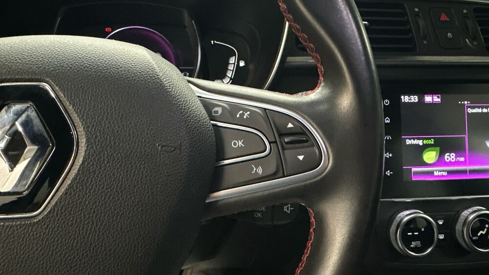 SOUS RÉSERVE D'ERREUR DE RÉDACTION ET D'OPTIONS Equipements supplémentaires : ABS + AFU, Aide au parking lateral, Airbags frontaux conducteur et passager AV, Airbags rideaux, Alerte d'oubli de ceinture de securite, Avertisseur de franchissement de ligne, Avertisseurs d'angles morts, Barres de toit longitudinales aspect chrome, Capteur de pluie et de luminosite, Cartographie Europe, Climatisation automatique bi-zone, Easy Park Assist, ESC avec ASR, Fixation ISOFIX, Frein de parking assiste, Freinage actif d'urgence, Harmonie Carbone fonce, Insert chrome sur les protections inferieures de portes, Kit de reparation, Pack Evo 2018, Peinture Blanc Glacier, Pre-equipement services connectes, Projecteurs antibrouillard, Projecteurs AV avec guides de lumiere integres, Projecteurs AV full LED Pure Vision, Reconnaissance des panneaux de signalisation, Regulateur limiteur de vitesse, Renault R-Link 2, Retroviseur interieur electrochrome, Retroviseurs exterieur electriques rabattables, Sellerie Mixte textile enduit graine / tissu carbone fonce, Sieges AV reglables en hauteur + mise en tablette du siege passager, Systeme de surveillance de la pression des pneus, Vitres et lunette AR surteintees, Volant cuir Nappa.