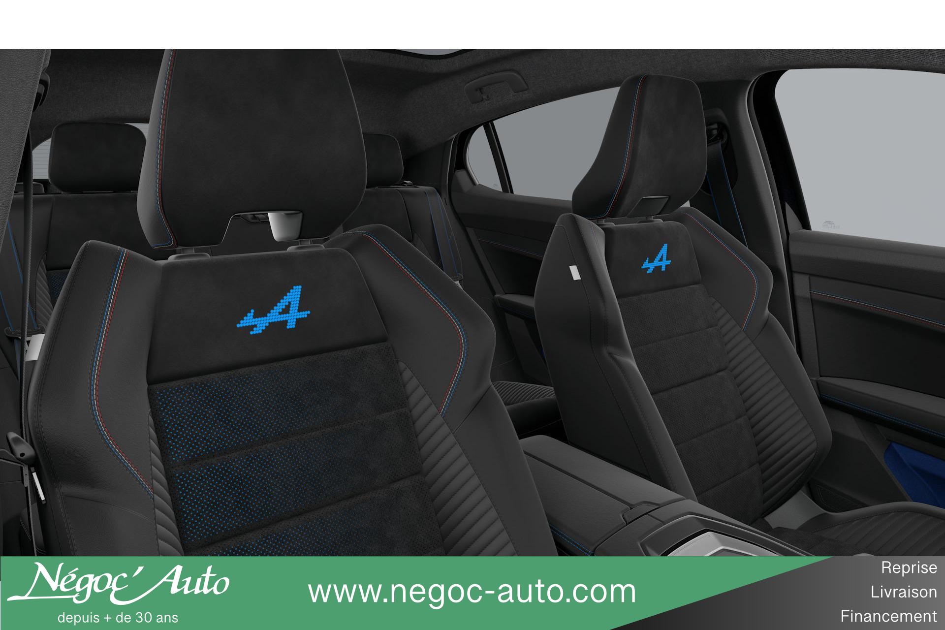 Sellerie Alcantara recyclée avec perforations bleues / tissu refined grain fin avec surpiqûres bleu / blanc / rouge