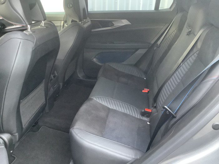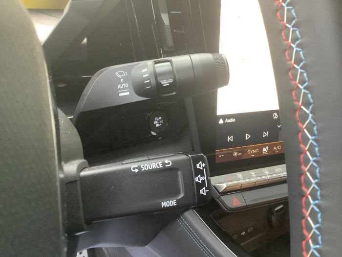 Sellerie mixte Alcantara avec surpiqures bleues et logo Alpine lumineux