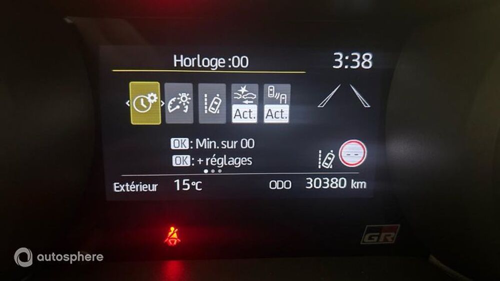 Equipements: 6 Haut parleurs, ABS, Accoudoir central AV, Affichage tête haute, AFIL, Aide au démarrage en côte, Aide au freinage d'urgence, Airbag conducteur, Airbag passager déconnectable, Airbags latéraux avant, Airbags rideaux AV et AR, Allumage des phares automatique, Antidémarrage électronique, Antipatinage, Appel d'Assistance Localisé, Appel d'Urgence Localisé, Assistance de maintient de trajectoire, Caméra de recul, Capteur de pluie, Ceinture de vitrage chromée, Clim automatique, Clim automatique bi-zones, Commandes du système audio au volant, Compte tours, Démarrage sans clé, Détecteur de sous-gonflage, Eclairage d'ambiance, Ecran multifonction couleur, Ecran tactile, ESP, Feux arrière à LED, Feux de jour à LED, Feux de route automatiques, Filtre à Pollen, Fixations Isofix aux places arrières, Freinage automatique d'urgence, GR Ultrasuede perf noir/rouge+spq rouges, Interface Media, Jantes Alu, Kit mains-libres Bluetooth, Lampe de coffre, Limiteur de vitesse, Lunette arrière surteintée, Ordinateur de bord, Phares antibrouillard, Phares avant LED, Prise USB, Radio numérique DAB, Reconnaissance panneaux de signalisation, Régulateur de vitesse adaptatif, Répartiteur électronique de freinage, Rétroviseur intérieur électrochrome, Rétroviseurs dégivrants, Rétroviseurs électriques, Rétroviseurs rabattables électriquement, Services connectés, Siège conducteur chauffant, Siège conducteur réglable en hauteur, Siège passager chauffant, Système avancé de détection d'obstacles, Système d'accès sans clé, Système d'alerte de véhicule en approche, Système d'éclairage intelligent, Système de prévention des collisions, Tablette cache bagages, Troisième ceinture de sécurité, Verrouillage centralisé à distance, Verrouillage centralisé des portes, Vitres arrière électriques, Vitres arrière surteintées, Vitres avant électriques, Vitres teintées, Volant cuir, Volant multifonction, Volant réglable en profondeur et hauteur, Bi-ton Blanc Lunaire / Toit noir, Pack Techno Plus