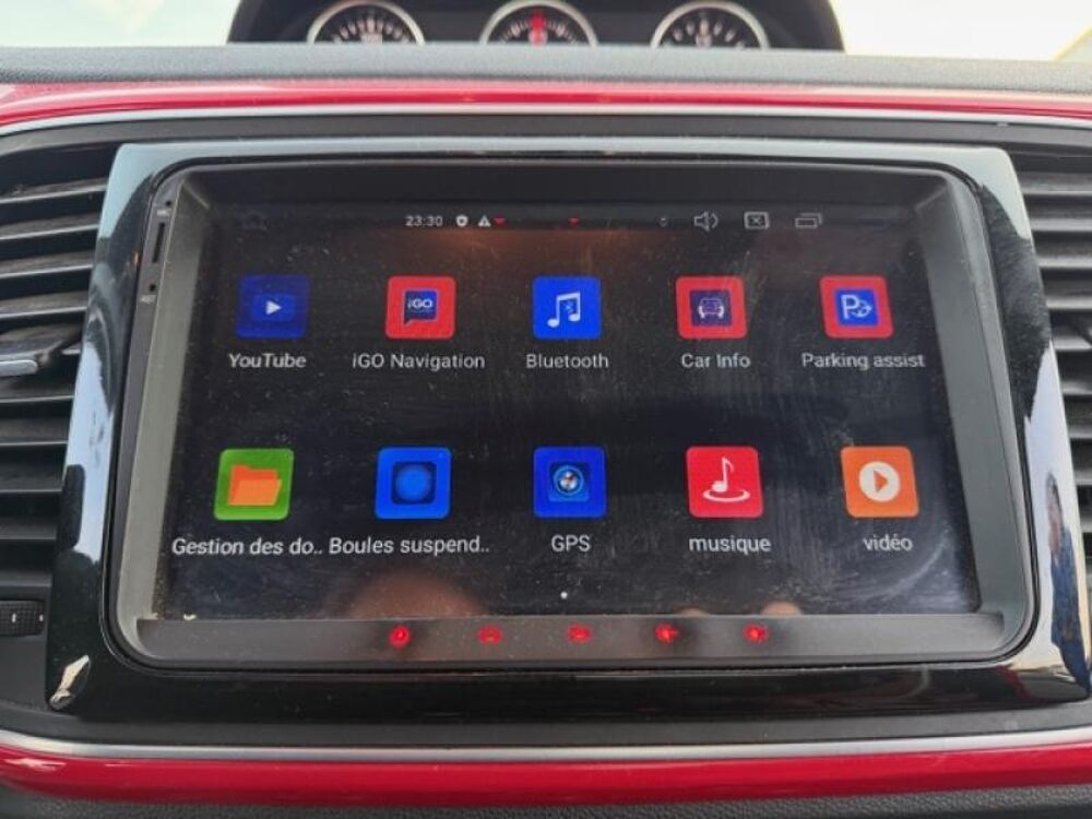 Rouge Tornado / Toit noir uni,8 Haut parleurs,ABS,Accoudoir central AV,Aide au démarrage en côte,Aide au freinage d'urgence,Airbag conducteur,Airbag passager déconnectable,Airbags latéraux avant,Airbags rideaux,Antidémarrage électronique,Antipatinage,Appui-tête conducteur réglable hauteur,Appui-tête passager réglable en hauteur,Arrêt et redémarrage auto. du moteur,Banquette 2 places,Banquette 50/50,Banquette AR rabattable,Blocage électronique du différentiel,Boite à gants fermée,Boucliers AV et AR couleur caisse,Capteur de luminosité,Capteur de pluie,Ceinture de vitrage chromée,Clim manuelle,Commandes du système audio au volant,Compte tours,Détecteur de sous-gonflage,EBD,Eclairage statique d'intersection,Ecran multifonction couleur,Ecran tactile,ESP,Filtre à Pollen,Follow me home,Fonction MP3,Frein à main en cuir,Inserts de porte métal,Inserts de tableau de bord métal,Jantes Alu,Kit mains-libres Bluetooth,Lampe de coffre,Lampes de lecture à l'avant,Lecteur carte SD,Lecteur CD,Lunette AR dégivrante,Lunette arrière,Miroir de courtoisie conducteur éclairé