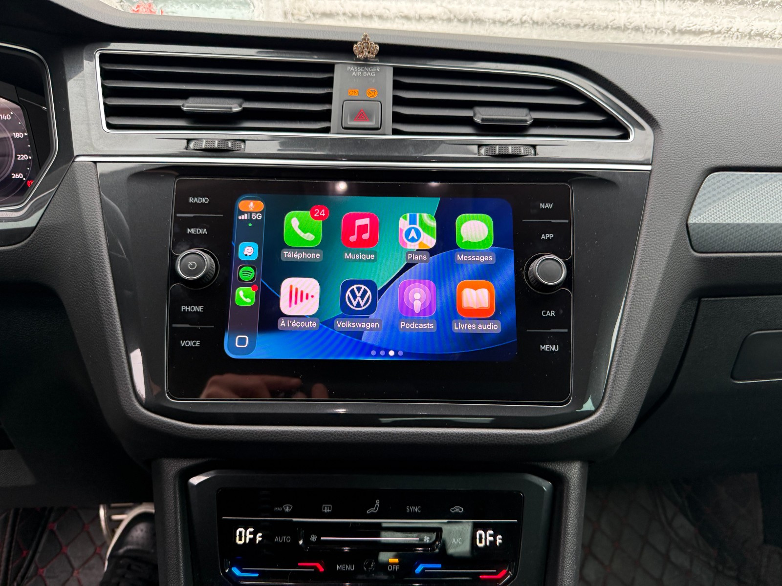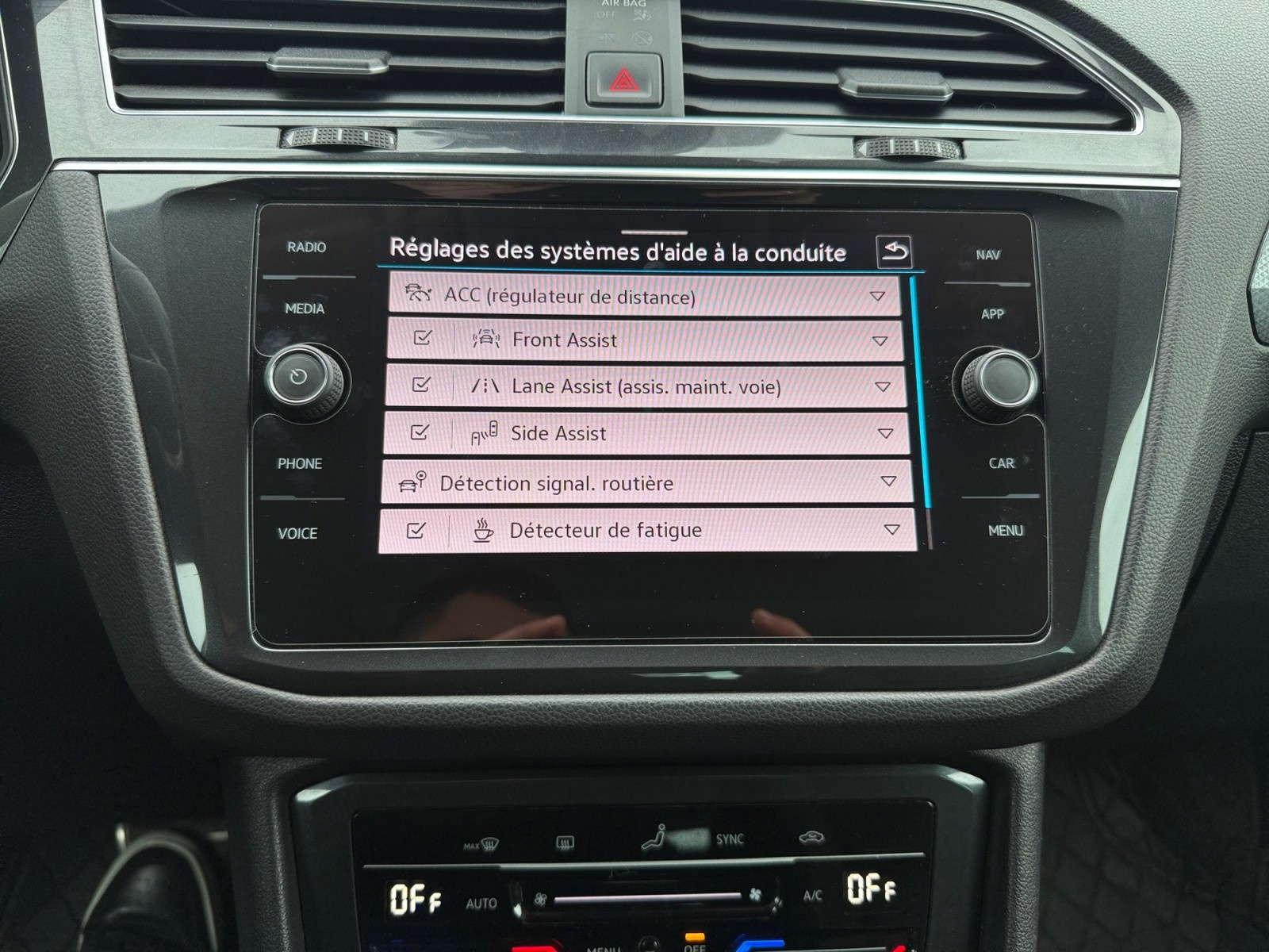 // Accoudoir arrière Accoudoir avant Aide au démarrage en pente Airbag conducteur Airbag genoux conducteur Airbag latéral conducteur et passager Airbag passager Airbags rideaux arrière Airbags rideaux avant Alerte de franchissement involontaire de lignes Allumage automatique des phares Android Auto Antidémarrage Apple CarPlay Assistant dynamique au maintien de voie Caméra de recul Climatisation automatique 3 zones Dispositif de recharge à induction Démarrage sans clé Détecteur actif d'angle mort Détecteur de fatigue Détecteur pluie Feux arrière LED Feux avant LED Feux de jour Feux de position à LED Filtre d'habitacle Frein de stationnement électrique Front Assist Hayon électrique Installation téléphone mains libres Jantes/roues en alliage léger 17 Keyless-go Kit de réparation pneus (Mobile Tyre) Limiteur de vitesse Line Assist Ordinateur de bord Radar de stationnement arrière Radar de stationnement avant Rampes/barres de toit Régulateur de vitesse adaptatif Rétroviseur conducteur réglable électriquement Rétroviseur intérieur électrochrome Rétroviseur passager réglable électriquement Rétroviseurs extérieurs dégivrants Rétroviseurs extérieurs rabattable électriquement Rétroviseurs extérieurs électriques Siège conducteur confort Siège conducteur à réglage lombaire Siège passager confort Siège passager à réglage lombaire Système de freinage d'urgence urbain Téléassistance USB jack Virtual cockpit Vitres teintées Volant avec palettes de changement de vitesses Volant en cuir Éclairage de sol