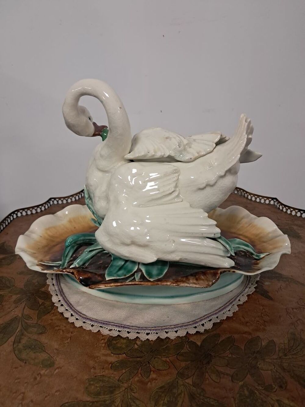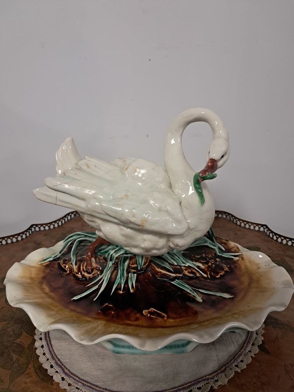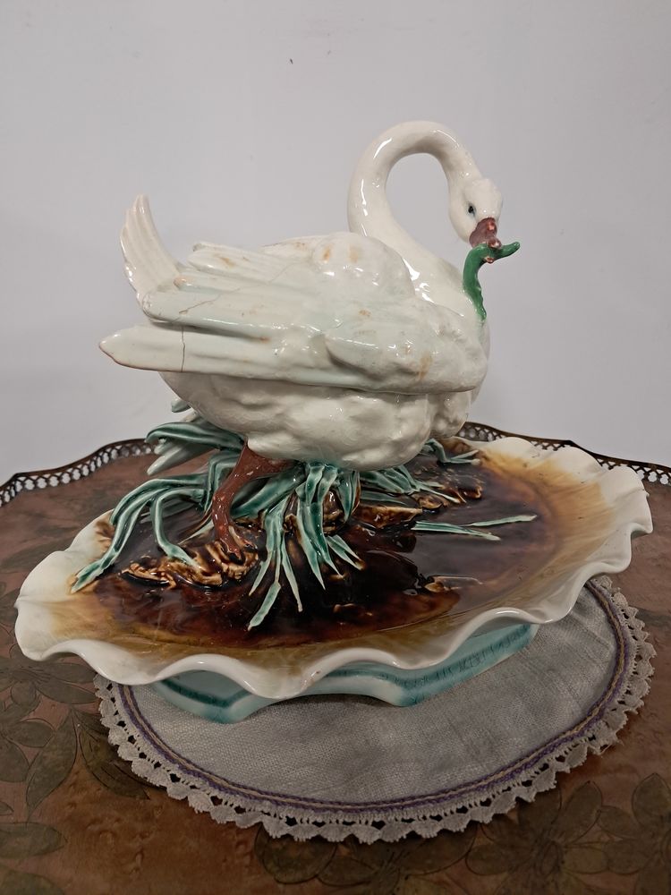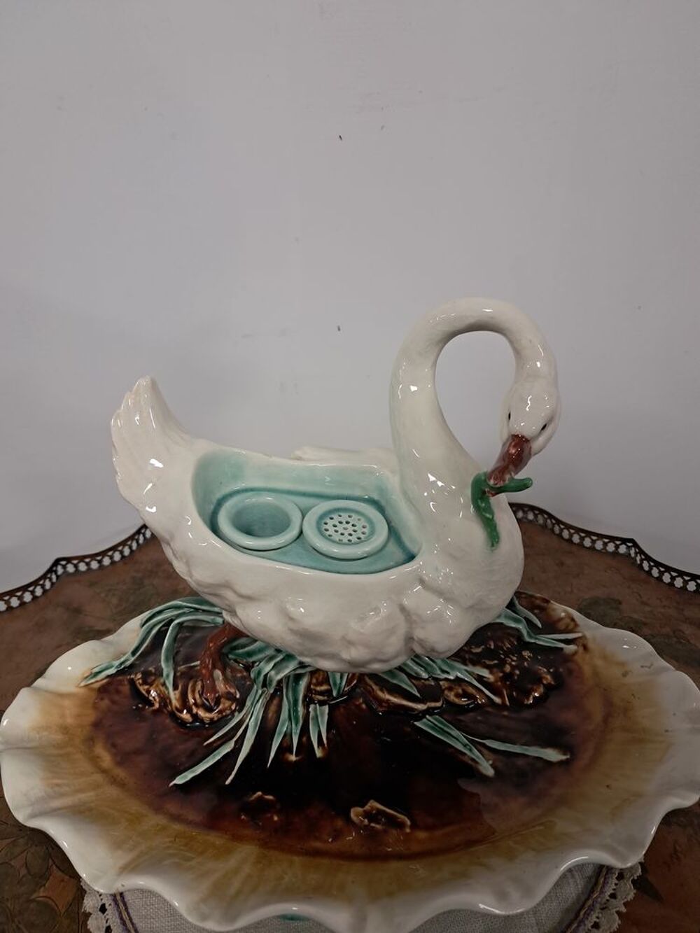 Bel encrier en faïence ancien possédant deux compartiments couverts sous l'aile, représentation d'un cygne mangeant un poisson, légère fissure recollée au niveau de l'aile.