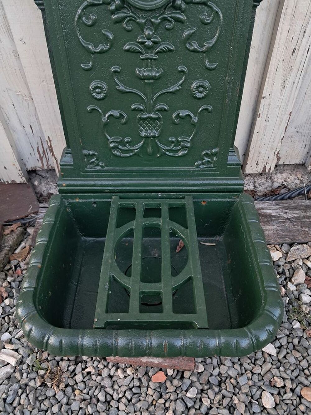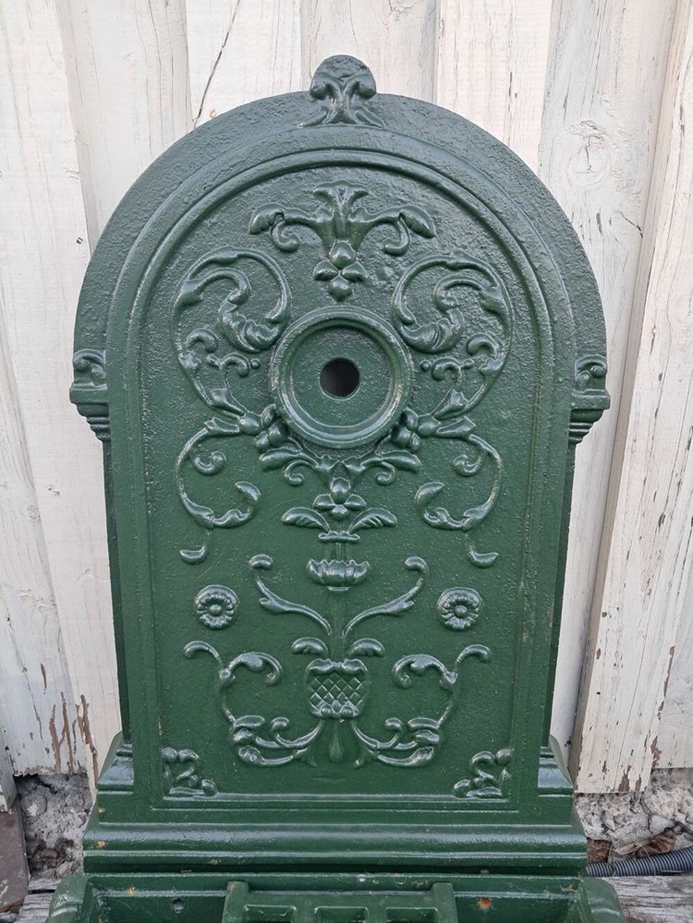 Fontaine murale décorée en fonte épaisse, réédition d'après un modèle ancien, constituée en deux parties, de couleur vert wagon.