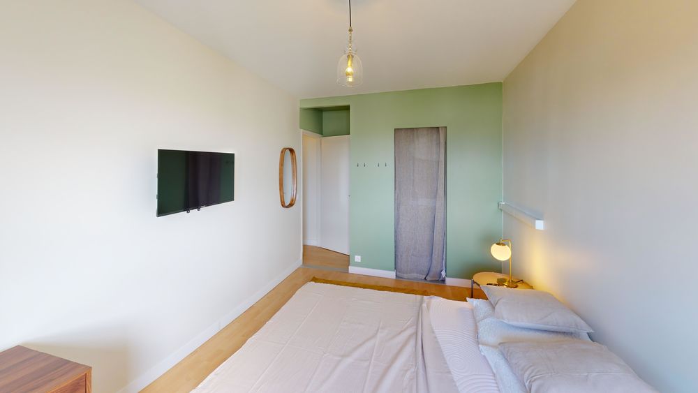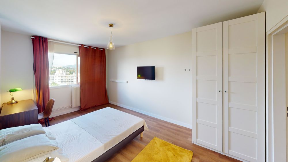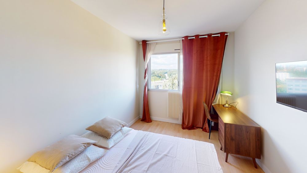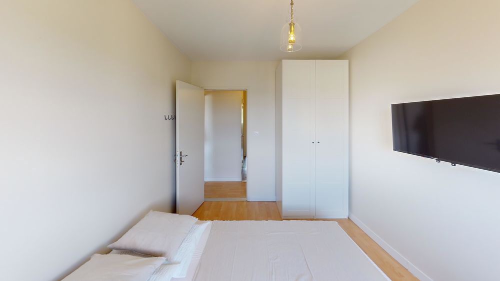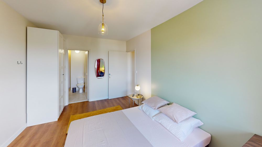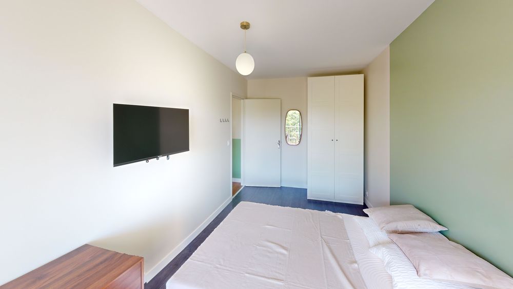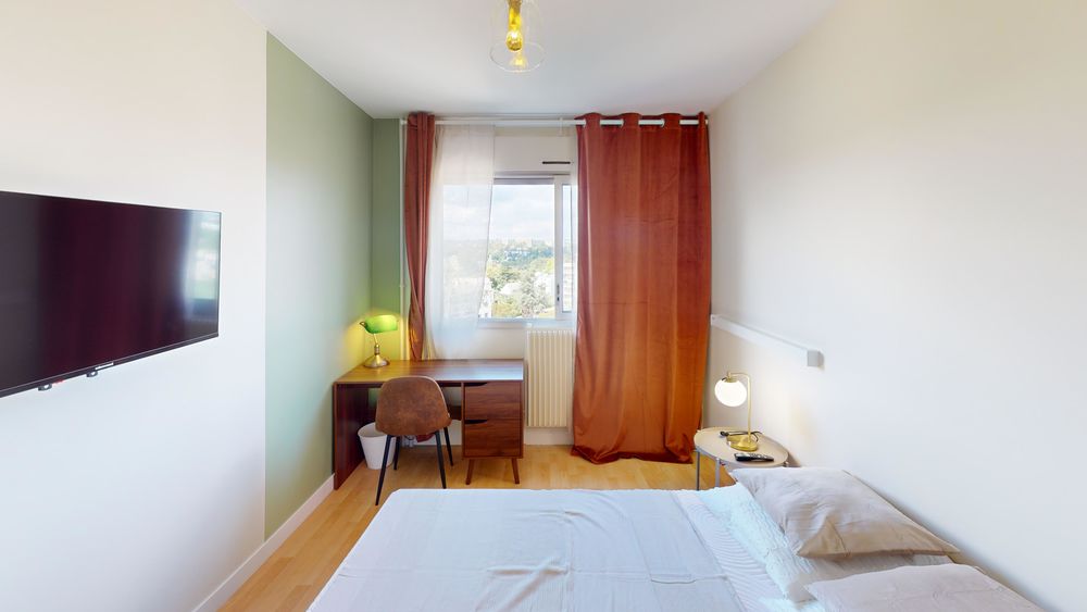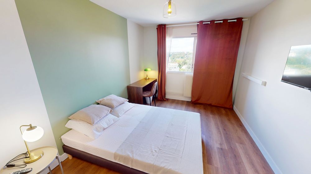 Votre chambre dispose de : 🛏️ un lit double 🪑 un espace bureau/chaise 🖥️ une télévision 👔 un dressing 🔑 une serrure pour sécuriser votre espace