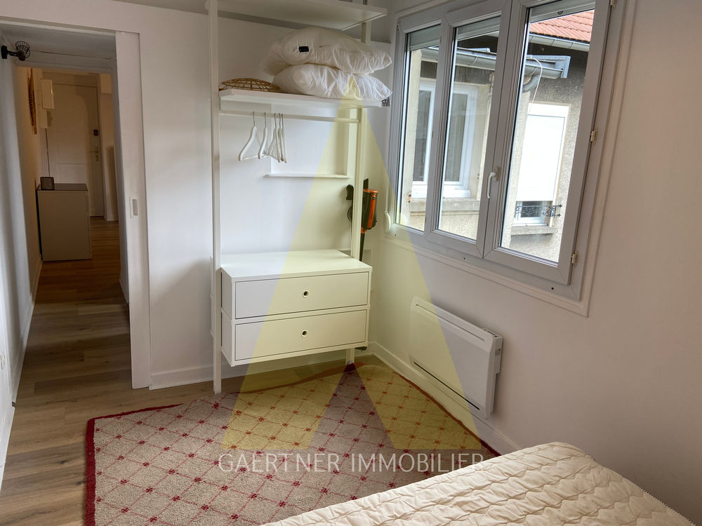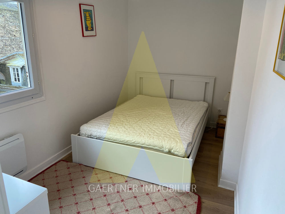 Appartement meublé de type 1 bis situé rue des Poissonniers, comprenant : un séjour avec cuisine ouverte, cuisine meublée et équipée (frigo, plaques, micro-ondes et lave-linge), une chambre avec lit double et rangement, puis une salle de bains avec wc.
