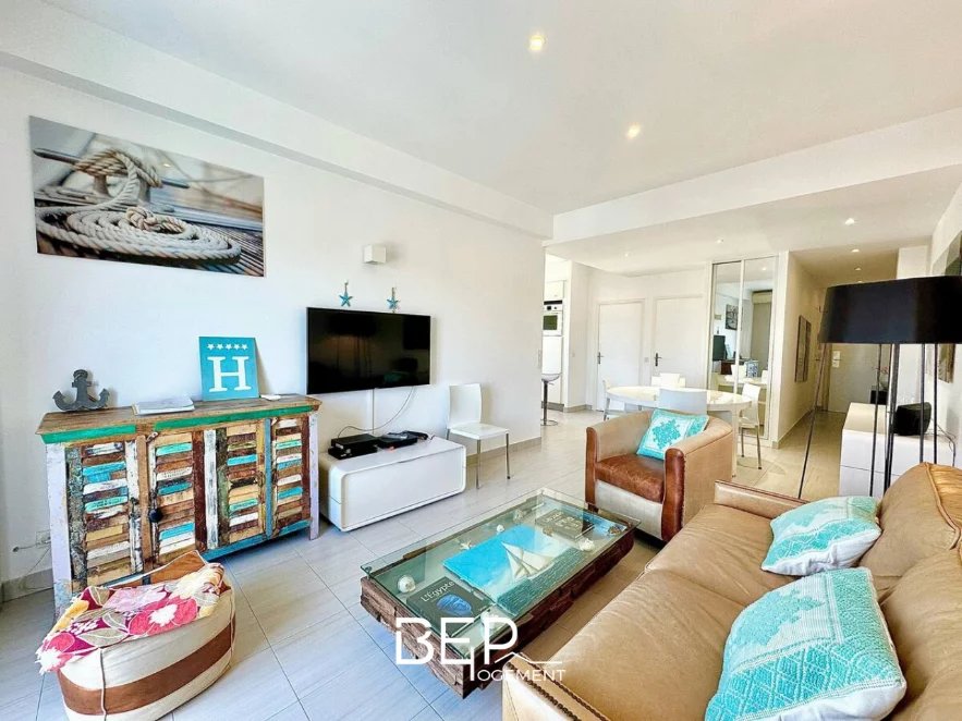 Le logement se compose d'un salon convivial avec un grand canapé convertible, une télévision 4K et un accès direct à un balcon offrant une vue spectaculaire sur la mer.