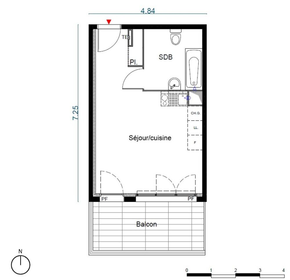 Appartement T1 de 28.78 m² avec un agréable balcon de 9.13 m². Il se compose d'une entrée, d'un séjour ouvert sur un coin cuisine équipé (évier, plaque de cuisson, hotte, meubles hauts) prolongé par l'extérieur et d'une salle de bains. Chauffage individuel gaz.