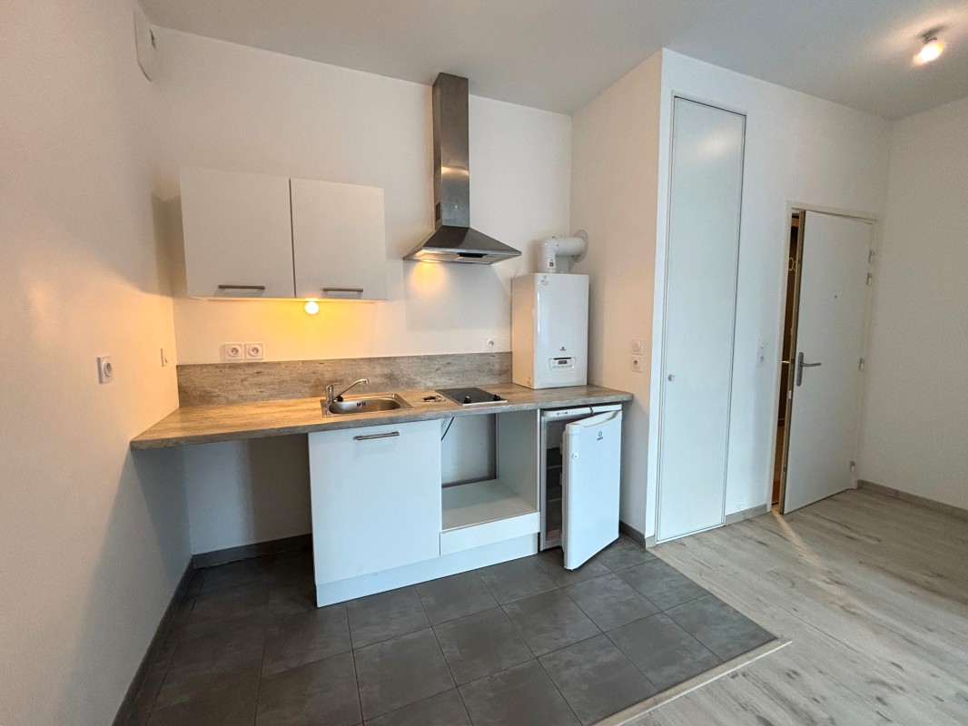 Appartement T2 de 41 m². Il se compose d'une entrée, d'une pièce de vie ouverte sur une cuisine équipée (évier, plaque de cuisson, hotte, meubles de rangement, plan de travail), d'une chambre et d'une salle d'eau (douche, meuble vasque, miroir, WC). Chauffage individuel gaz.