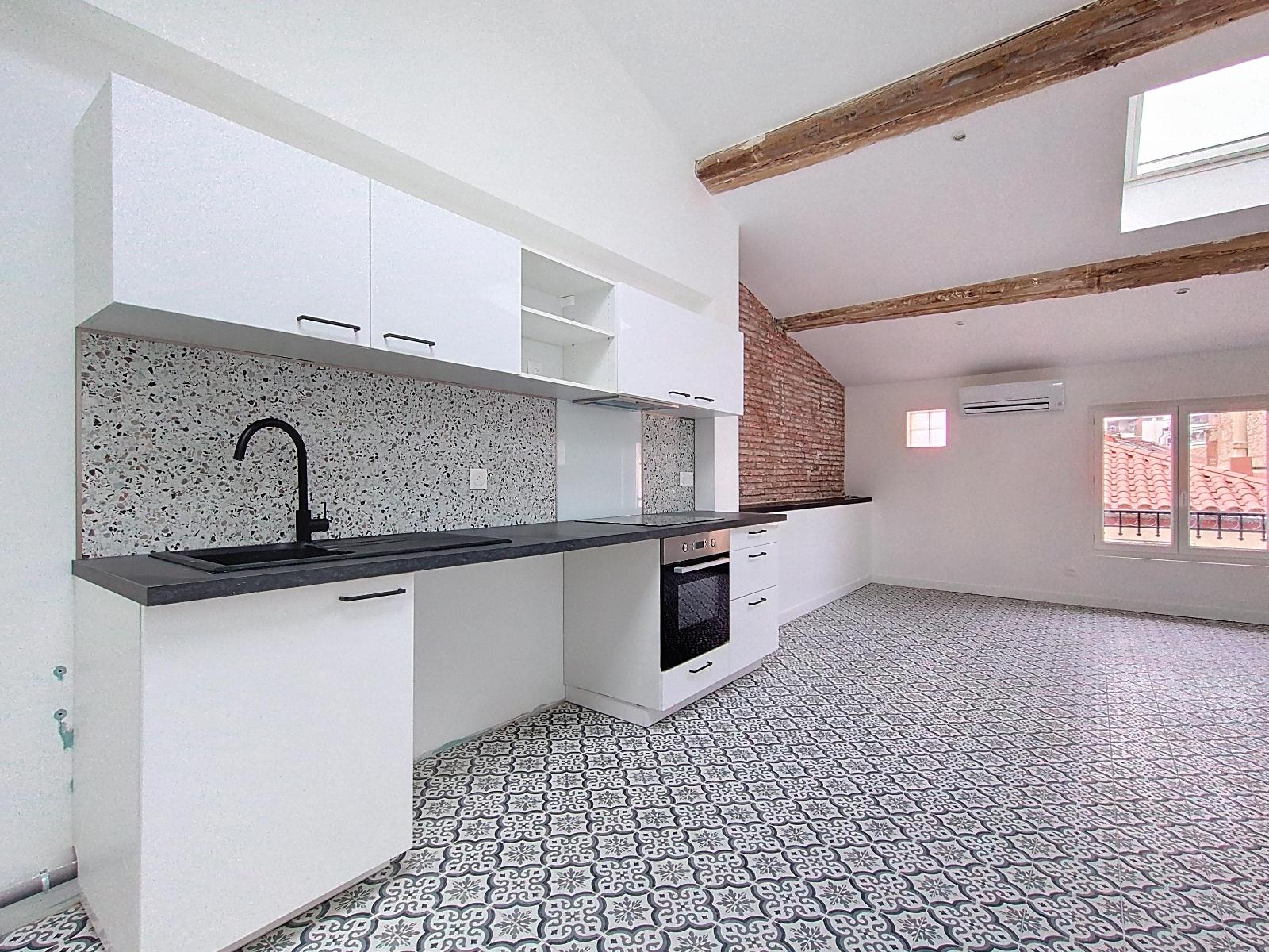 Perpignan centre - proche Castillet T2 climatisé à étrenner - Perpignan centre - A proximité du Castillet et des Galeries Lafayette, dans une petite rue calme et sans passage, ce T2 de 48 m² se trouve au 4ème et dernier étage d'un petit immeuble de quatre logements. Grand séjour très lumineux avec cuisine ouverte et équipée (plaque de cuisson et hotte), une chambre confortable et une salle d'eau avec WC. Entièrement rénové avec des matériaux de qualité, il bénéficie de belles prestations et d'une climatisation réversible. Pas d'honoraires. Disponible immédiatement. Loyer de 690,00 euros par mois charges comprises dont 20,00 euros par mois de provision pour charges (soumis à la régularisation annuelle). Les honoraires charge locataire sont de 2,00 euros ( soit 0,04 euros/m² ) dont 1,00 euros pour état des lieux ( soit 0,02 euros/m² ). Montant estimé des dépenses annuelles d'énergie pour un usage standard : entre 450 et 650 euros. Prix moyens des énergies indexés en 2023.