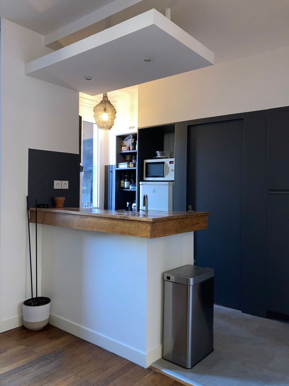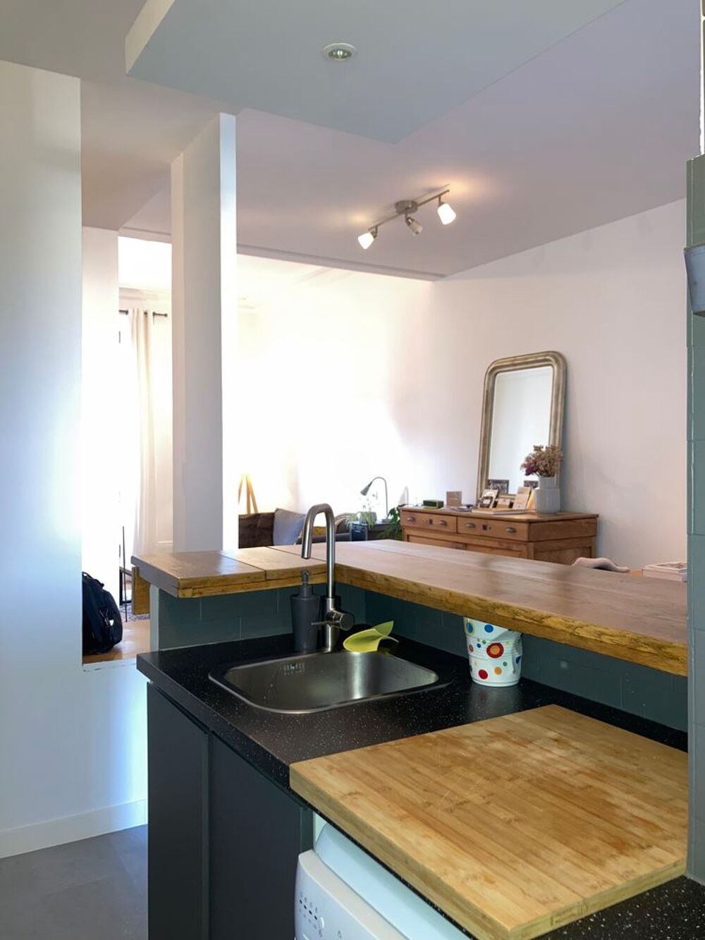 -Cuisine équipée (placards, plaque de cuisson, hotte, four), semi ouverte sur grand séjour.
