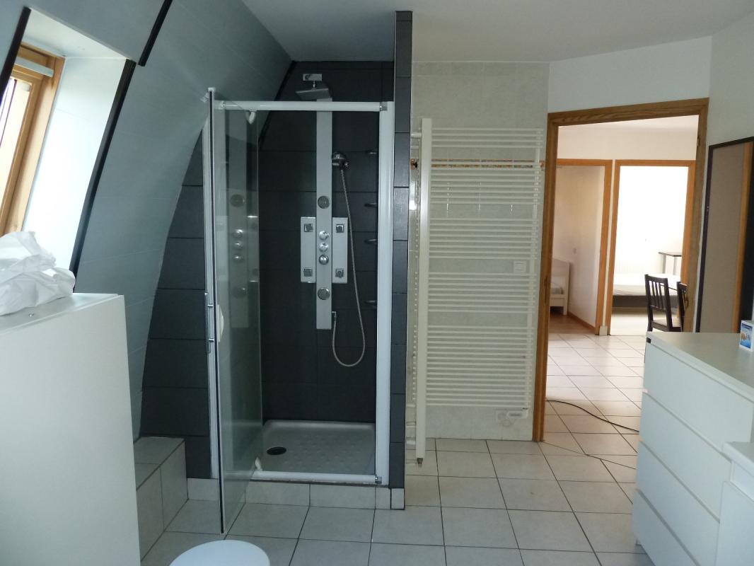 À louer : appartement meublé de type T5 situé au premier étage d'une maison. Il comprend une cuisine séjour, un salon, trois chambres, une salle d'eau, un WC séparé, un garage et un grenier.Chauffage au fioul